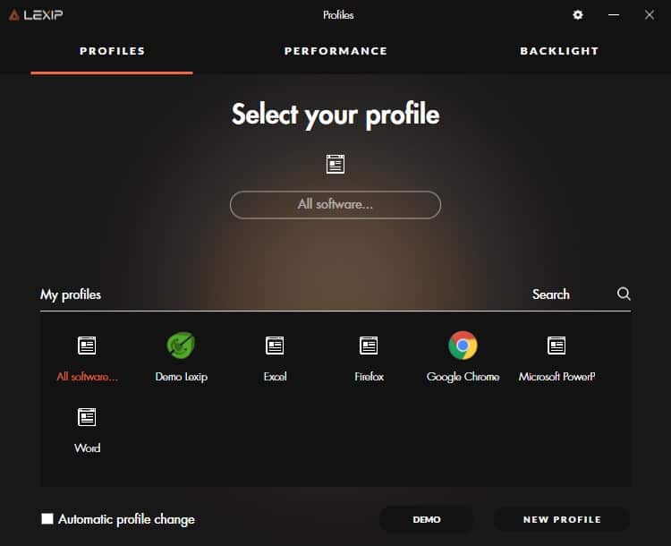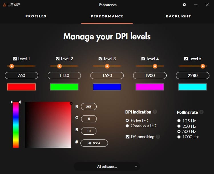 Die Software von Lexip unterteilt sich in drei Bereiche. Der erste Bereich dient dazu, verschiedene Profile für unterschiedliche Programme festzulegen. So kann man für Minecraft ein anderes Erscheinungsbild festlegen, als für LoL, und gleichzeitig die DPI-Einstellungen anpassen. Dies sind nämlich auch die anderen Einstellungsbereiche. Der Bereich, um die DPI einzustellen, gibt zusätzlich auch die Möglichkeit, zur einfacheren Erkennung, die LED-Farben kurzzeitig zu überschreiben. Hier kann man sich die Farben der insgesamt 5 Level selbst festlegen. Des Weiteren lässt sich die Abfragerate zwischen 125, 250, 500 und 1000 Hz einstellen.