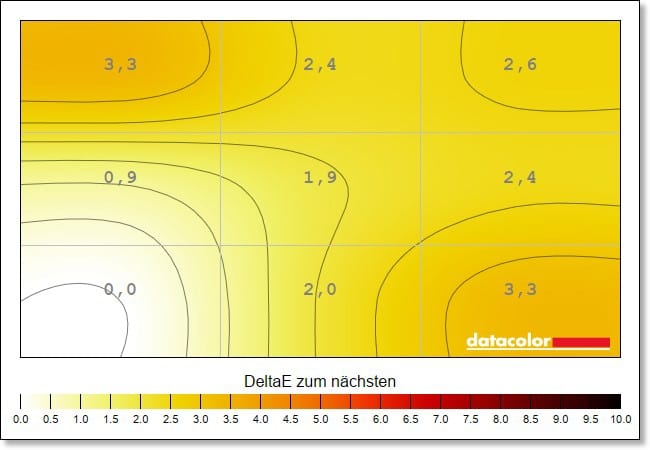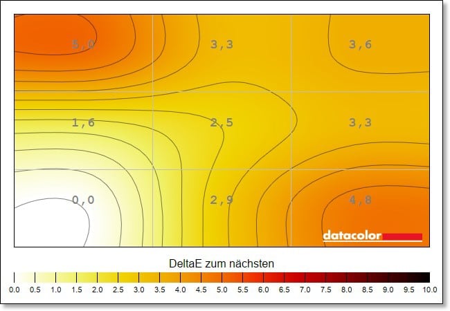 Hinsichtlich der Farb-Homogenität, also der Gleichmäßigkeit der Farbverteilung, rangiert der LG-Monitor auf gutem Niveau. Vor allem in der linken oberen und rechten unteren Ecke zeigen sich allerdings Abweichungen von DeltaE 5,7 beziehungsweise 5,4, die sich verringern, wenn man die Helligkeit etwas herunterregelt.