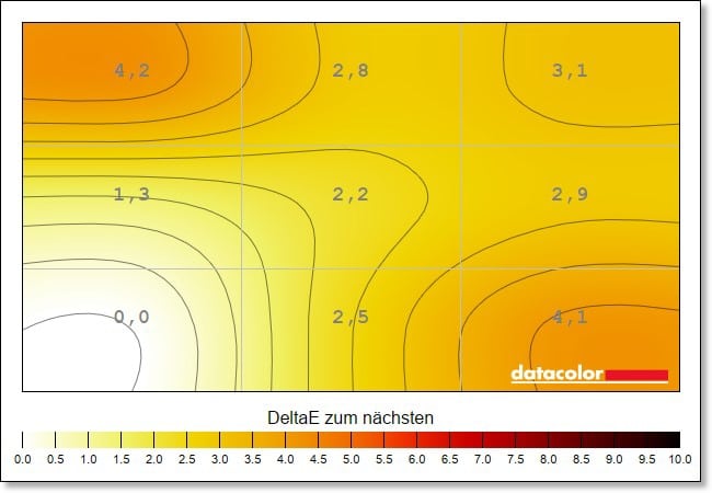Das klingt nun allerdings drastischer als es ist. Abweichungen von DeltaE 10 sind hier keinesfalls selten und auch schnelle Gaming-Monitore wie der AOC Agon AG405UXC (unser Test) kommen auf höhere Abweichungen.