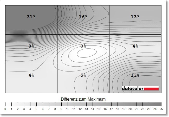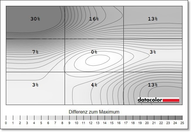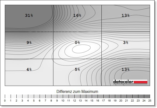Das bedeutet, dass du bei einer Einstellung von 100 % Helligkeit in der Mitte (das Maximum) auf 249,1 cd/m² kommst, das Bild in der oberen linken Ecke mit 174,1 cd/m² hingegen deutlich dunkler ausfällt und Details verloren gehen.