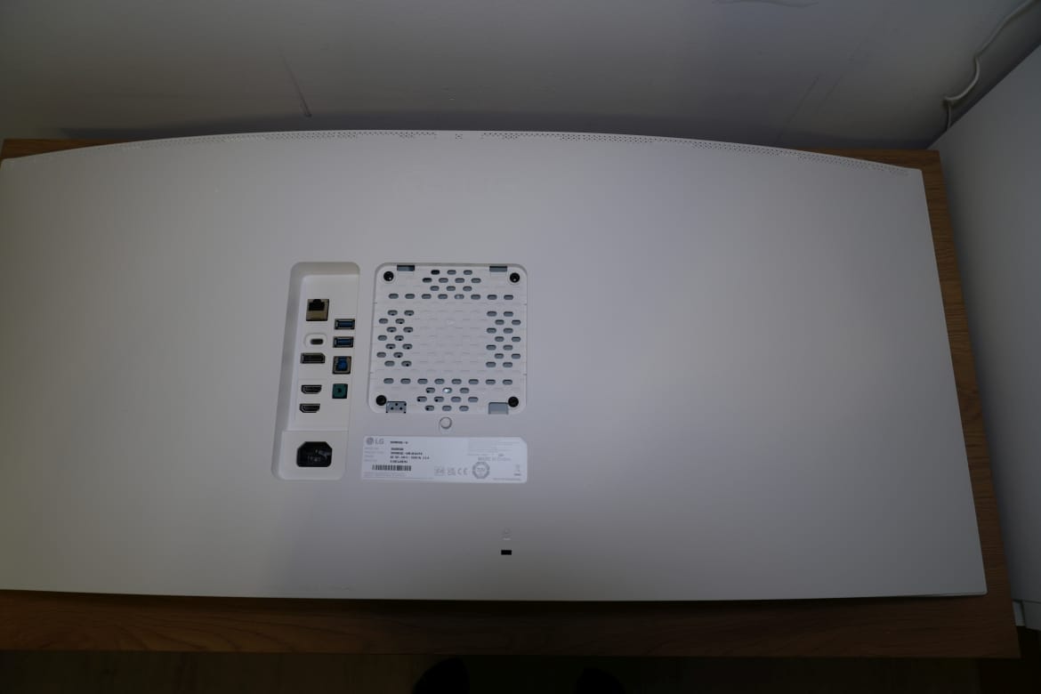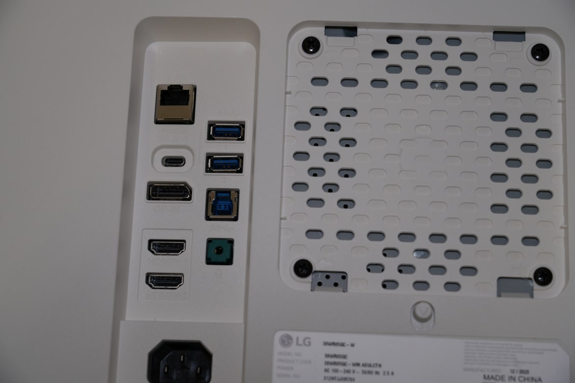 Der LG 38WR85QC-W integriert die meisten Anschlüsse recht mittig an seiner Rückseite, was ich nicht für die ideale Lösung finde. Denn dadurch stehen die Kabel im rechten Winkel aus dem Gehäuse hervor, während die Ports kaum mehr zu erreichen sind, wenn der Monitor einmal an Ort und Stelle steht.
