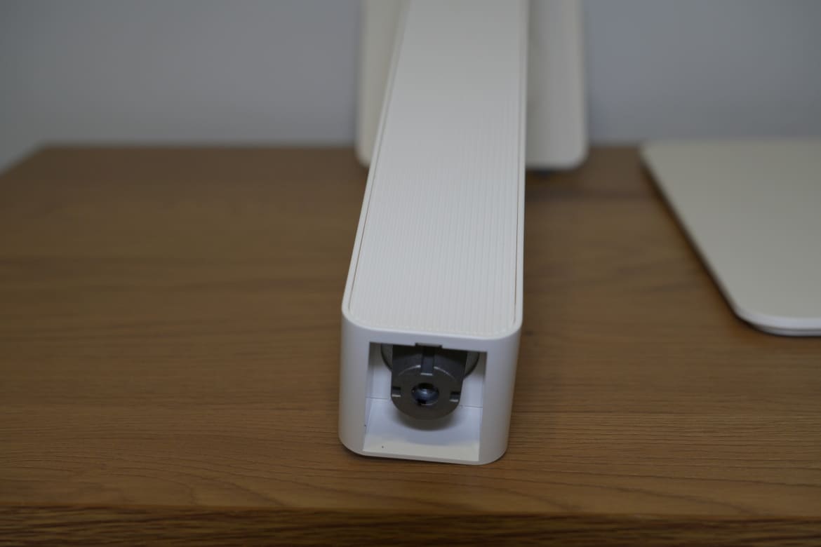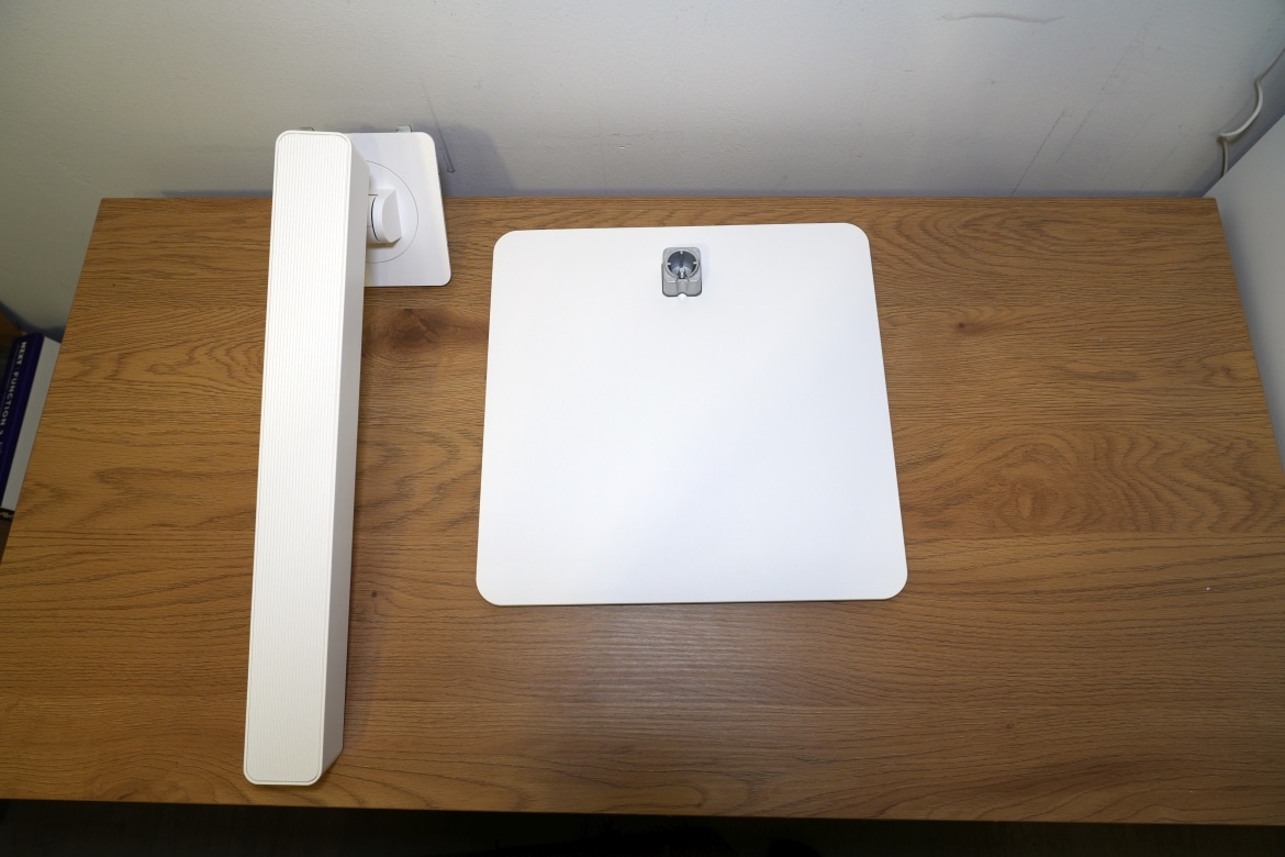 Was dabei sofort ins Auge springt, ist der vergleichsweise riesige Standfuß. Dieser ist quadratisch aufgebaut und kommt auf eine Breite und Tiefe von von 30,7 cm und bietet damit genügend Platz, um eine Maus und eine TKL-Tastatur darauf abzulegen. Dafür ist er mit einer Höhe von 0,9 cm angenehm flach gehalten und bietet dank vier gummierter Standfüße einen sicheren Halt.