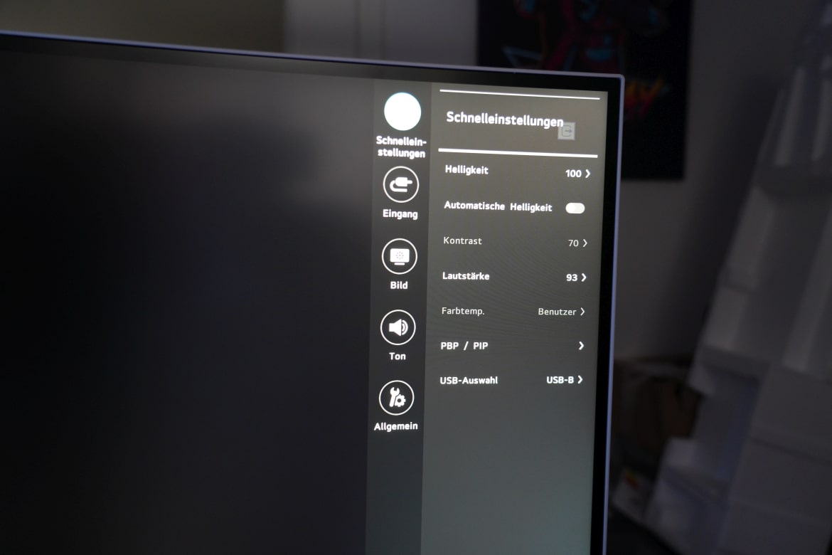 Sehr gut gefallen mir das On-Screen-Display und die allgemeine Bedienung des LG 38WR85QC-W. Das Menü ist klar strukturiert und übersichtlich aufgebaut und erstreckt sich auf einen Streifen über die volle Höhe auf der rechten Seite des Bildschirms.