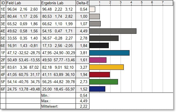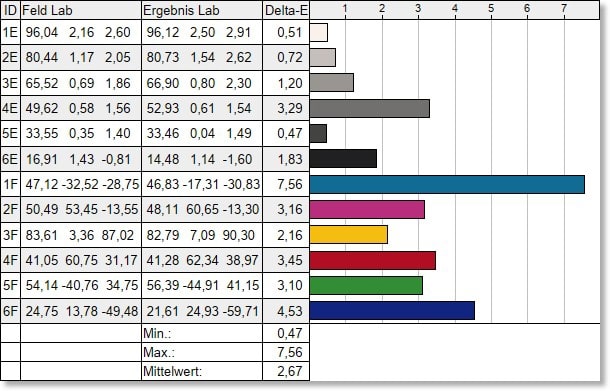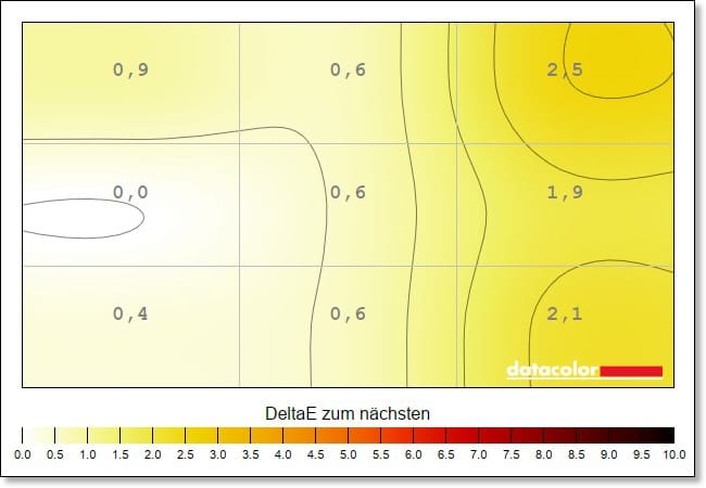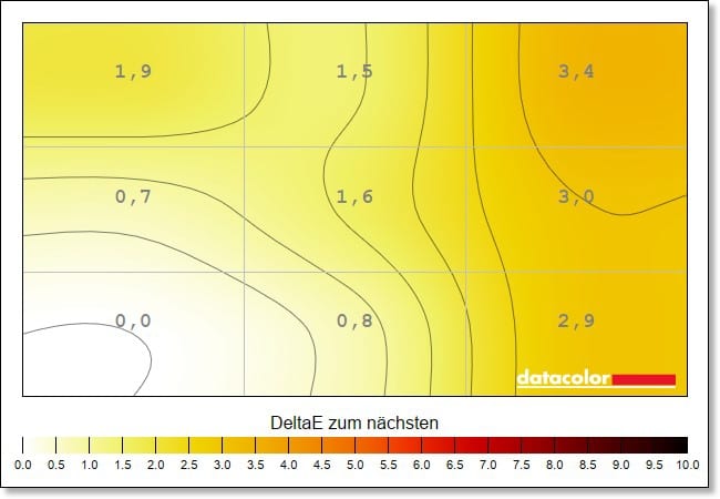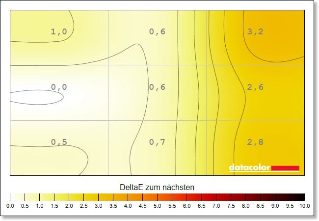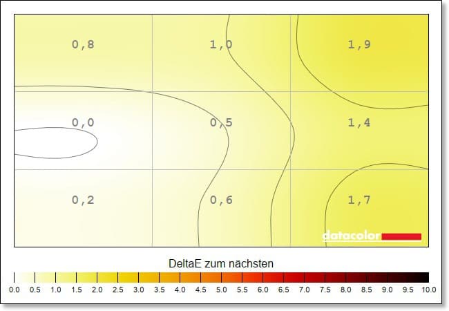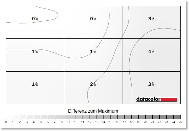 Im Bereich der Farb-Homogenität, also der Gleichmäßigkeit der Farbverteilung, zeigt der LG-Monitor ein sehr gutes Ergebnis. Wobei die Abweichung von maximal 3,4 Prozent bei voller Helligkeit. ebenfalls merklich über der der aktuellen QD-OLED-Generation liegt.