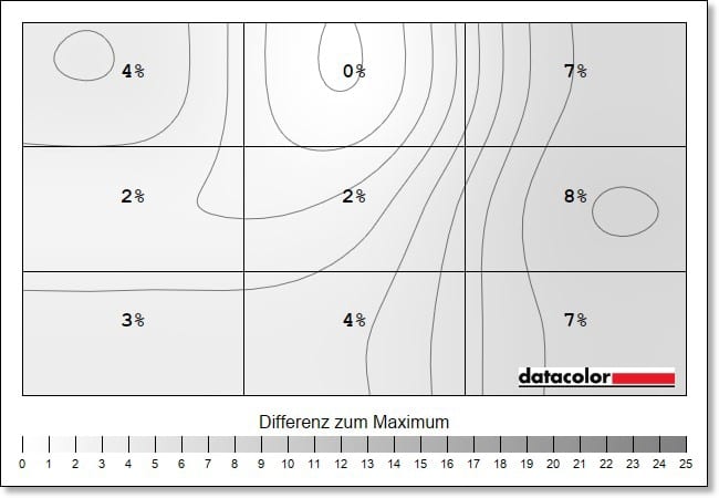 Recht ausgeglichen zeigt sich der LG-Monitor bei der Luminanz-Homogenität, wobei auch hier bei 50 Prozent Helligkeit Abweichungen von bis zu 8 Prozent gemessen werden. Dennoch liegt man hier auf Augenhöhe mit den besten OLED-Displays, während IPS-Panels teilweise Abweichungen von 20 Prozent und mehr aufweisen.