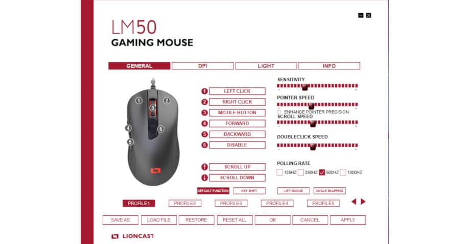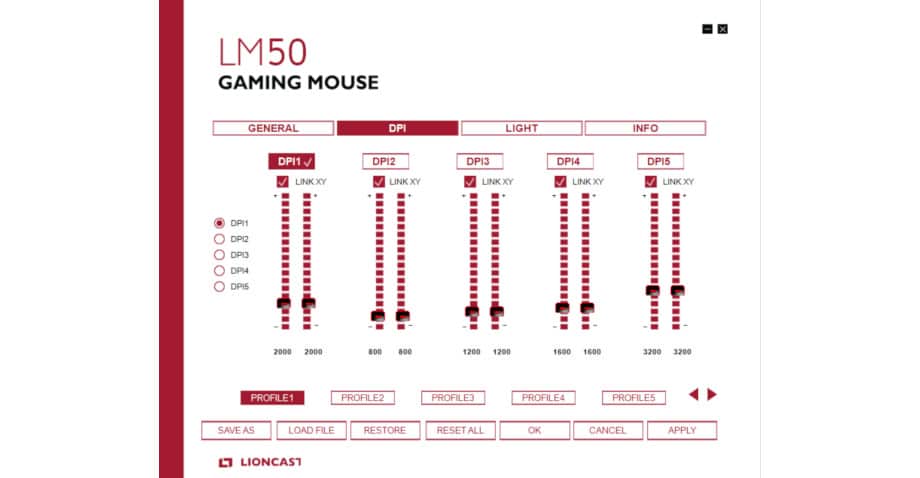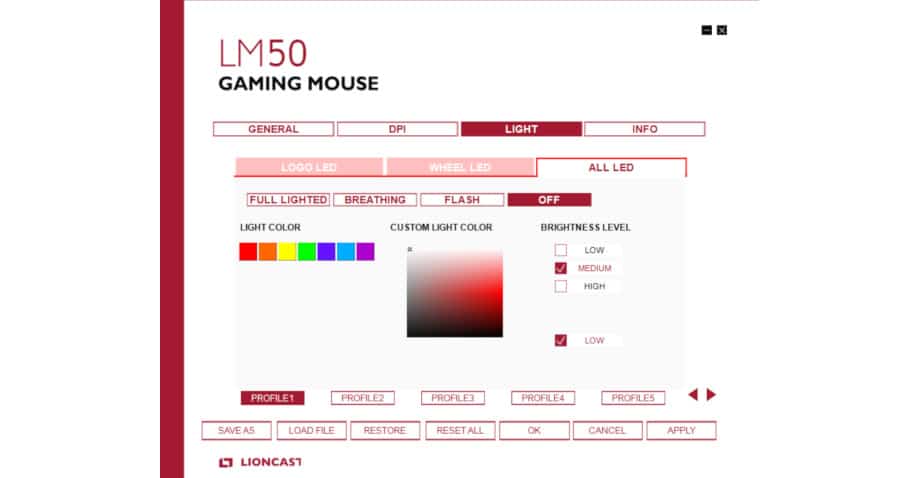 Neben den auch bei anderen Mäusen vorhandenen DPI-Einstellungen, kann bei der Lioncast LM50 auch die RGB-Beleuchtung individualisiert werden. Insgesamt lassen sich fünf Profile speichern, die sich danach auch ohne die Software direkt über die Maus wechseln lassen.