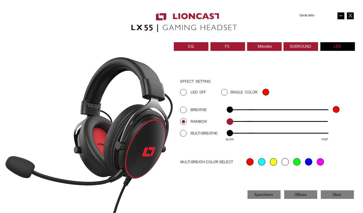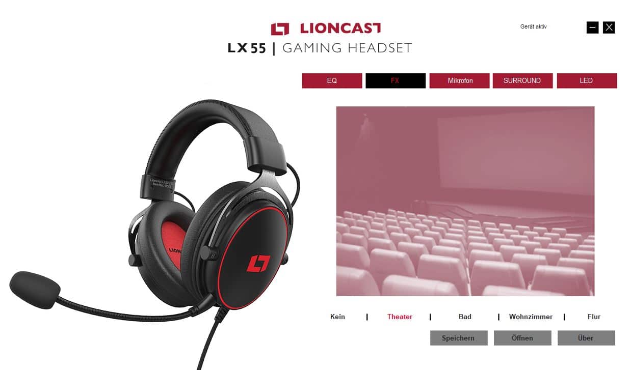 Auf den ersten Blick wirkt das LX55* schlicht und zeigt, bis auf die Lioncast Logos, keinerlei Schnickschnack. Das gesamte Headset ist in schwarz gehalten, nur das Innere der Ohrmuschel erstrahlt in Rot und trägt die Aufschrift Lioncast. Von dem gepolsterten Kopfband bis zu den großen ovalen Hörmuscheln die sich elegant in die Haltebügel schmiegen, ergibt alles ein stimmiges Bild. Abgerundet wird das Ganze von einer RGB-LED-Beleuchtung der Logos und eines Rings um die Ohrmuschel.