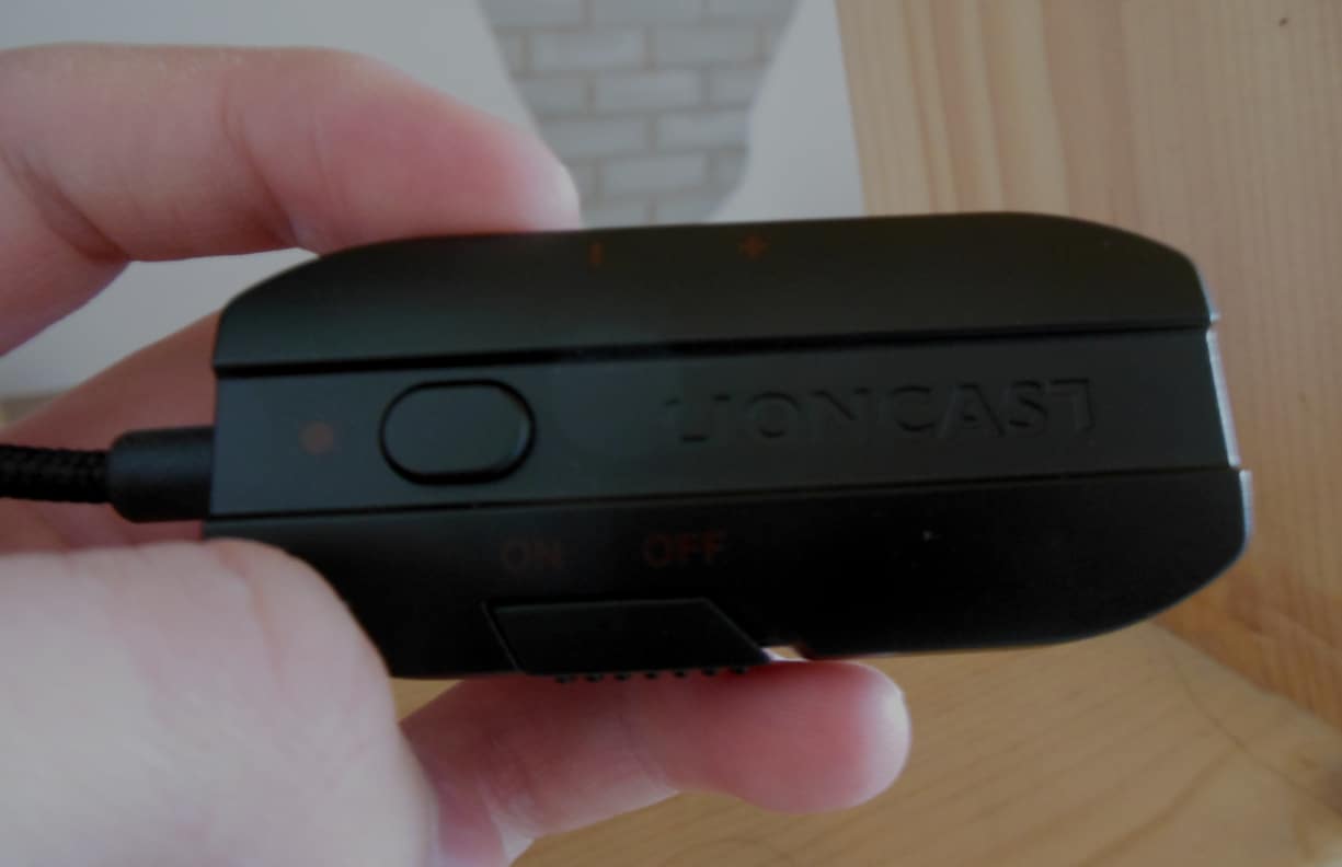 Am anderen Ende des ungefähr 30 cm langen Kabels befindet sich ein kompaktes Kunststoffkästchen, ebenfalls fest attachiert. Es übernimmt die Funktion der Soundkarte und bietet ein Scrollrad zur Lautstärkeregulierung. Durch einen Schalter an der Seite kann das Mikrofon stummgeschaltet werden, was dieses durch das Aufleuchten einer roten LED in seiner Spitze quittiert. Die Taste an der Front, oberhalb des eingravierten „Lioncast“-Schriftzugs, schaltet die RGB-Beleuchtung ein und aus.
