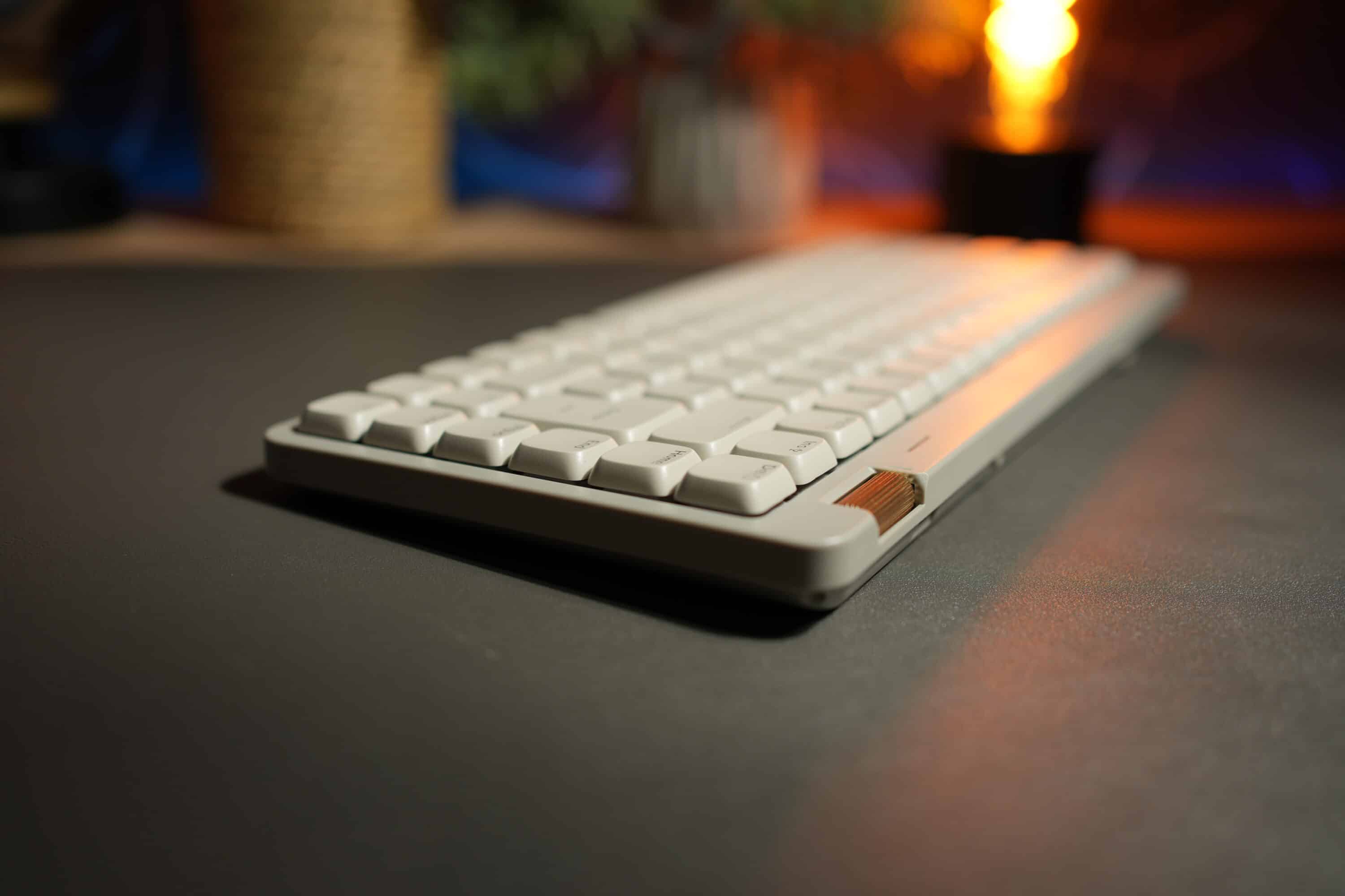 Na wie dem auch sei. Die Lofree Flow Lite ist eine flache Tastatur im modernen 75-Prozent-Layout. Sie bietet also eine F-Tastenreihe und Zusatzbuttons auf der rechten Seite. Unser Testmodell kommt in der ansprechenden Farbgebung „Marble“ daher, die einen etwas dunkleren Beige-Ton aufzeigt.