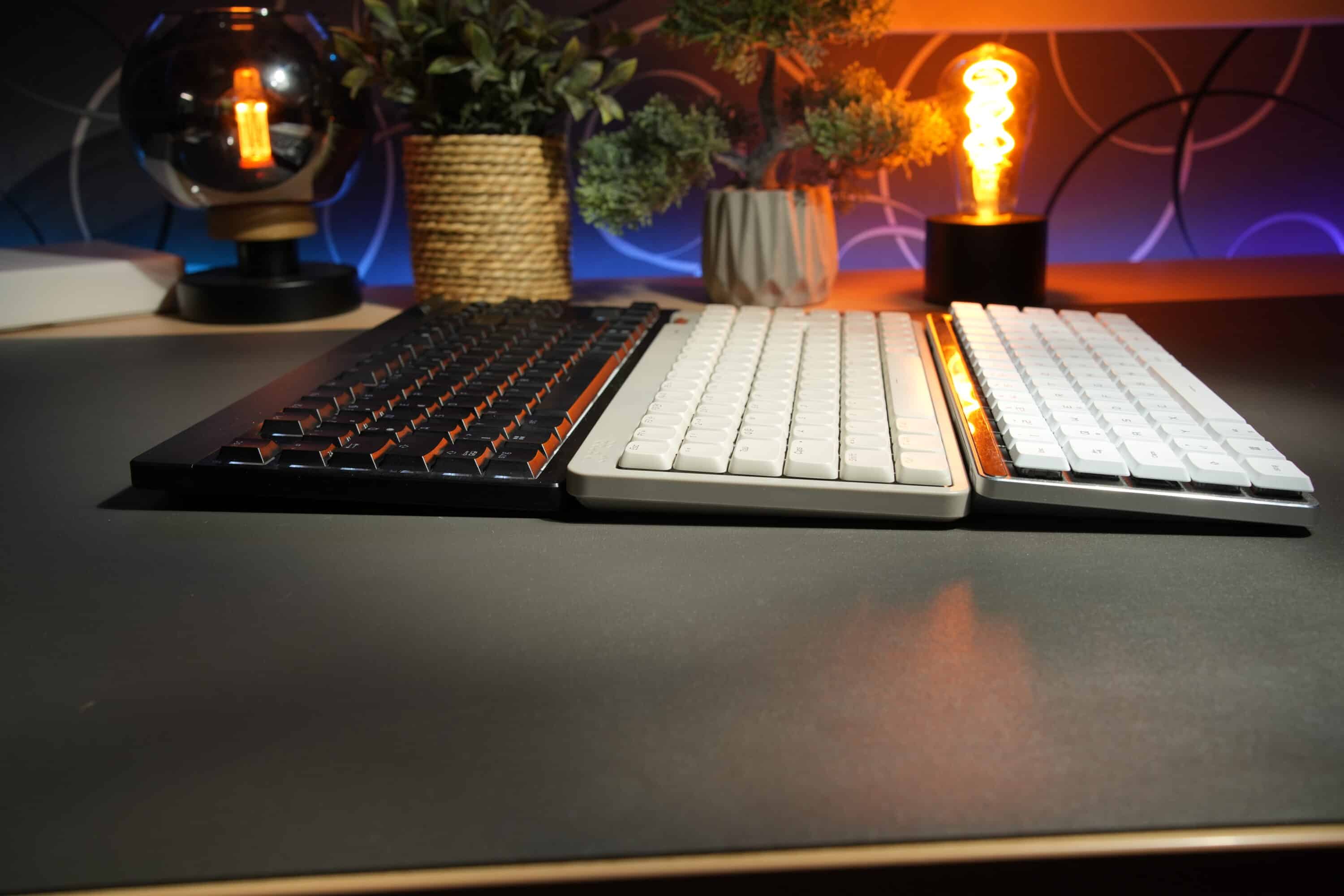 Wie kompakt die Lofree Flow Lite ist, zeigt sich im direkten Vergleich mit anderen Low-Profile-Tastaturen. Hier habe ich einerseits die ASUS ROG Falchion RX Low Profile zum Vergleich herangezogen und andererseits die erst kürzlich veröffentlichte Razer BlackWidow V4 Low-Profile (unser Test) bemüht.