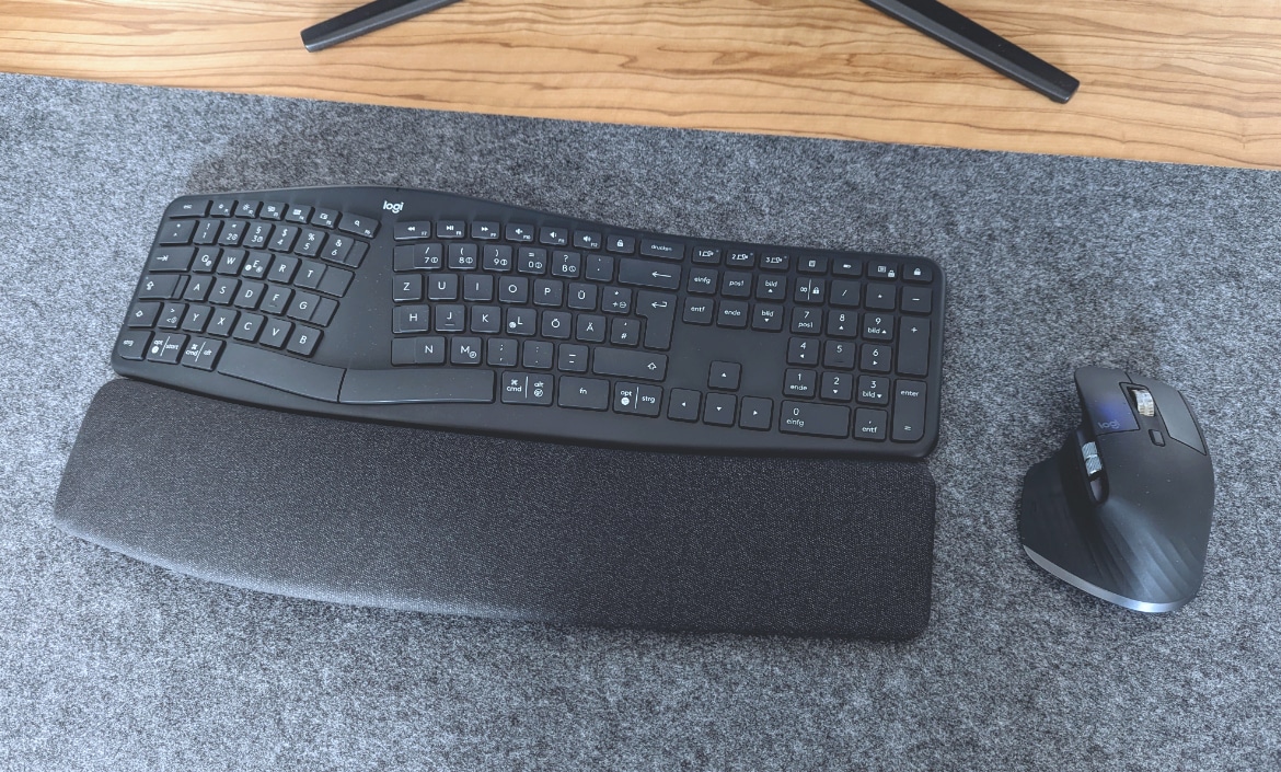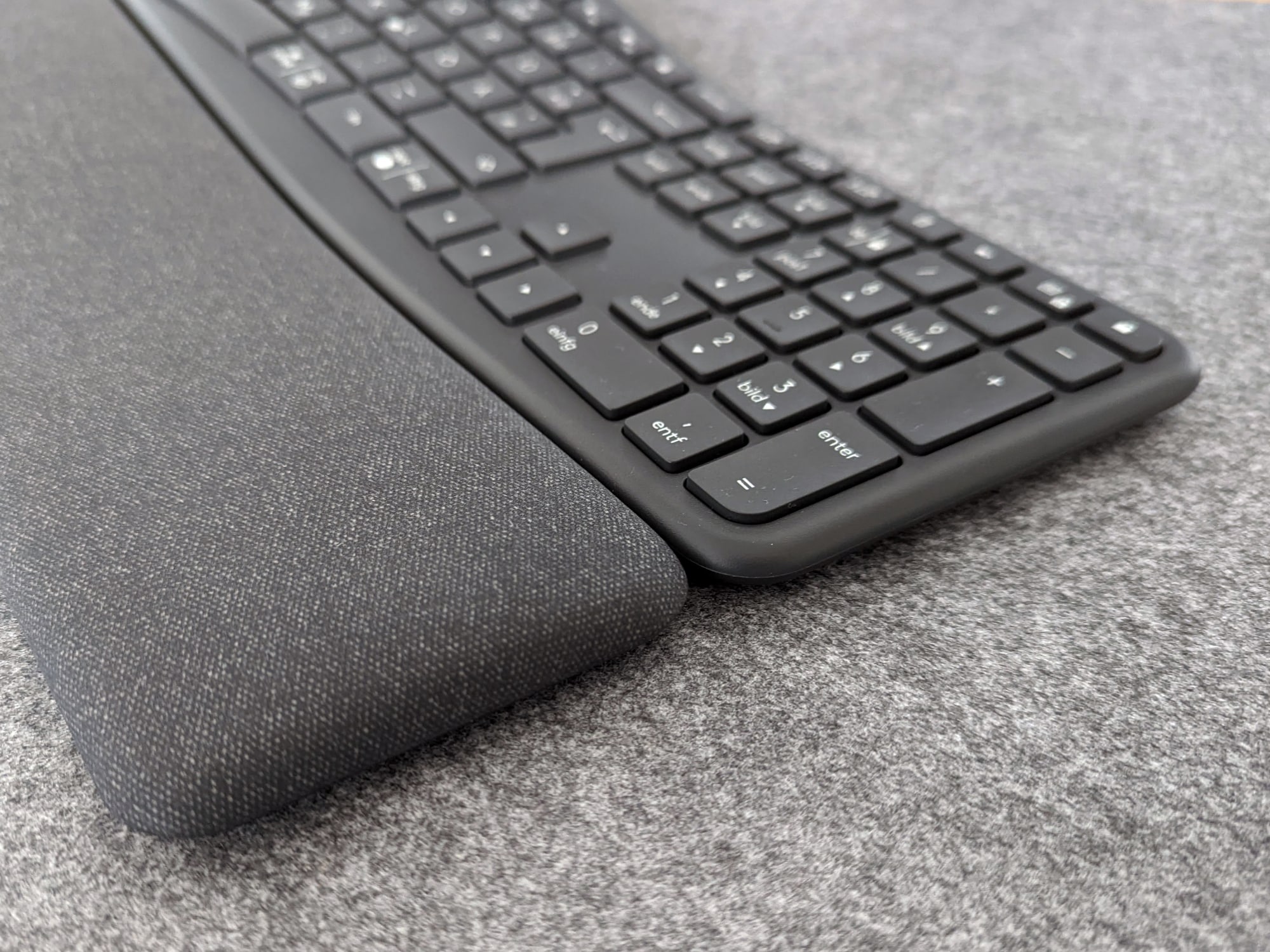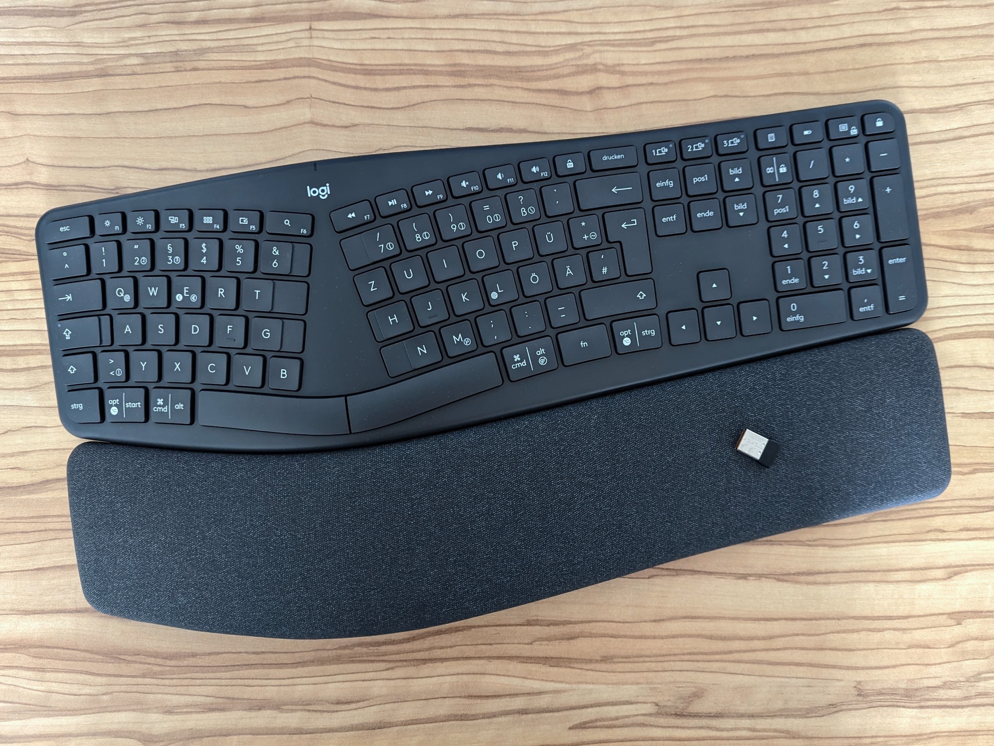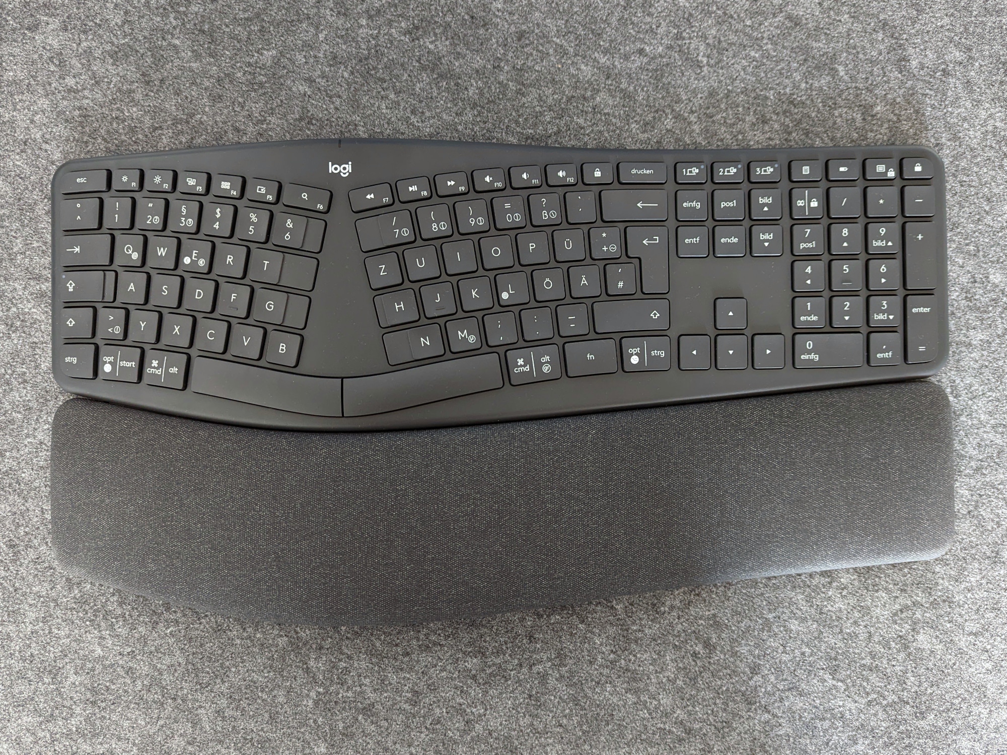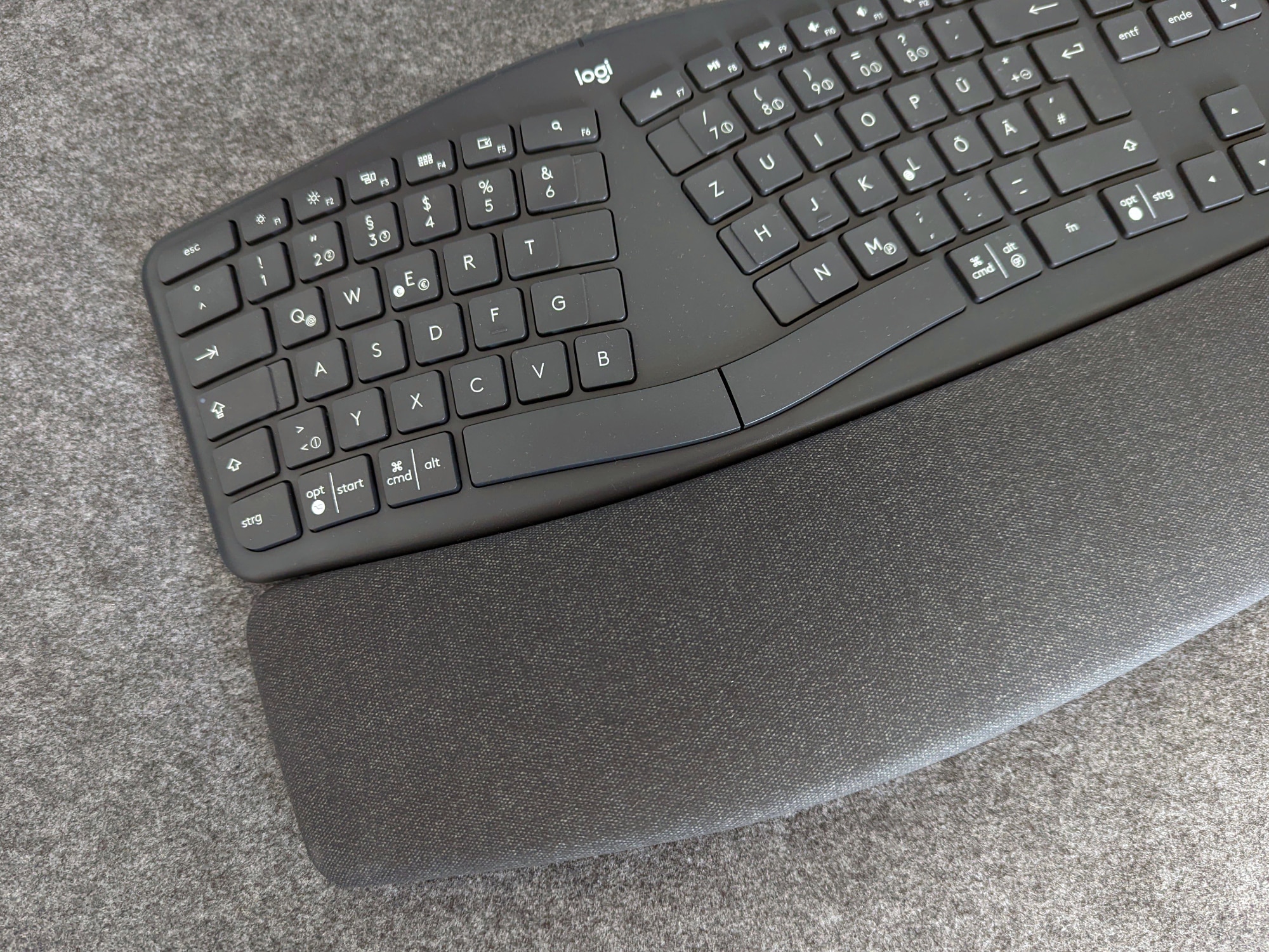 Das Schreiben selbst war auch über längere Zeit sehr angenehm und man merkt, dass die Tastatur auf Ergonomie ausgelegt ist. Der Unterschied zu anderen Tastaturen ist spürbar und macht sich vor allem beim Wechsel zwischen zwei Modellen bemerkbar. Auch die sehr großzügig dimensionierte Handgelenkauflage trägt zur Ergonomie bei und ist auch zum Ende des Arbeitstages hin noch sehr bequem. Das Tippgefühl weiß ebenso zu gefallen, der Druckpunkt und die Haptik der Tasten reichen jedoch nicht an die bereits genannte MX Keys aus Logitechs Master-Serie heran.