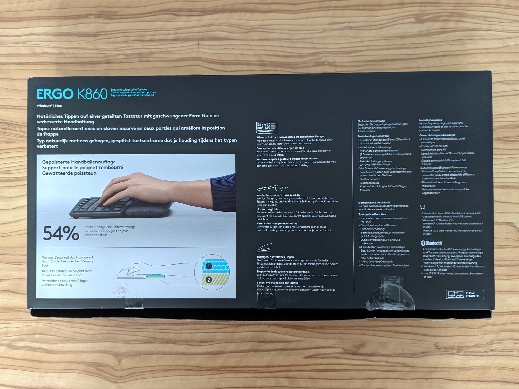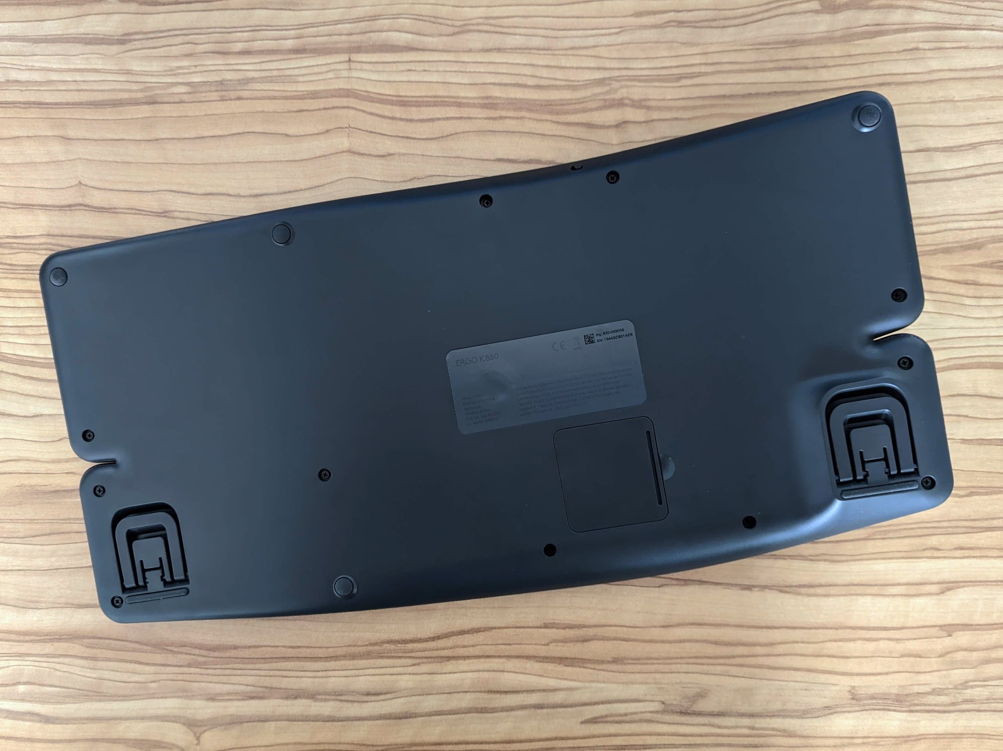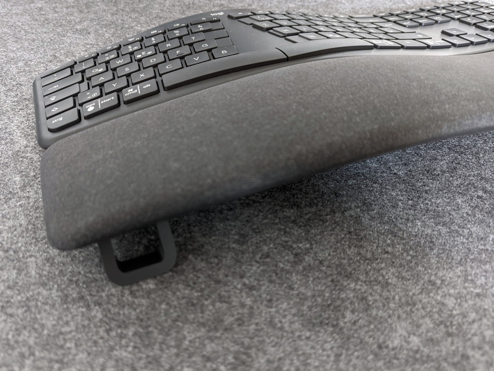 Die Höhe der Logitech Ergo K860 variiert durch die geschwungene Form deutlich, die höchste Stelle befindet sich dabei zwischen den beiden Händen. Während die Hände bei einer herkömmlichen Tastatur eingedreht werden, führt die geschwungene Form zu einer natürlicheren Haltung der Hände und Arme. Die Belastung der Muskeln und des Handgelenks wird dadurch deutlich reduziert. Mit Hilfe von, in einem Winkel von 0, -4° oder -7°, ausklappbaren Füßen lässt sich die Position der Handgelenke zudem nochmals verbessern. Die eher größer dimensionierte Handgelenkauflage besteht aus einer Oberflächenschicht aus Textil, einer stützenden Schicht aus dichtem Schaumstoff, einer Komfortschicht aus Memory Foam und ist fest mit der Tastatur verbunden ist.