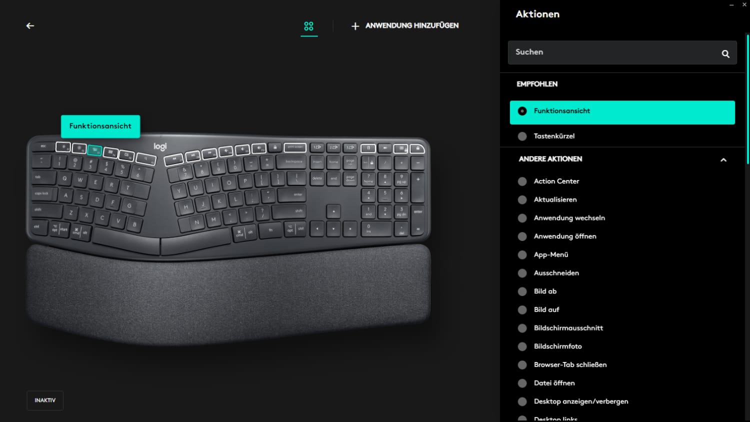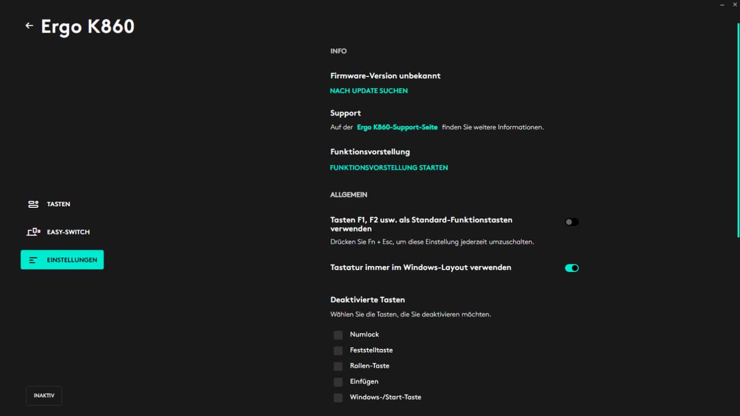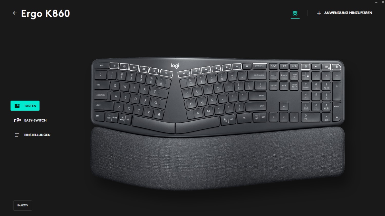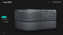 Die Ergo K860 wird von Logitechs aktueller Software Logi Options+ unterstützt. Innerhalb der Software kann man Tasten neu belegen, entweder global oder auch für einzelne Programme, bestimmte Tasten deaktivieren oder auch zwischen den Standard-Funktionstasten und Logitechs Optionen, wie z. B. dem Ändern der Helligkeit oder der Lautstärke, wechseln. Die Art der Verbindung und der Akkustand sind ebenfalls in der Software ersichtlich. Weiterhin unterstützt die Ergo K860 Easy Switch, welches das gleichzeitige Pairing mit bis zu drei Computern und den schnellen Wechsel per Tastendruck ermöglicht.