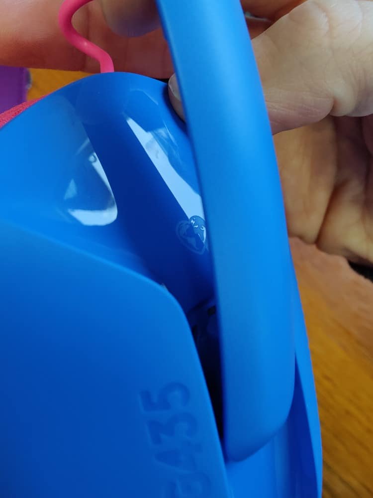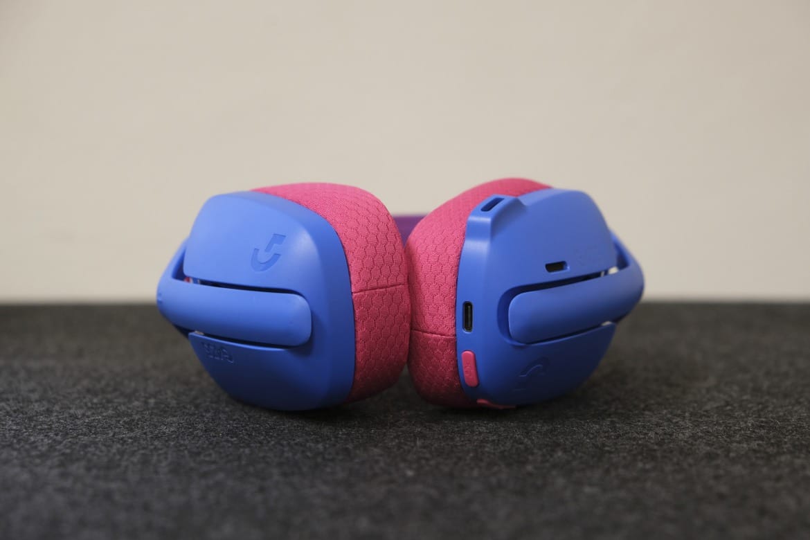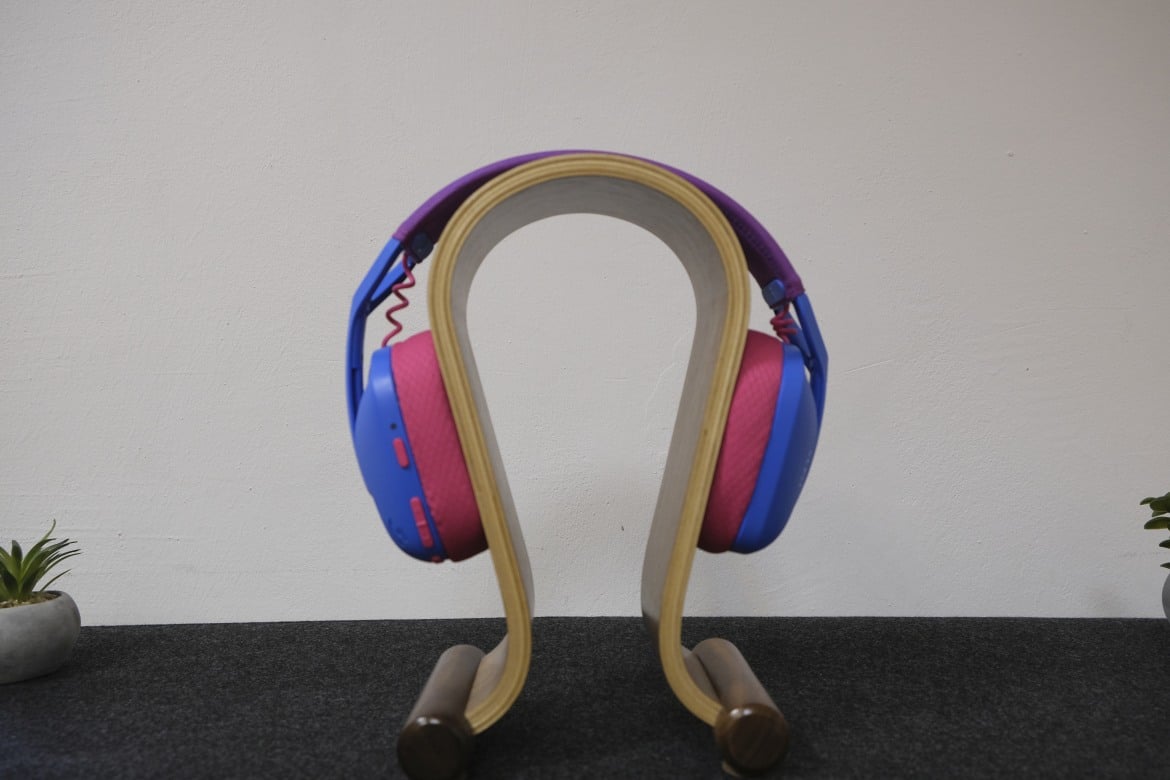 Die auffällig bunte Farbgebung sticht ebenfalls sofort ins Auge. Unser Testgerät in der Farbvariante „Blue/Raspberry“ setzt auf eine matt-blaue Außenseite, die durch rosafarbene Ohrpolster und einen etwas dunkleren Stoffbezug des Kopfbügel akzentuiert wird.