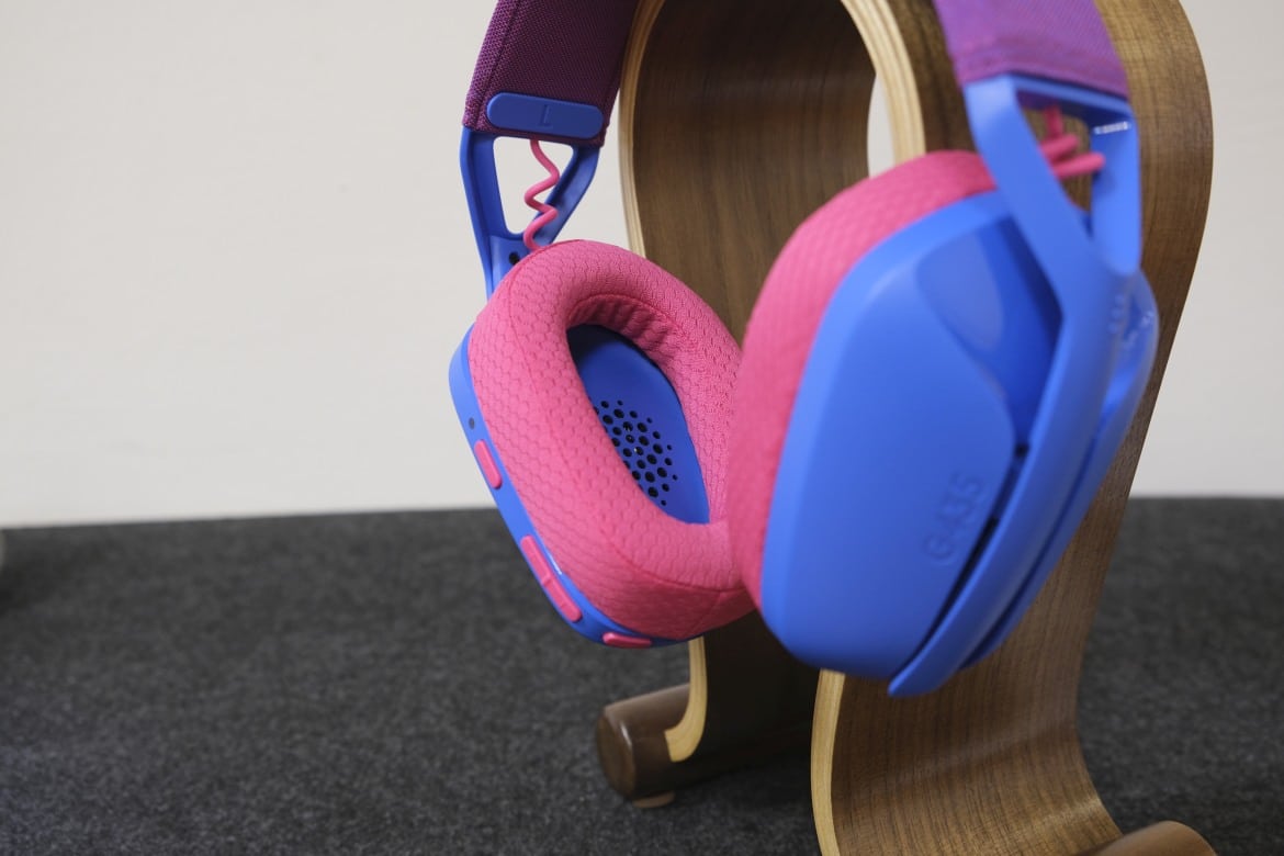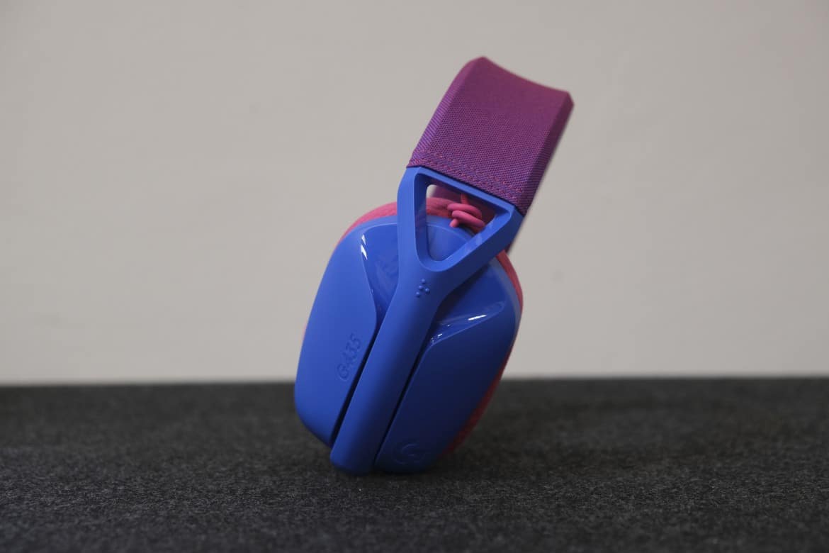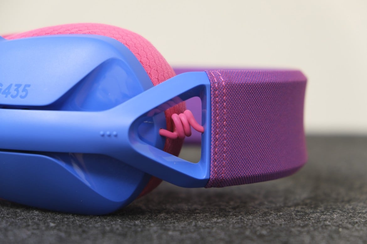 Zwei dunkel abgesetzte, ovale „Löcher“ zeugen von den verbauten Dual-Beamforming-Mikrofonen, die das G435 zur Sprachübertragung nutzt – einen klassischen Mikrofonarm gibt es in diesem Fall nicht. Hinsichtlich der Grundform erinnert das G435 dabei etwas an seinen großen Bruder Logitech G733, bringt dabei aber nur knapp die Hälfte an Gewicht auf die Waage.