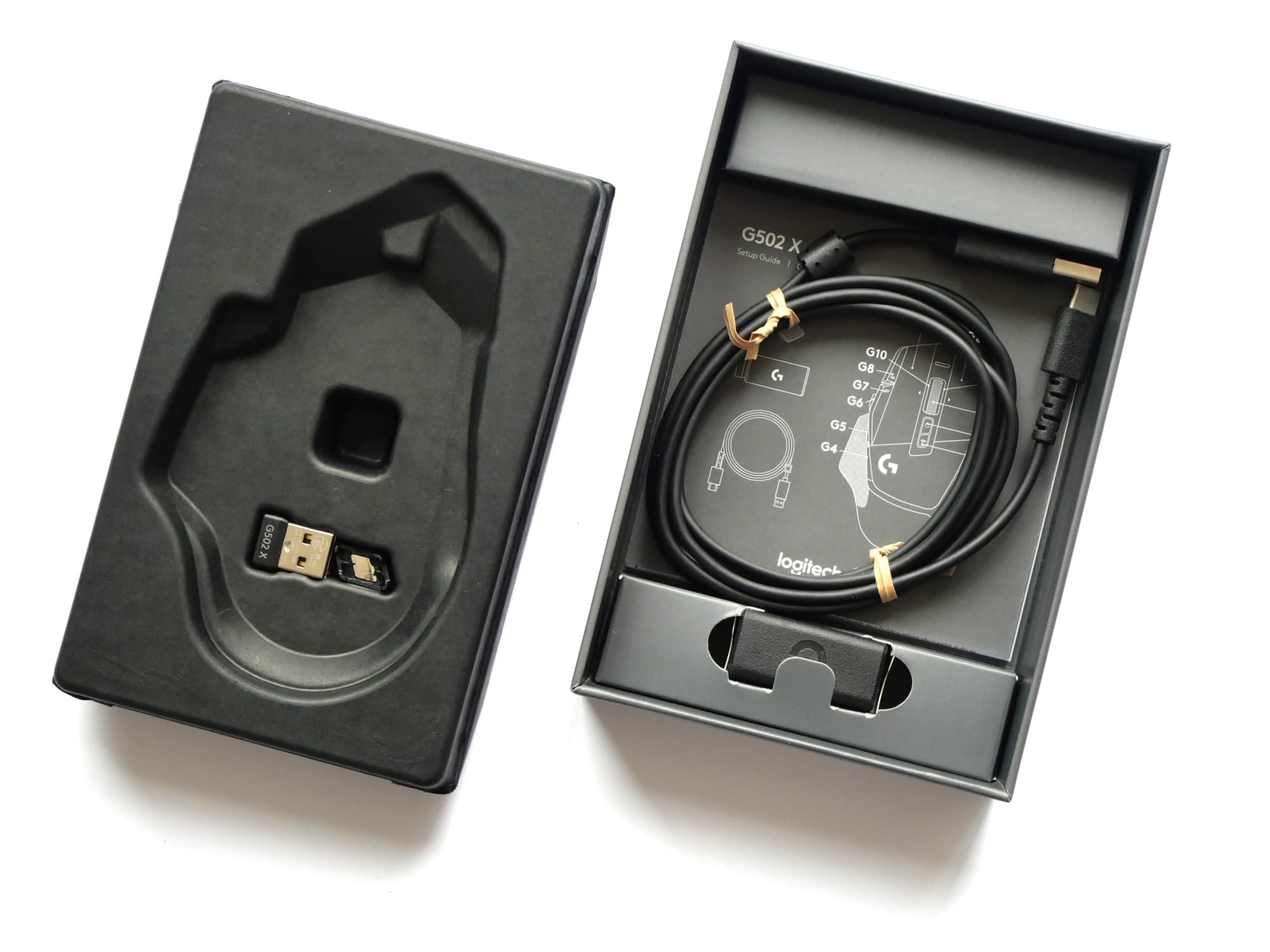 Nach dem Öffnen des Kartons blicken wir direkt auf die Gaming-Maus. Unter dieser befinden sich eine Abdeckung für die DPI-Wechseltaste und der Lightspeed USB-Empfänger. Weiteres Zubehör wie das USB-C-auf-USB-A-Kabel, ein USB-Adapter, der Logitech G-Sticker und die Bedienungsanleitung befinden sich unter dem Zwischenboden des Kartons.
