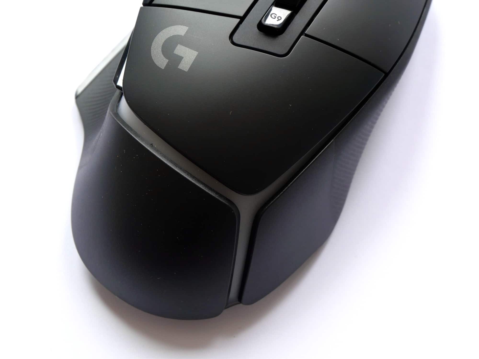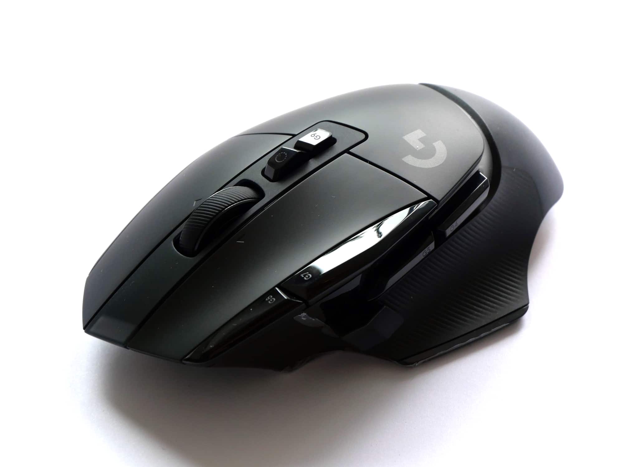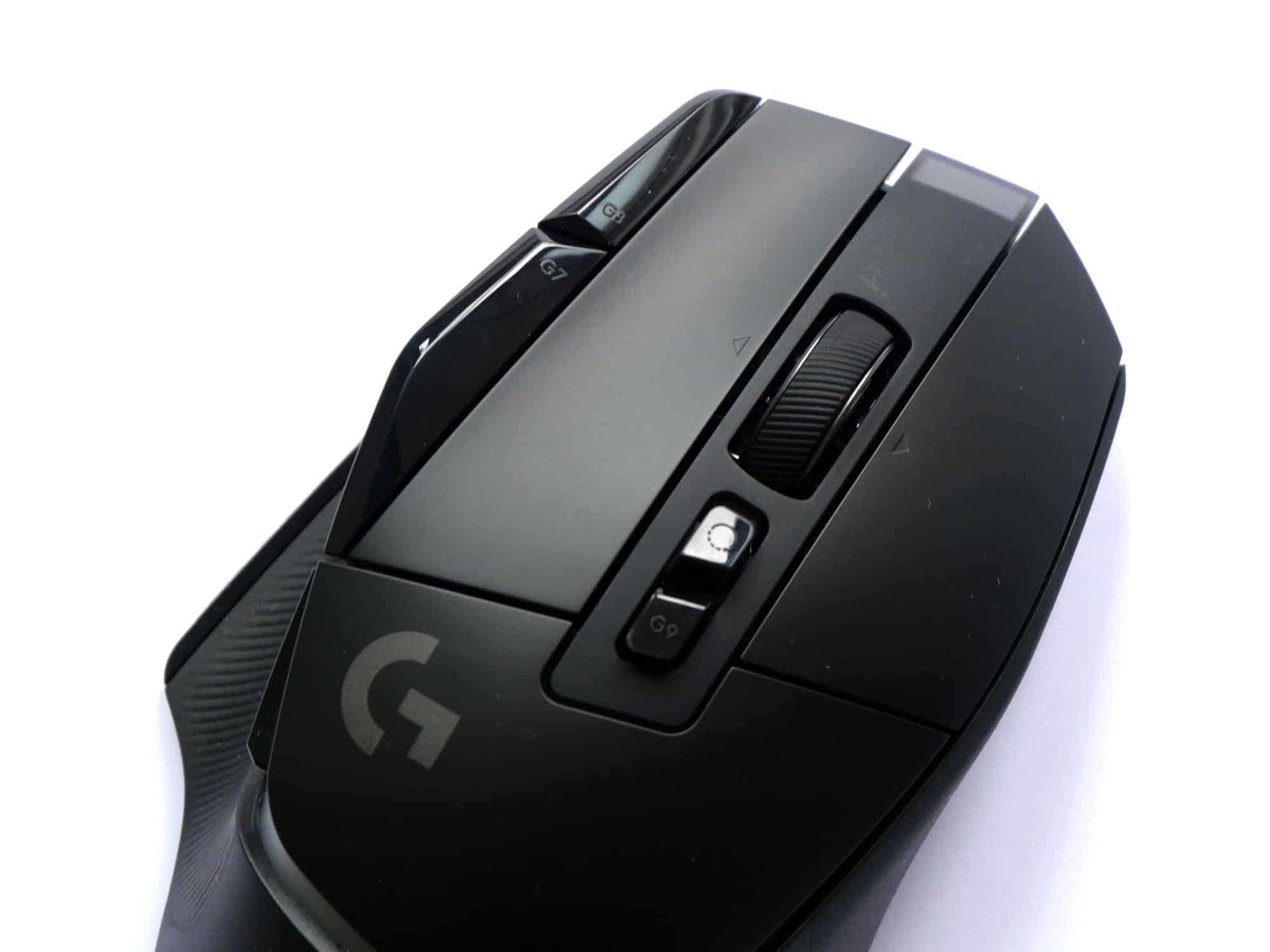 Auf der Oberseite der Maus befinden sich neben der linken und rechten Maustaste vier weitere Tasten und ein kippbares Scrollrad. Zwei der vier Tasten sind links von der linken Maustaste platziert, die anderen beiden unterhalb des Scrollrads. Die zusätzlichen Tasten sind etwas dunkler und stärker glänzend, als die restliche Oberseite, welche bis auf das Logitech G-Logo sehr schlicht gestaltet ist. Das Mausrad ist gummiert, strukturiert und bietet zwei Modi, zwischen denen man mit der Taste unterhalb des Mausrads wechseln kann. Dabei handelt es sich um einen hyperschnellen Modus, in dem das Rad frei rotiert und einen Präzisionsmodus mit hohem Widerstand. Ein automatisches Umschalten zwischen den Modi, wie es bspw. die Logitechs MX Master 3 bietet, gibt es hier nicht.