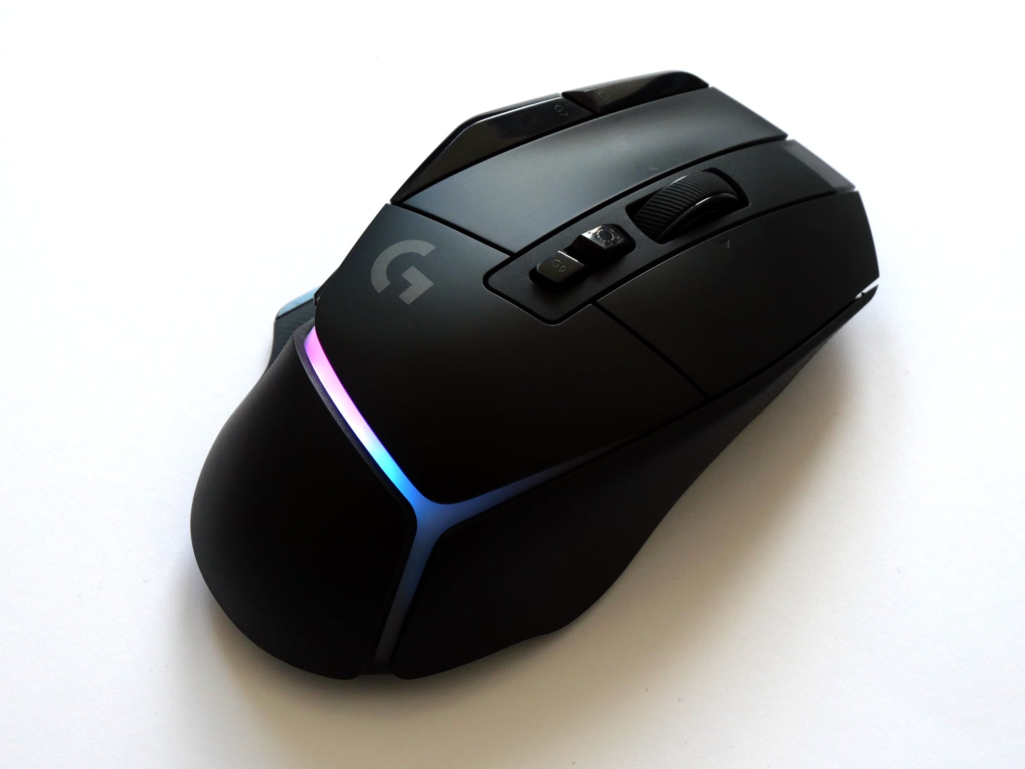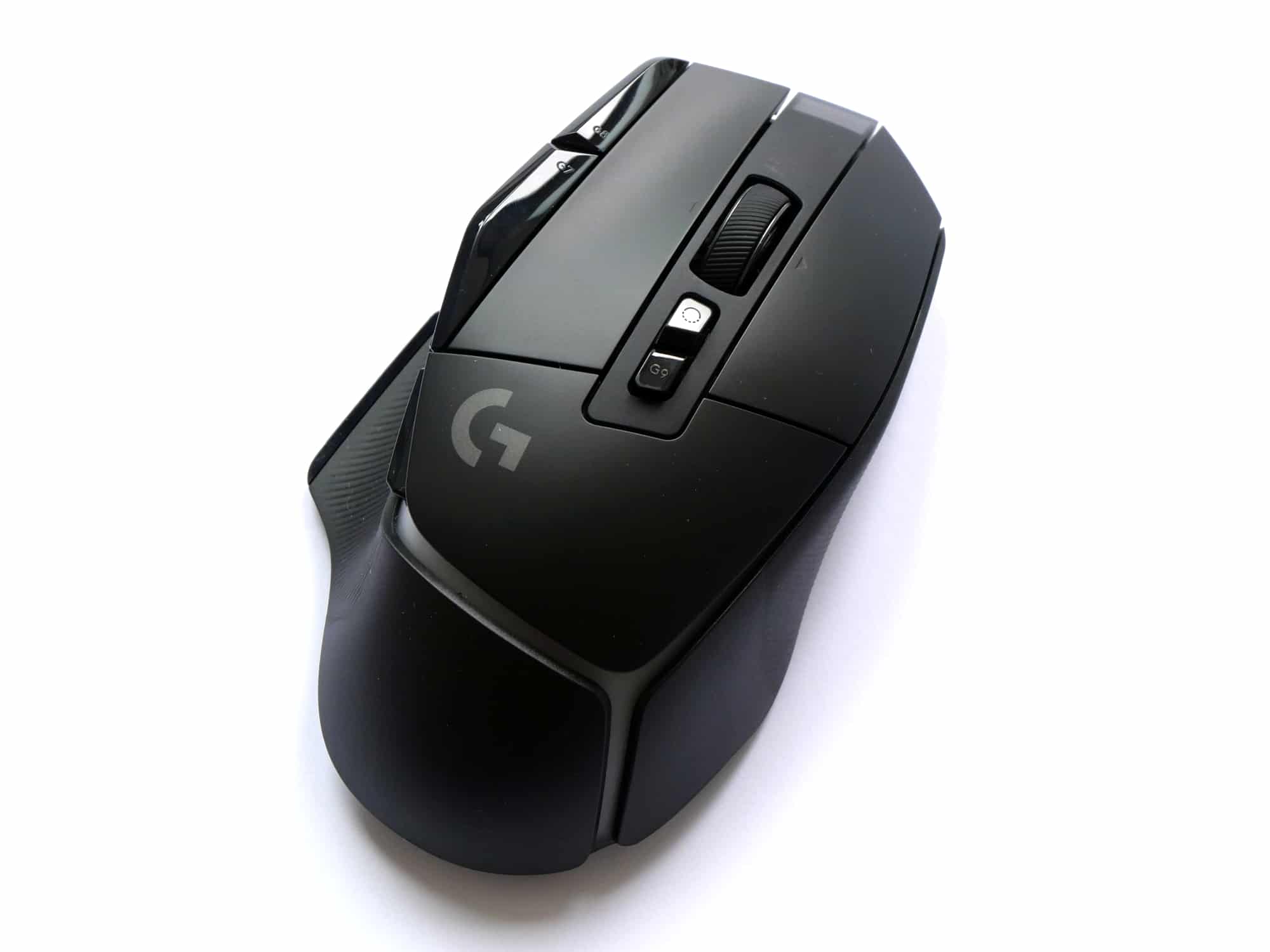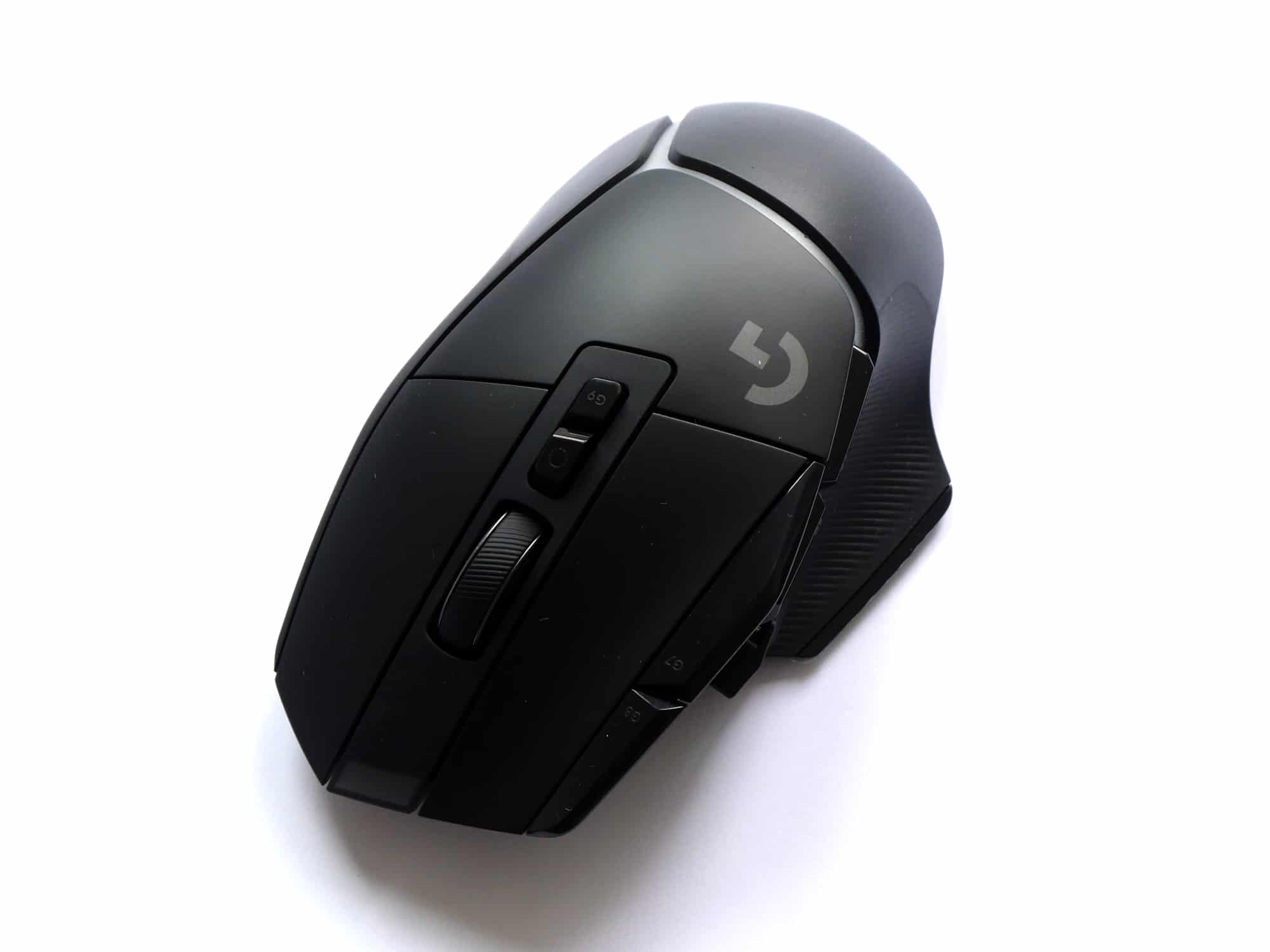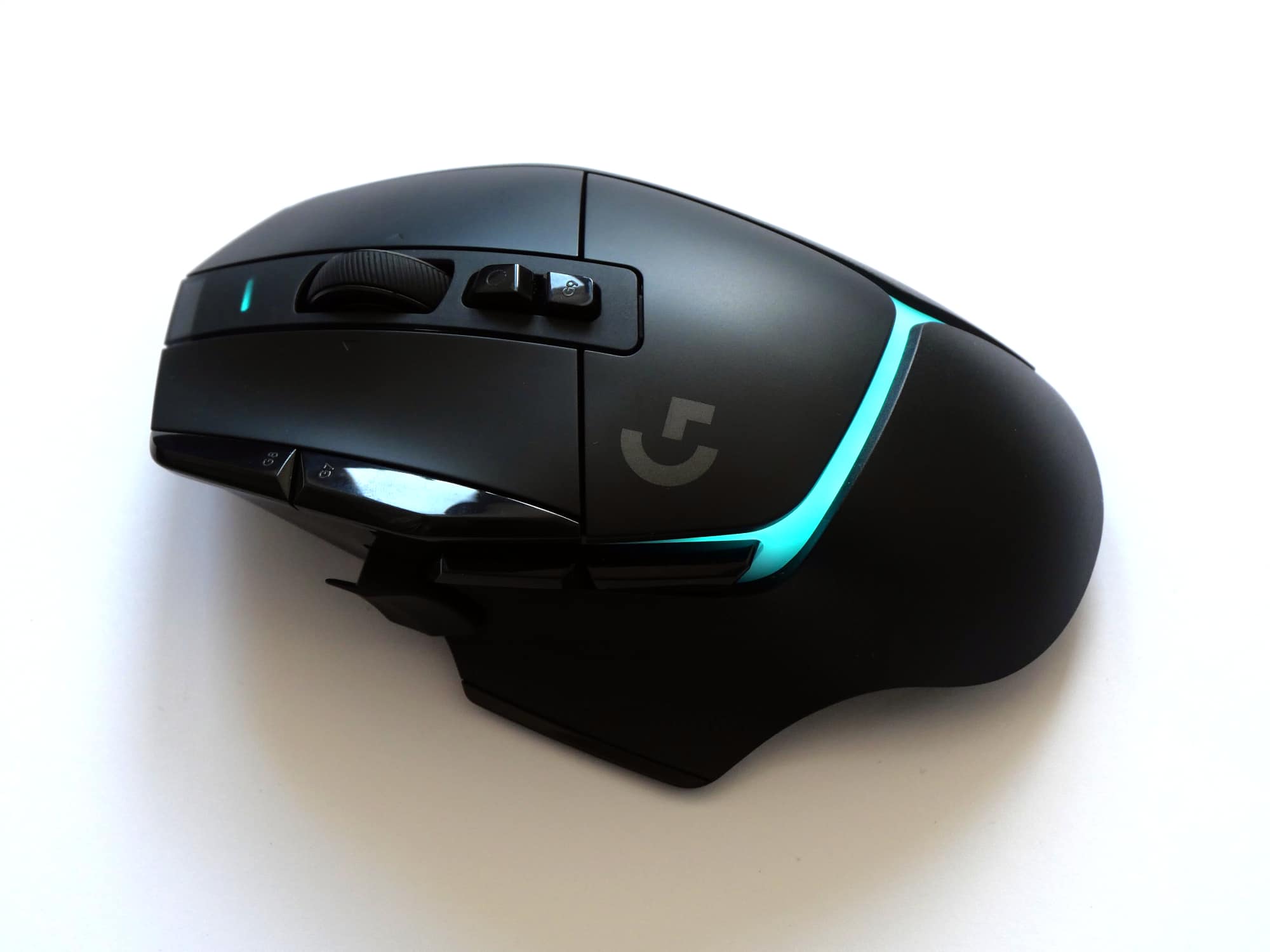 Auf der Oberseite der Maus befinden sich neben der linken und rechten Maustaste vier weitere Tasten und ein kippbares Scrollrad. Zwei der vier Tasten sind links von der linken Maustaste platziert, die anderen beiden unterhalb des Scrollrads. Die zusätzlichen Tasten sind etwas dunkler und stärker glänzend, als die restliche Oberseite, welche bis auf das Logitech G-Logo sehr schlicht gestaltet ist. Das Mausrad ist gummiert, strukturiert und bietet zwei Modi, zwischen denen man mit der Taste unterhalb des Mausrads wechseln kann. Dabei handelt es sich um einen hyperschnellen Modus, in dem das Rad frei rotiert und einen Präzisionsmodus mit hohem Widerstand. Ein automatisches Umschalten zwischen den Modi, wie es bspw. die Logitechs MX Master 3 bietet, gibt es hier nicht.