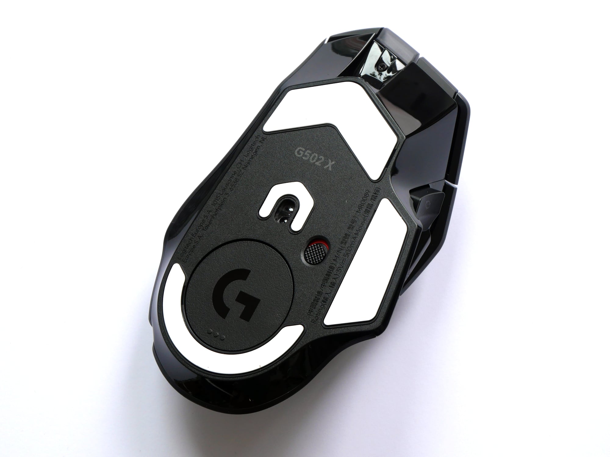 Unter der Maus befinden sich auf drei Seiten sowie um den Sensor herum große Gleitfüße aus weißem PTFE, welches besonders gute Gleiteigenschaften aufweist. Rechts des neuen Logitech Hero 25K-Sensors befindet sich der Ein- und Ausschalter, unterhalb das für Powerplay, Logitechs kabellose Ladetechnologie, benötigte Modul. Der USB-C-Anschluss, welcher ohne Powerplay zum Laden verwendet wird, befindet sich mittig auf der Vorderseite.