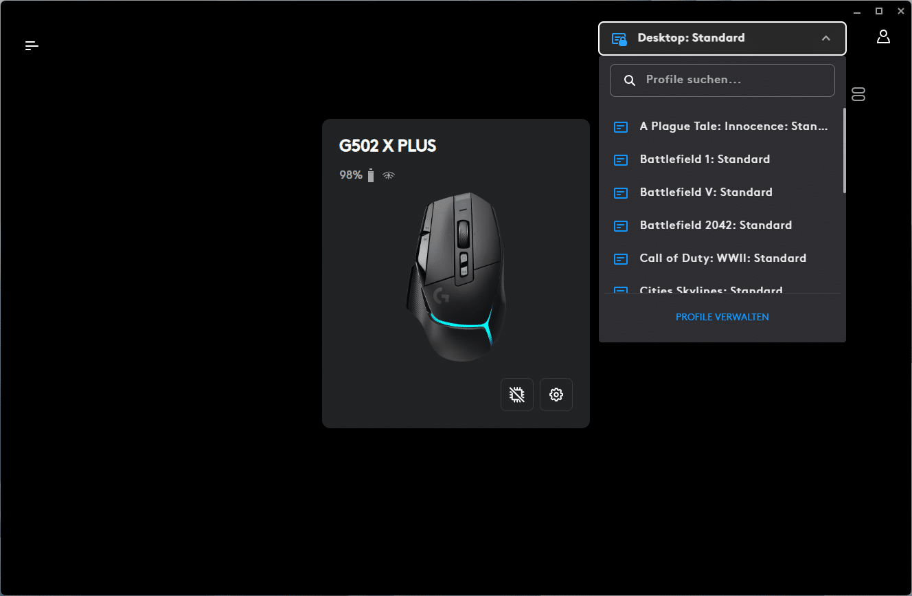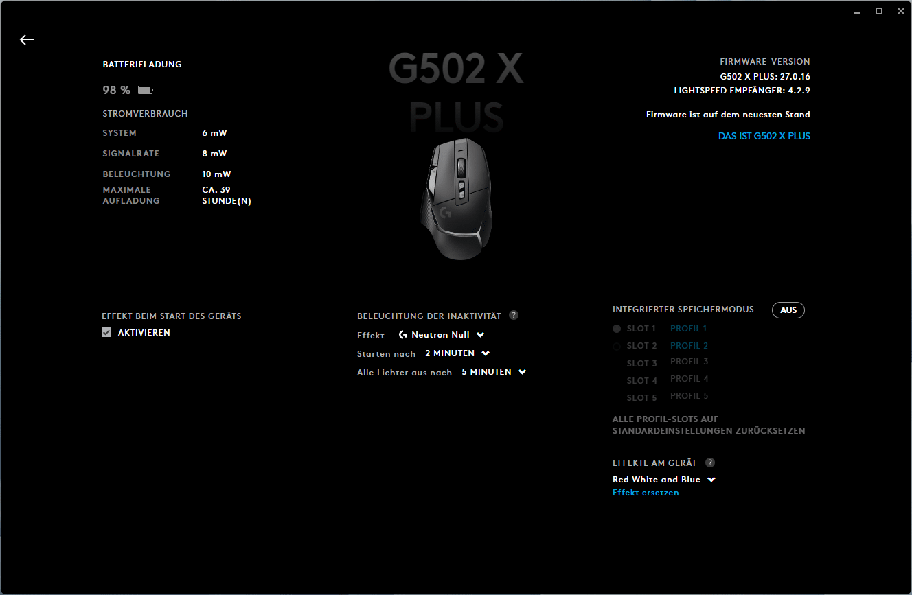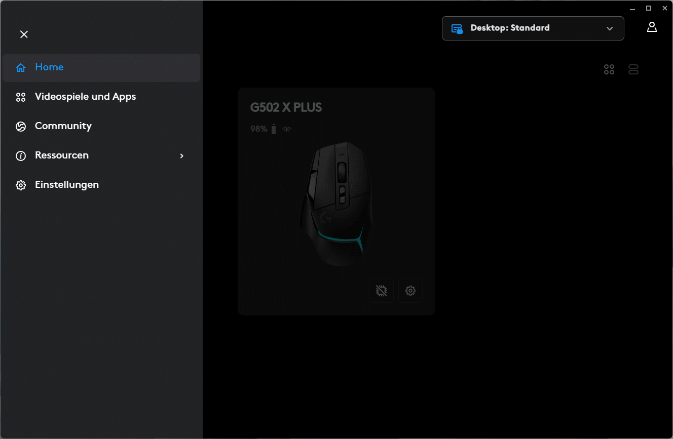 Im Home-Bereich werden die verbundenen Logitech G-Geräte, in unserem Fall die G502 X Plus, deren Akkustand, die verbleibende Akkulaufzeit, die Art der Verbindung und das aktive Profil angezeigt. Weiterhin kann man den integrierten Speichermodus ein- und ausschalten sowie auf die allgemeinen Geräteeinstellungen zugreifen, welche unter anderem die RGB-Beleuchtung und Einstellungen der App umfassen.