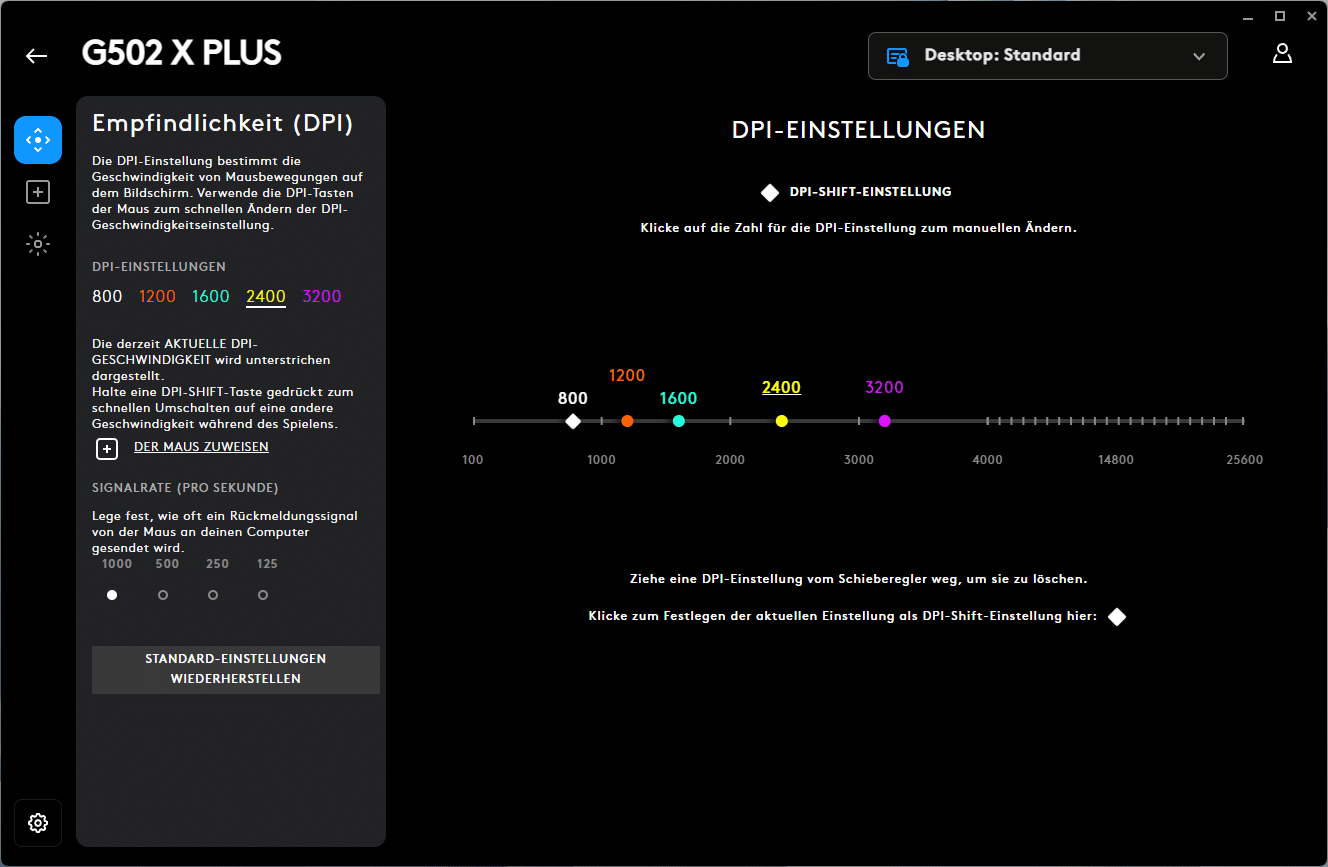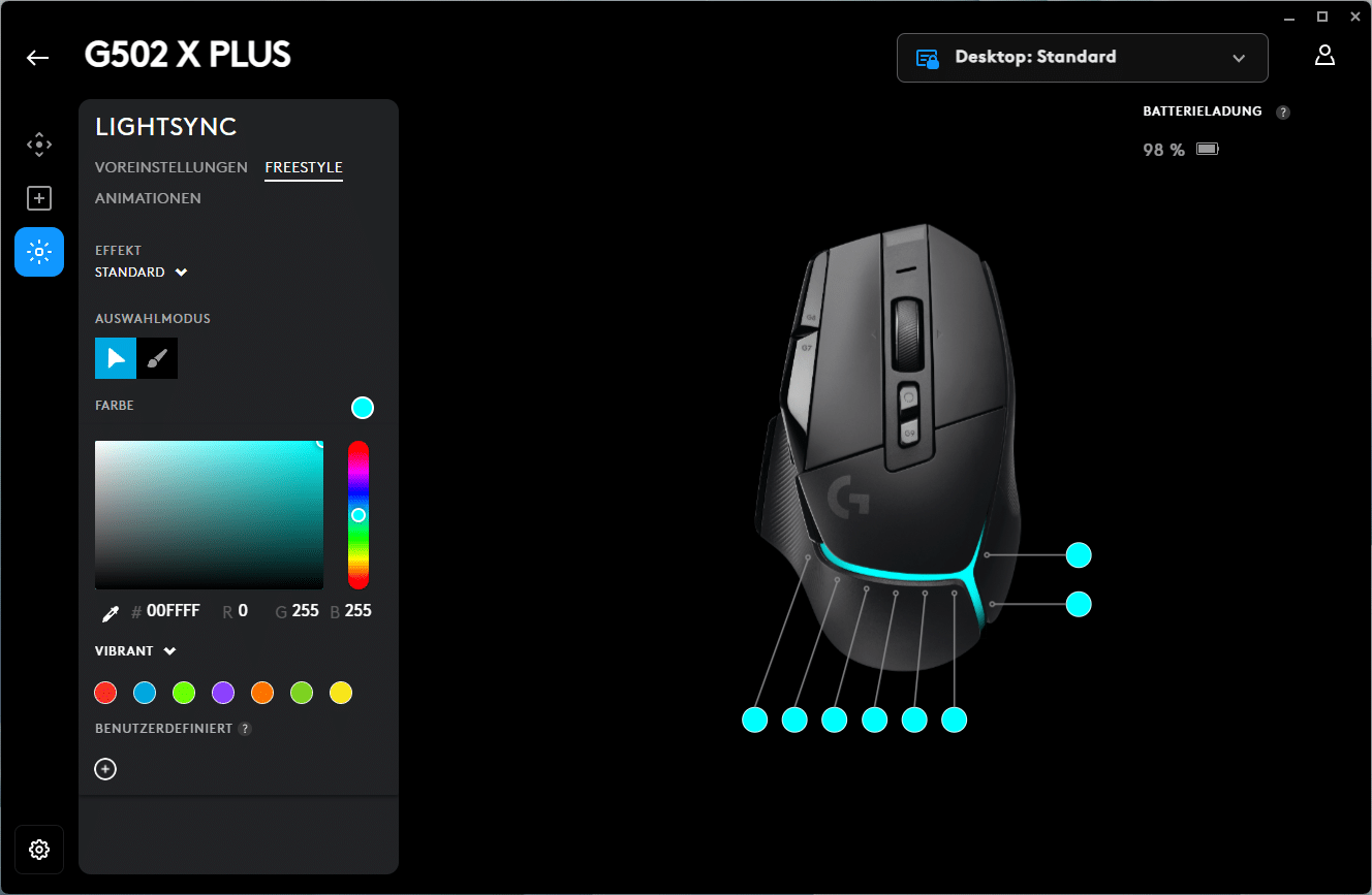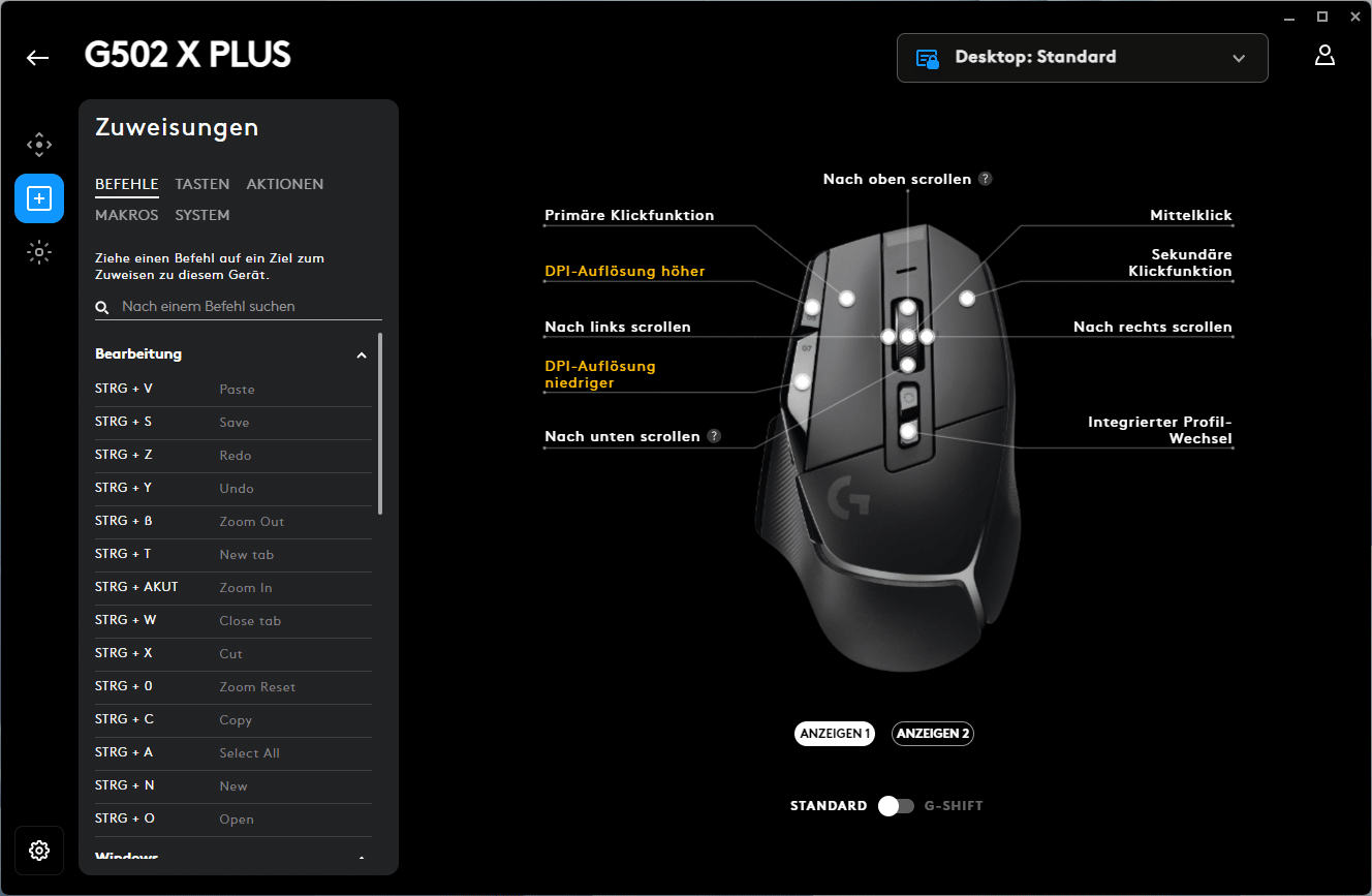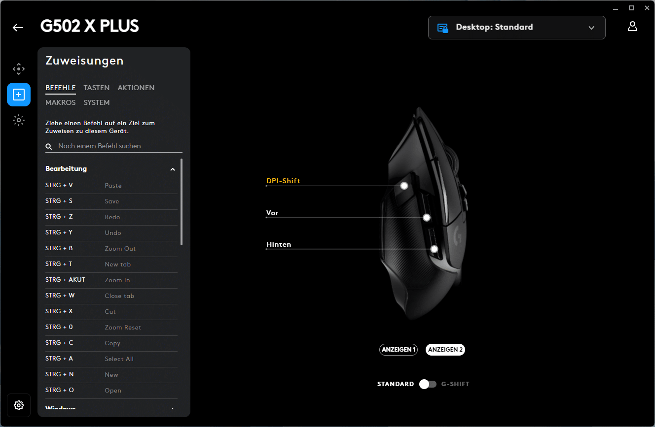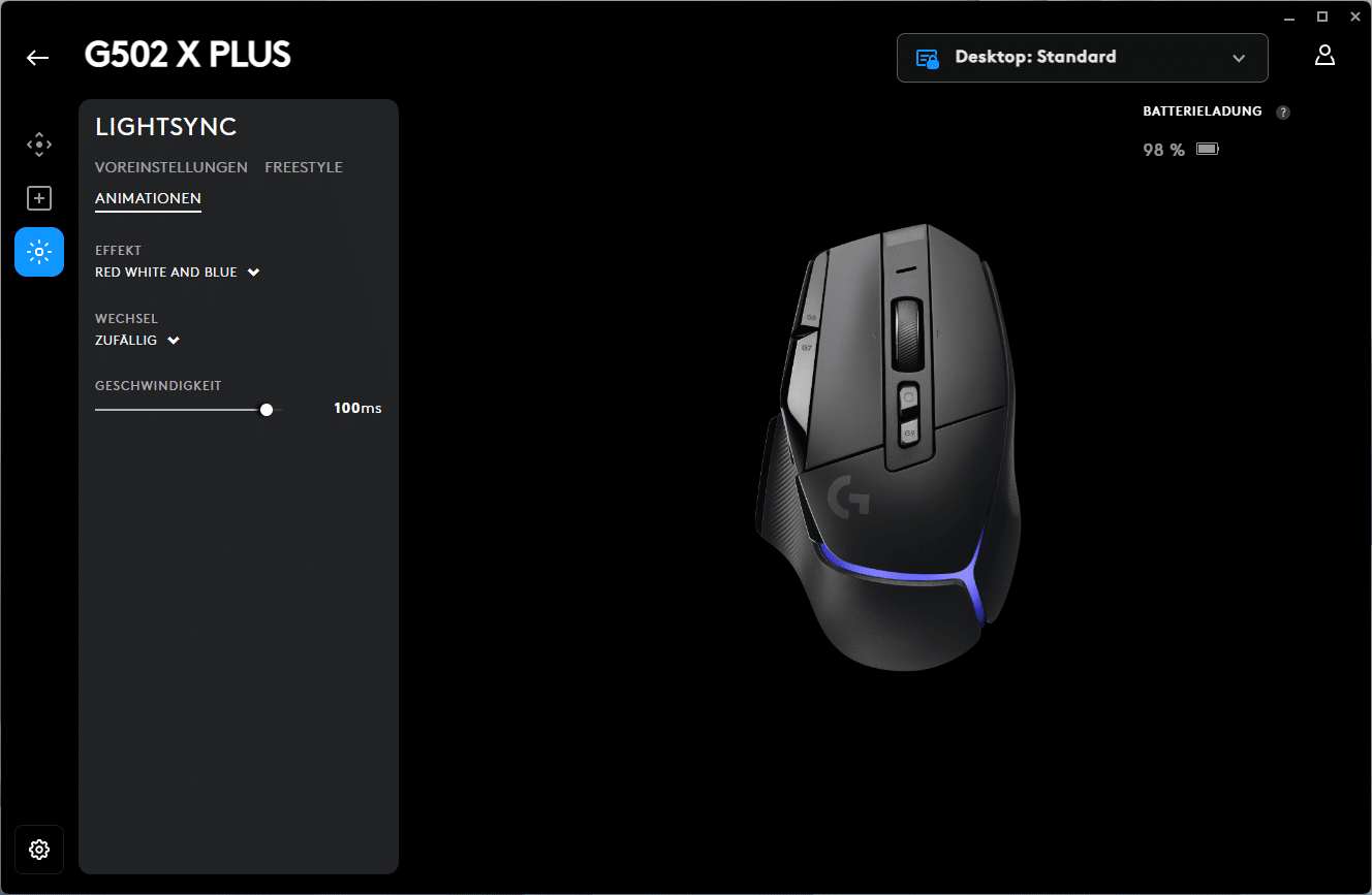Für die weiteren Einstellungen bietet der Logitech G HUB Profile, vom Standard-Profil Desktop bis hin zu den einzelnen Apps oder Spielen. Für diese können sowohl die DPI als auch Zuweisungen und Lightsync angepasst werden. Die DPI können dabei in 50er Schritten von 100 bis 25.600 gewählt werden. Fünf DPI-Werte lassen sich speichern, anschließend kann mit Hilfe der DPI-Taste jederzeit zwischen ihnen gewechselt werden. Weiter lässt sich die Tastenzuweisung für alle Tasten ändern, Logitech bietet hier eine Auswahl aus Befehlen, Tasten, Aktionen, Makros oder auch Systembefehlen. Dank G-Shift können zudem fast alle Tasten doppelt belegt werden. Lightsync, Logitechs programmierbare RGB-Beleuchtung, bietet eine Vielzahl von Effekten, wie die Voreinstellungen, Freestyle (das Erstellen eigener Effekte) und vorgefertigten Animationen.