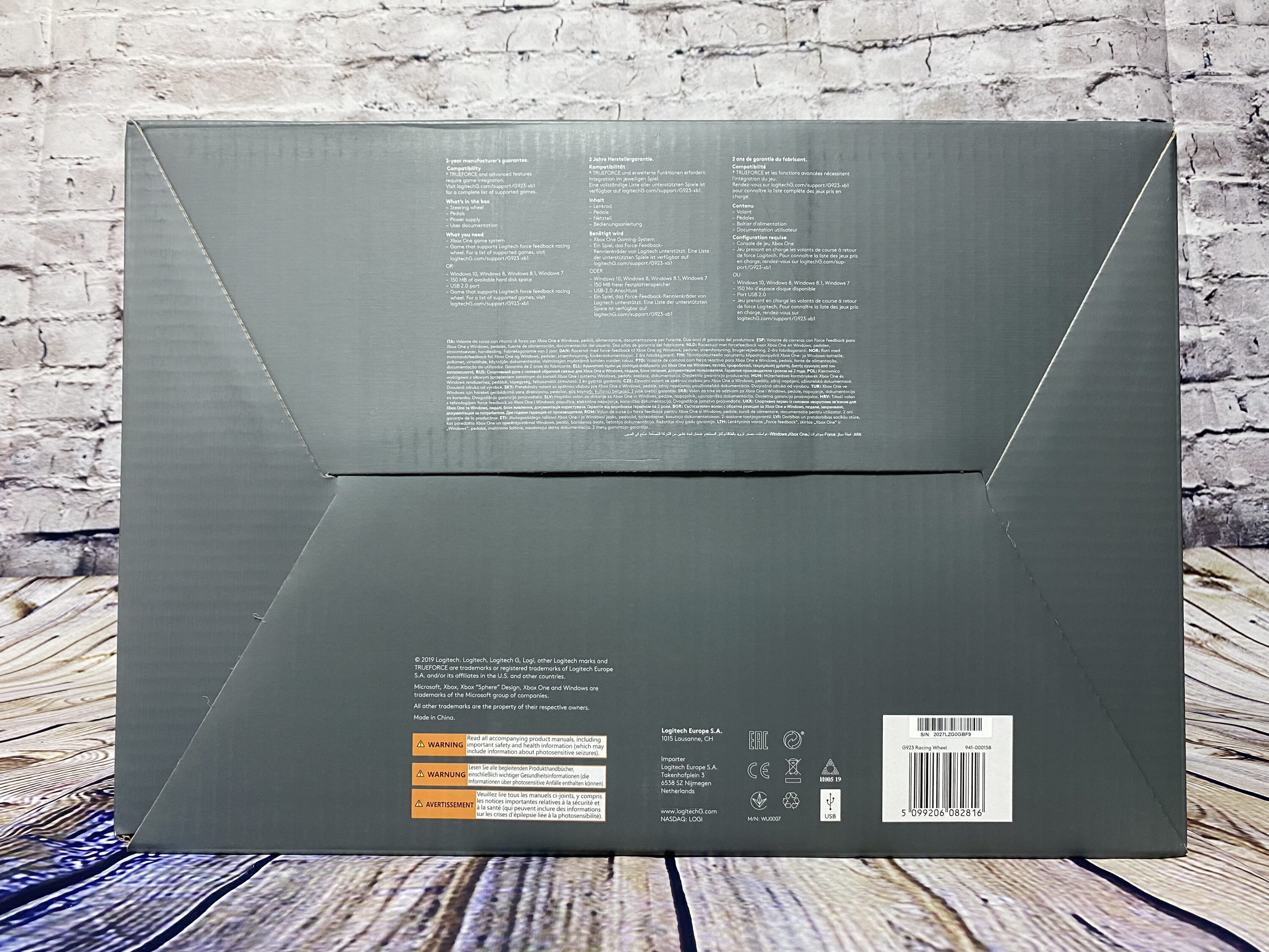Das Logitech G923 wird in einem passgenauen braunen Karton geliefert mit einem Logitech-Logo an der Seite. Im Karton befinde sich dann die richtige Verpackung. Beim Öffnen sieht man sofort worum es sich handelt, das G923 in einem schönen glänzenden Blau strahlt und lächelt einen förmlich an. Die Verpackung ist rund um sehr gelungen – wie immer stehen alle wichtigsten Information auf der Außenseite.