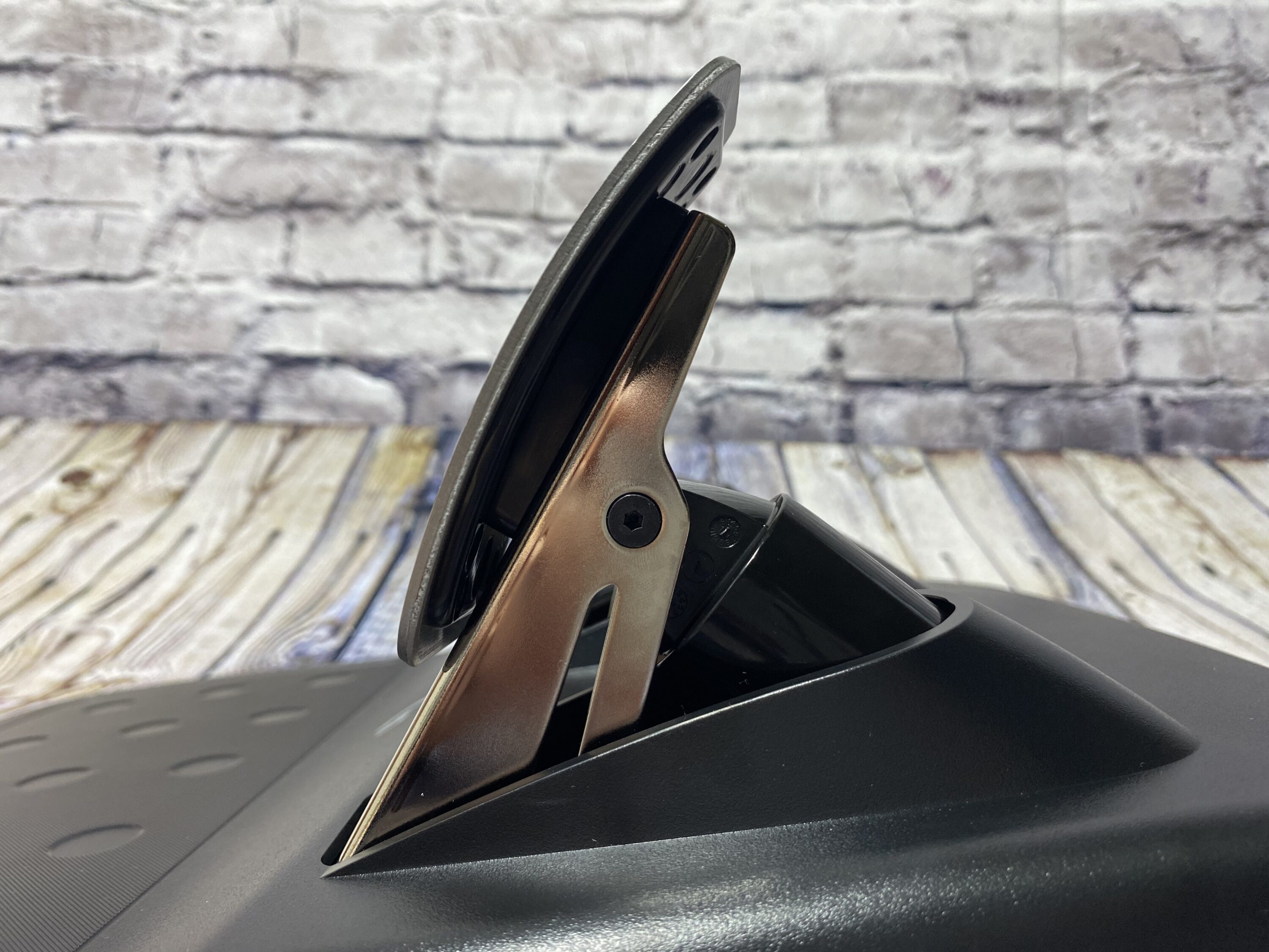 Die Klammern zum Befestigen gibt es zum Schluss auch noch zu besprechen. Diese sind sehr gut verarbeitet worden und machen ihren Job, das Lenkrad fest an einer Halterung oder Tischplatte zu halten, sehr gut. Doch eine kleine Vorsicht ist geboten. Wenn man sich das Lenkrad anschaffen möchte, sollte man vorher nach den Maßen seines Tisches gucken. In unseren Fall wollten wir das Lenkrad an einer IKEA-Schreibtischplatte befestigen. Diese war jedoch mit zwei Millimeter zu dick geraten. Vorher also ein mal die Tischplatten-Dicke ausmessen und mit der maximalen Größe der Klammern (27 mm) abgleichen.