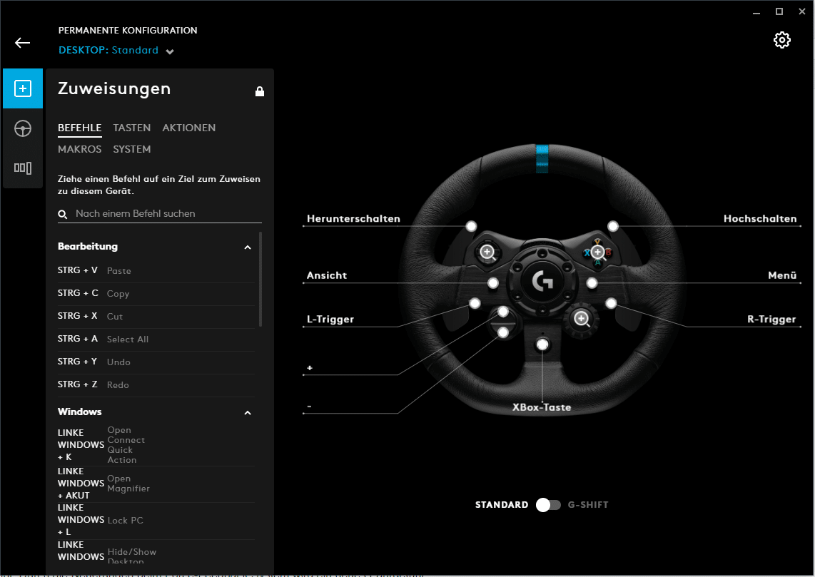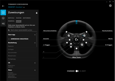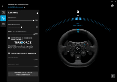 Mit G-Hub lässt sich das Lenkrad, abgesehen von den in Spielen angebotenen Konfigurationen, beliebig und individuell einstellen. Die Software eigene GUI ist dabei sehr übersichtlich und gut aufgeteilt organisiert. Außerdem wirkt sie durch die optisch ansprechenden Animationen sehr modern, im Gegensatz zu ihren Konkurrenten. An der Stelle ist ein Lob an Logitech auszusprechen.