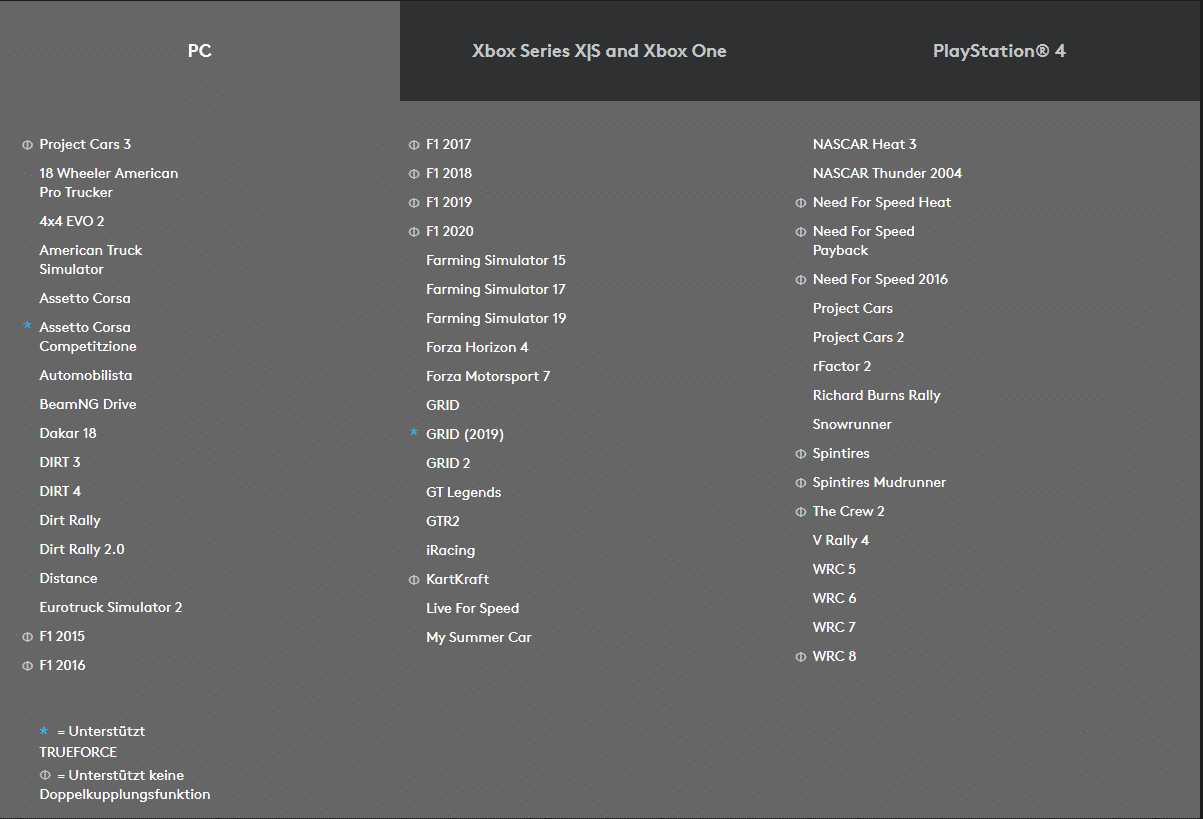 | Lenkrad | Lenk-Bereich: 900 Grad von Anschlag zu Anschlag, Halleffekt-Lenksensor, Force-Feedback mit zwei Motoren mit TRUEFORCE, Überhitzungsschutz |