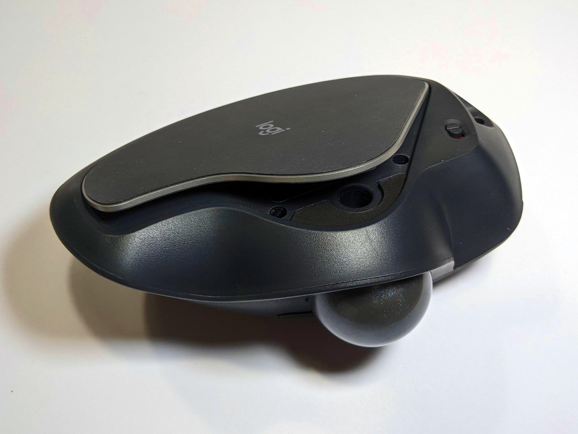 Die Form und Größe des Logitech MX Ergo Wireless Trackballs sind der des Ergo M575 sehr ähnlich, die Hand findet angenehm darauf Platz. Durch die Neigung ist die Hand in einer natürlichen Position und ermüdet langsamer. Die sowieso schon leicht vorhandene Neigung lässt sich aber auch noch weiter verstärken. Die Unterseite des Trackballs ist sehr gut durchdacht und besitzt einen leichten Knick um 20°. Der Trackball selbst hat keinen direkten Kontakt zum Arbeitsplatz. Diesen stellt eine Metallplatte, die mittels Magnet am Trackball befestigt ist, her. Dank dem 20°-Knick lässt sich die Metallplatte in zwei Positionen befestigen, so dass ihr zwischen zwei Winkeln, in denen eure Hand liegt, wählen könnt.