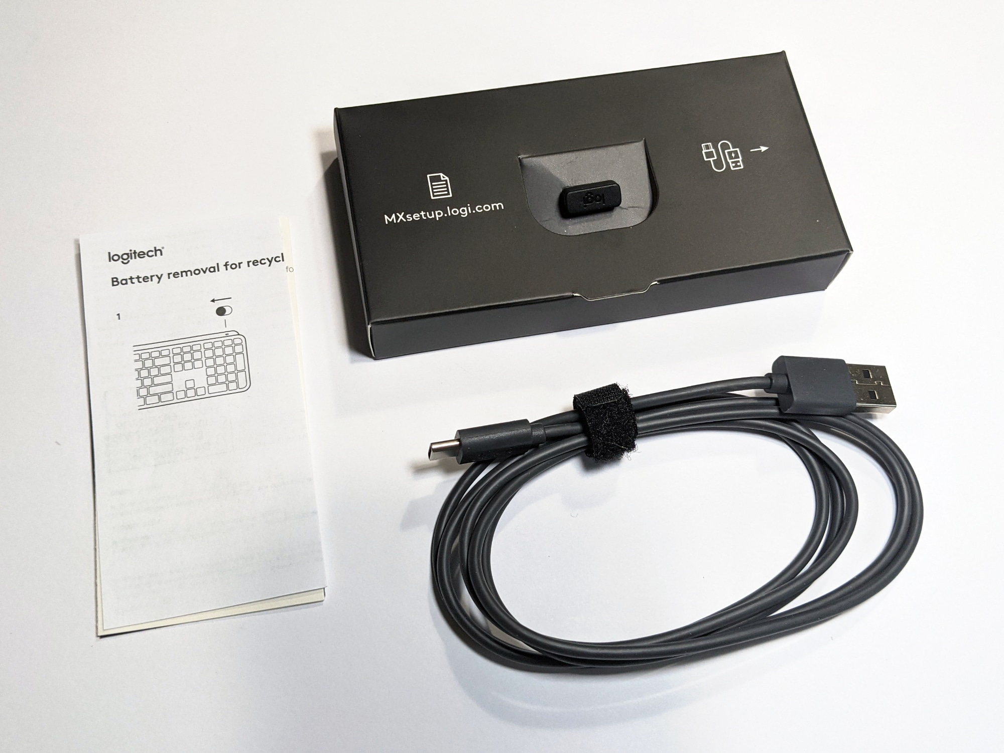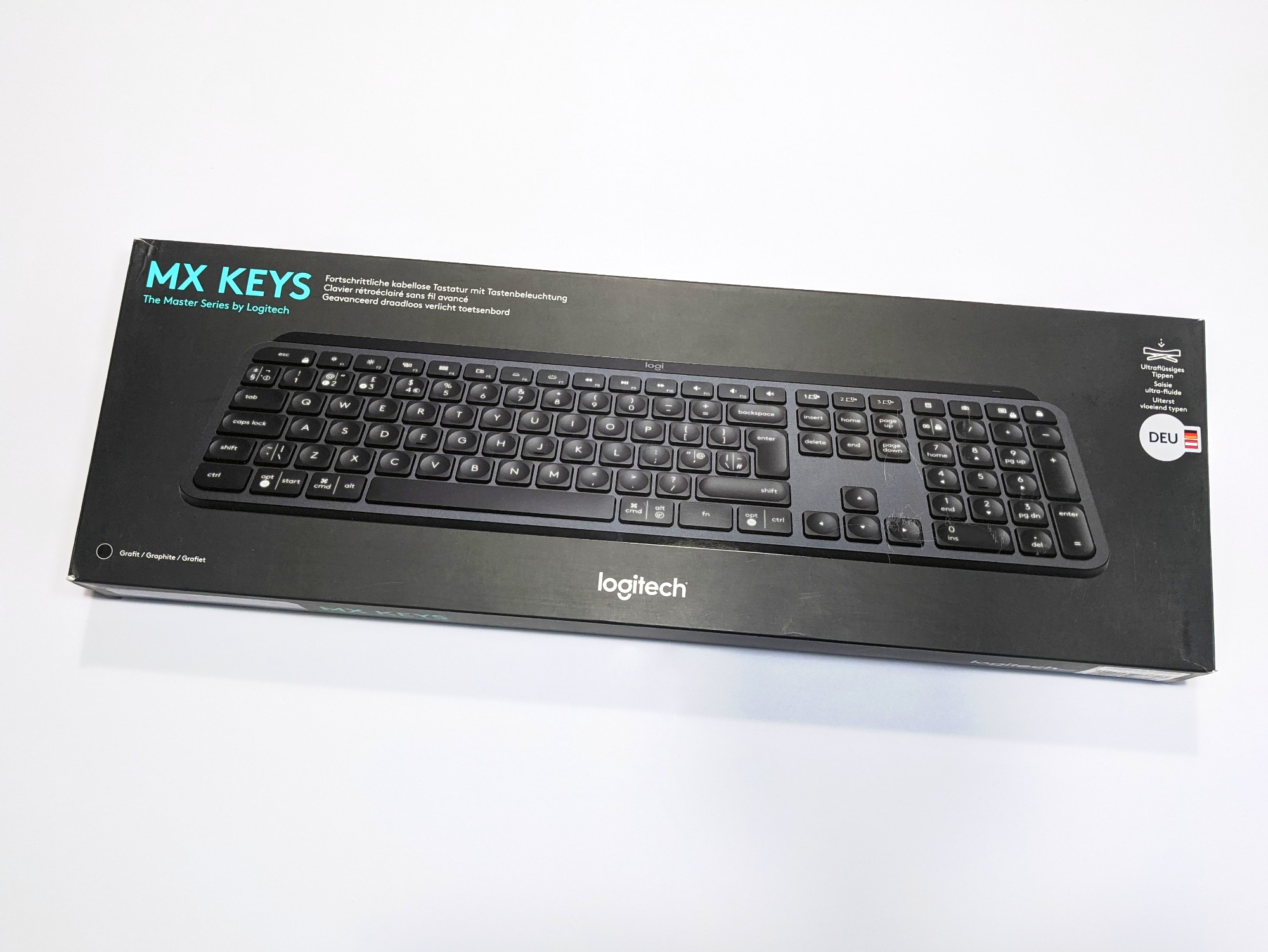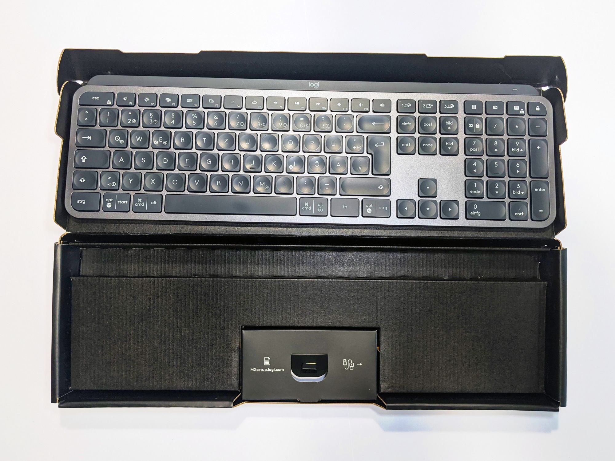 Die Logitech MX Keys kommt in einem kompakten schwarzen Pappkarton, hierbei kommt man erfreulicherweise ganz ohne Kunststoff aus. Das Verpackungsdesign orientiert sich an den anderen Geräten der Master-Serie, auf der Rückseite des Kartons werden wie üblich die wichtigsten Features beworben. Im Inneren befinden sich die Tastatur selbst, der Unifying USB-Empfänger, ein USB-C-Ladekabel und eine Anleitung.