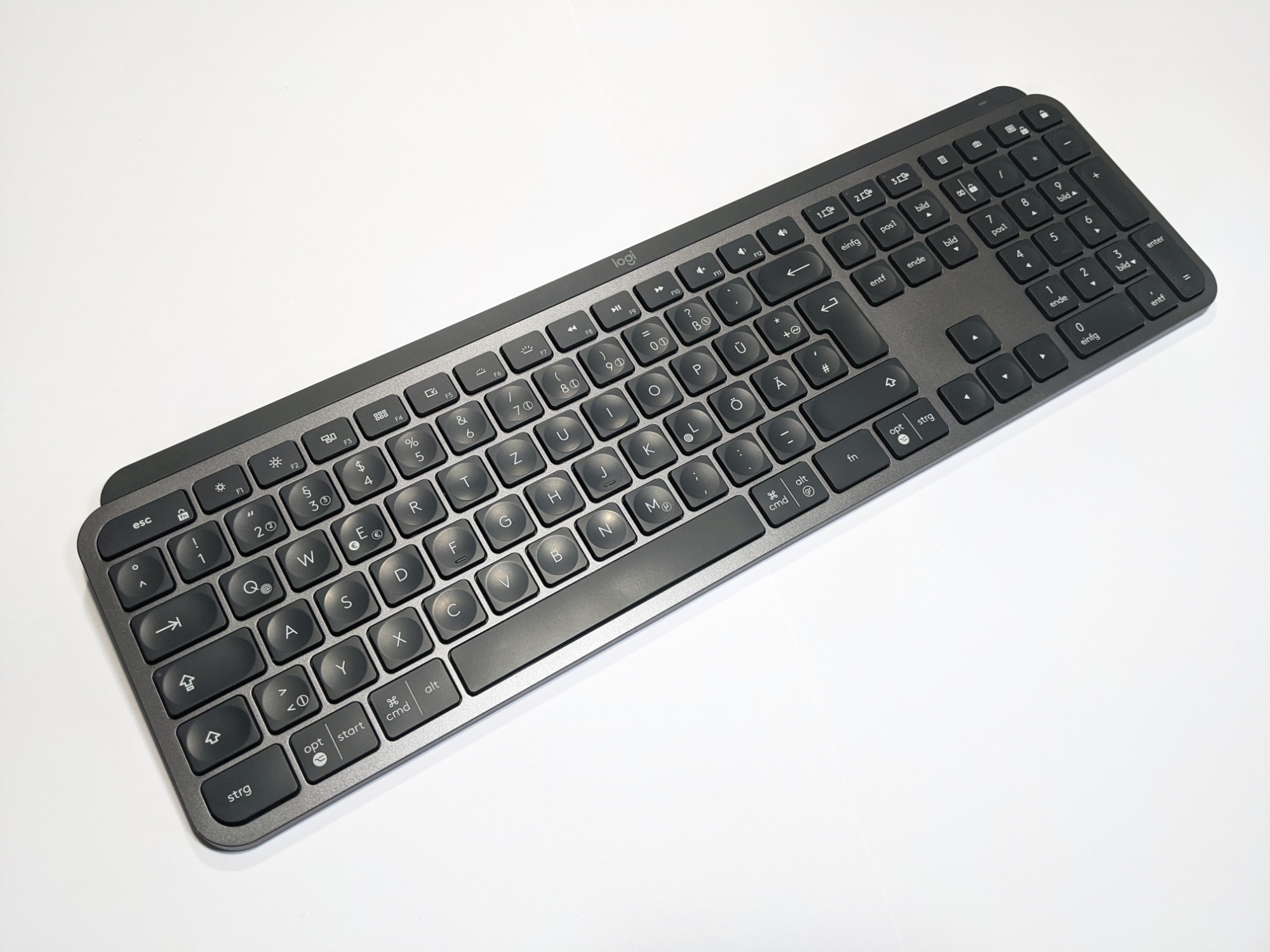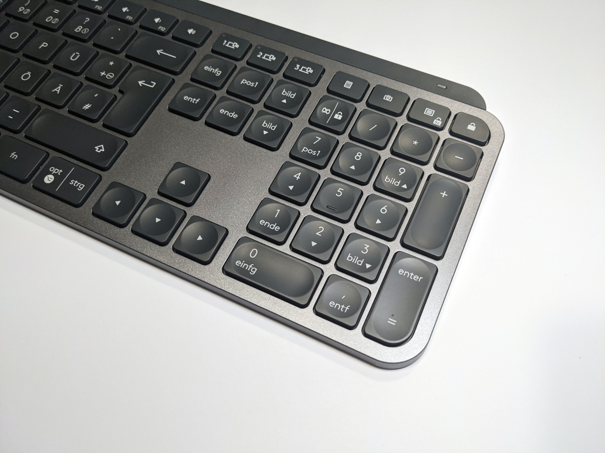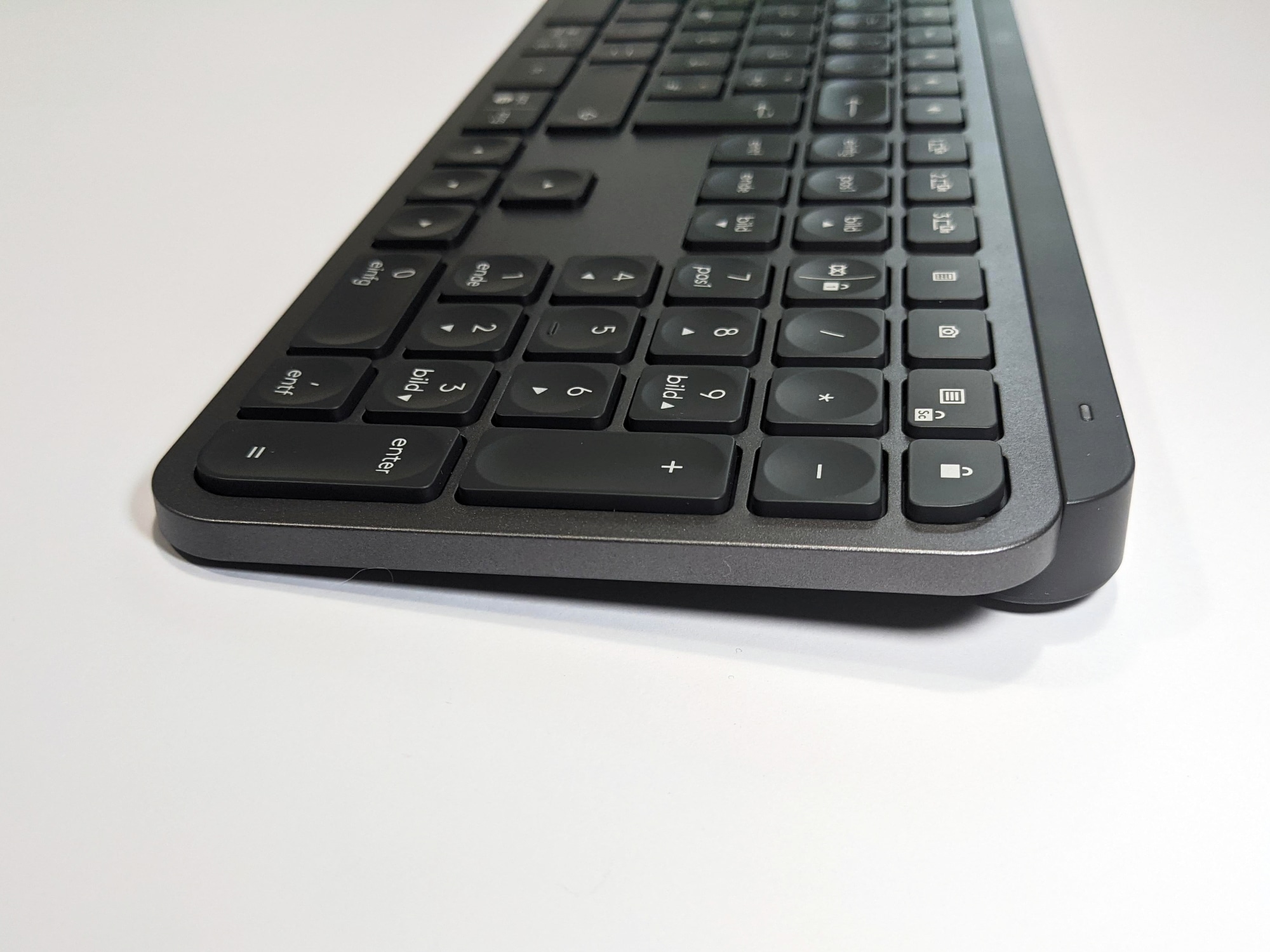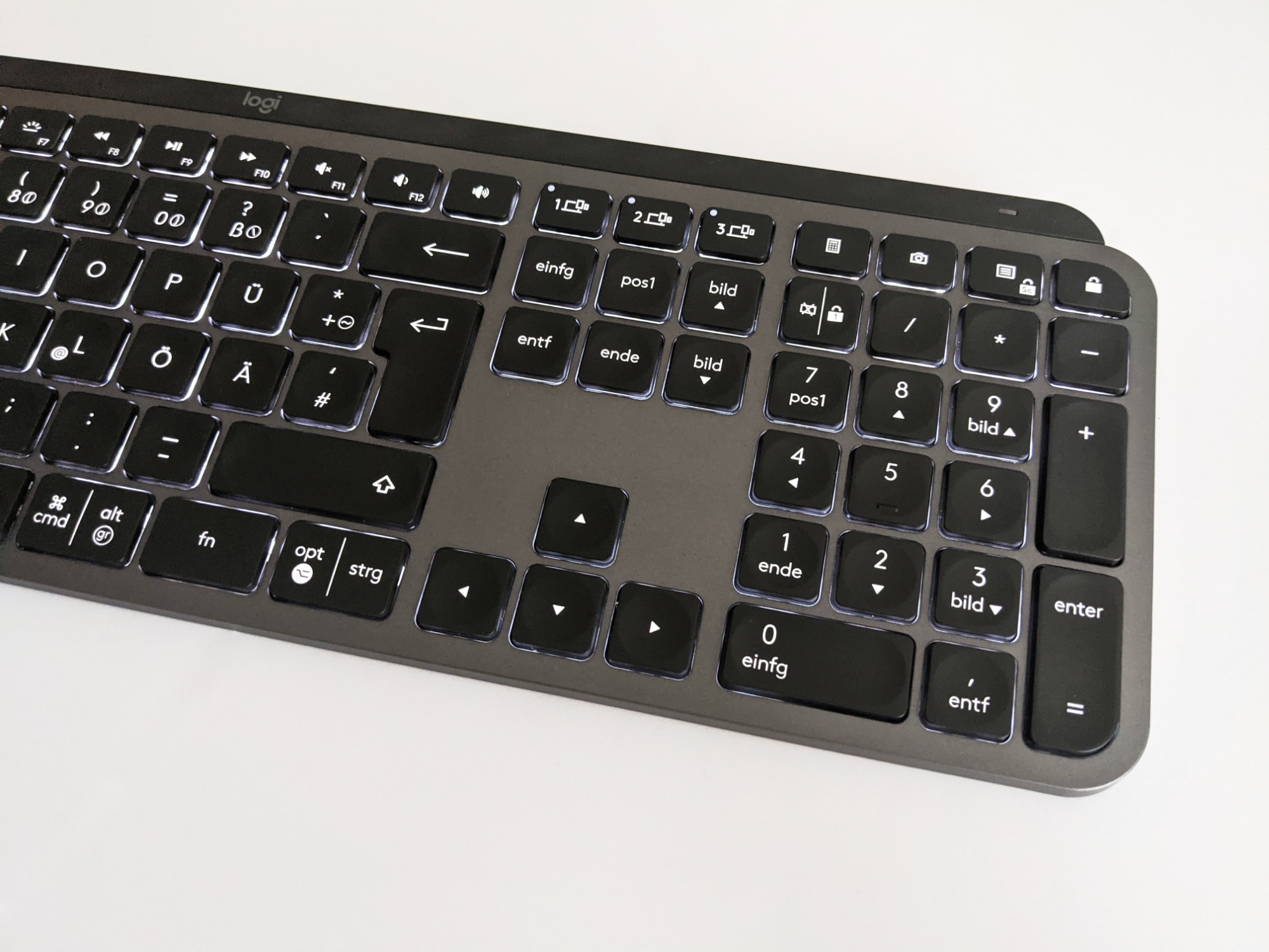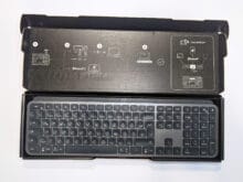 Die Logitech MX Keys ist normalgroß, eher flacher als die meisten anderen Tastaturen und verfügt über ein vollständiges Layout inklusive Nummernblock. Multimedia-Tasten sind ebenfalls vorhanden, sowie drei Easy-Switch-Tasten, mit denen man jederzeit schnell und einfach zwischen den, mittels Unifying-Empfänger oder auch Bluetooth, verbundenen Geräten umschalten kann.