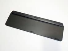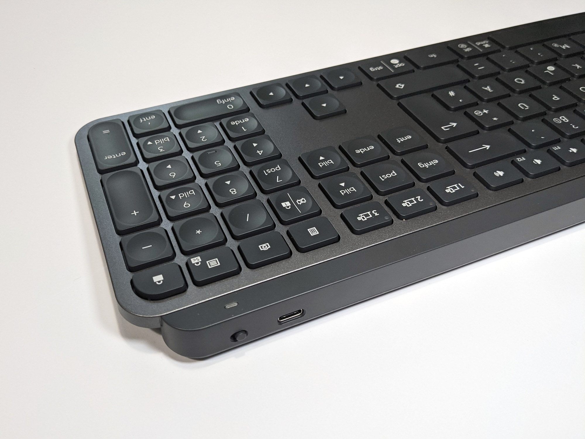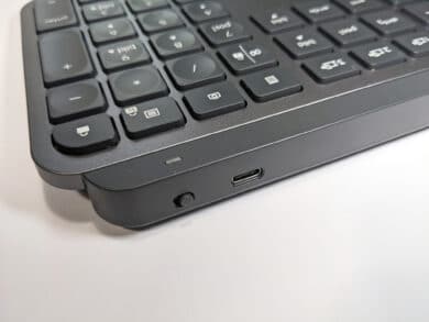 Mit einem Gewicht von 810 g ist die Tastatur sehr schwer. Dies liegt an der Metallplatte, die neben der sehr ansprechenden Optik für eine hohe Stabilität sorgt. Durch das hohe Gewicht und die sechs länglichen Gummierungen auf der Unterseite liegt die MX Keys sicher an Ort und Stelle. Über ein Verrutschen während der Arbeit muss man sich somit nur wenige Gedanken machen. Die Tastatur liegt leicht schräg, was am länglichen, auf der Unterseite untergebrachten Akku liegt. Eine weitere Anpassung der Schrägstellung ist nicht möglich. Der Akku ist fest verbaut, kann also nicht gewechselt werden und sorgt für eine Akkulaufzeit von bis zu zehn Tagen mit Hintergrundbeleuchtung bzw. bis zu fünf Monaten ohne. Geladen wird mittels USB-C, der Anschluss dafür befindet sich oben rechts an der Tastatur. Hier finden wir auch den Ein- und Ausschalter.
