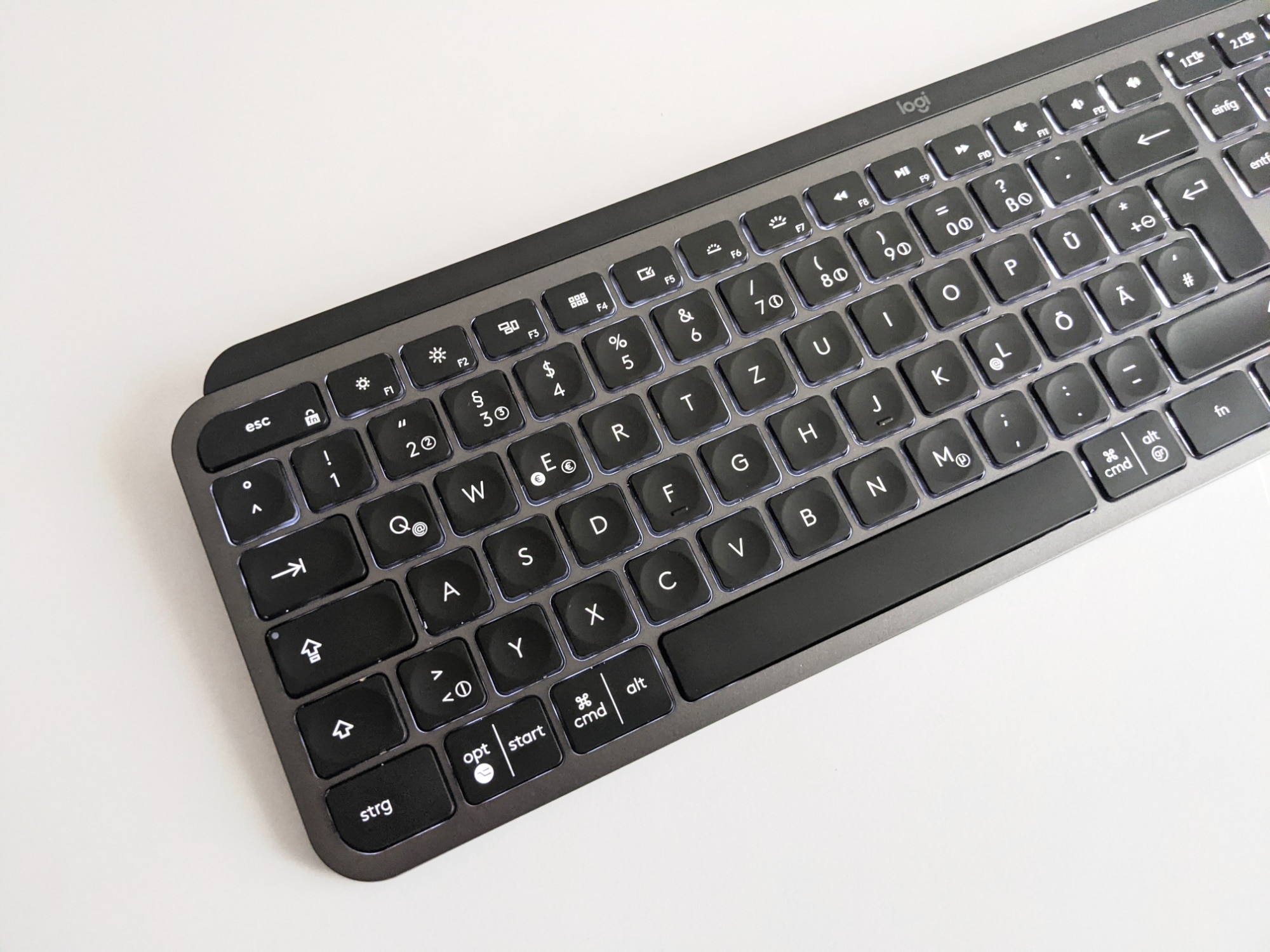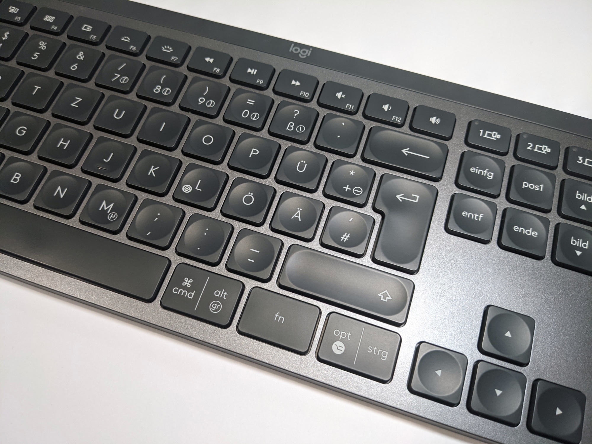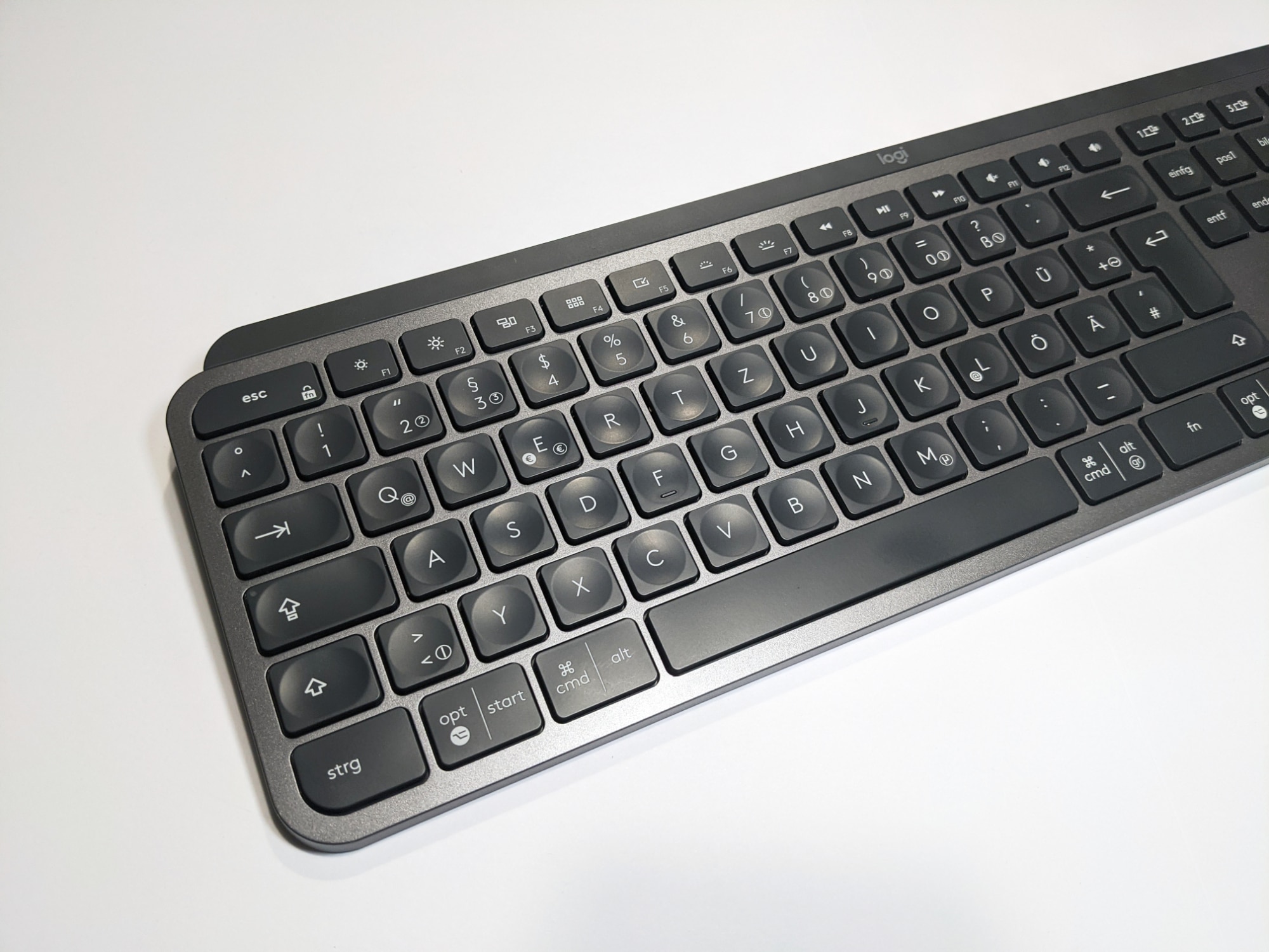 Der Druckpunkt der Perfect Stroke-Tasten ist sehr gut gewählt, auch das Feedback empfinden wir als passend. Weiterhin ist die Tastatur sehr leise. Wer auf der Suche nach einer neuen Tastatur fürs Büro ist und Ärger mit den Kollegen vermeiden möchte, kann also unbesorgt zugreifen. Durch die Wölbung der Tasten liegen die Finger angenehm auf. In Kombination mit der Materialwahl und der hohen Materialqualität gestaltet sich die Arbeit mit der MX Keys auch bei längeren Texten und an längeren Arbeiten als sehr gefällig. Zusätzliche Tasten, wie wir sie von vielen Gaming-Tastaturen gewohnt sind, gibt es hier nicht. Dafür sind aber zumindest die F bzw. Fn-Tasten doppelt belegt, was wir im Office-Betrieb und im Zusammenspiel mit Logi Options+ auch als ausreichend empfanden.