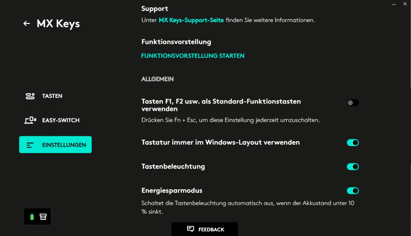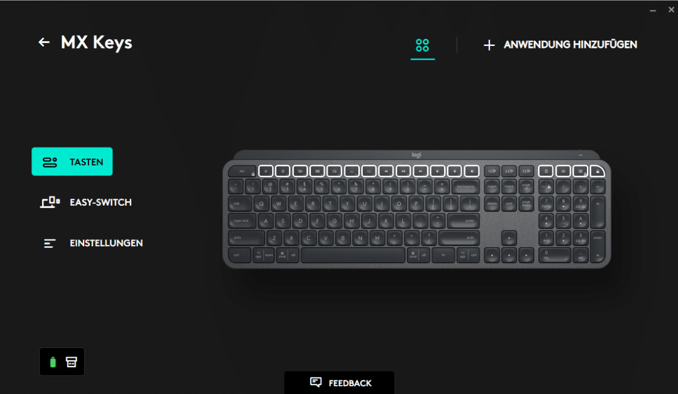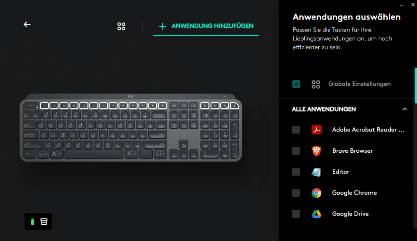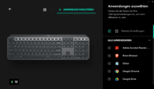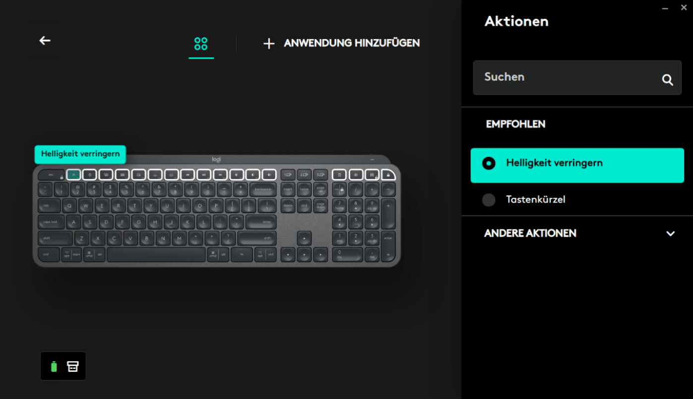 Als Software kommt das wohl den meisten bekannte Logitech Options bzw. der Nachfolger Logi Options+, der bisher allerdings nur als Beta verfügbar ist, zum Einsatz. Innerhalb der Software lassen sich Tasten neu belegen, entweder global oder auch für einzelne Programme, zwischen Standard-Funktionstasten und Logitechs Optionen, wie z.B. dem Ändern der Helligkeit oder der Lautstärke, wechseln sowie die Tastenbeleuchtung und der Energiesparmodus aktivieren bzw. deaktivieren. Die Art der Verbindung und der Akkustand sind ebenfalls in der Software ersichtlich.