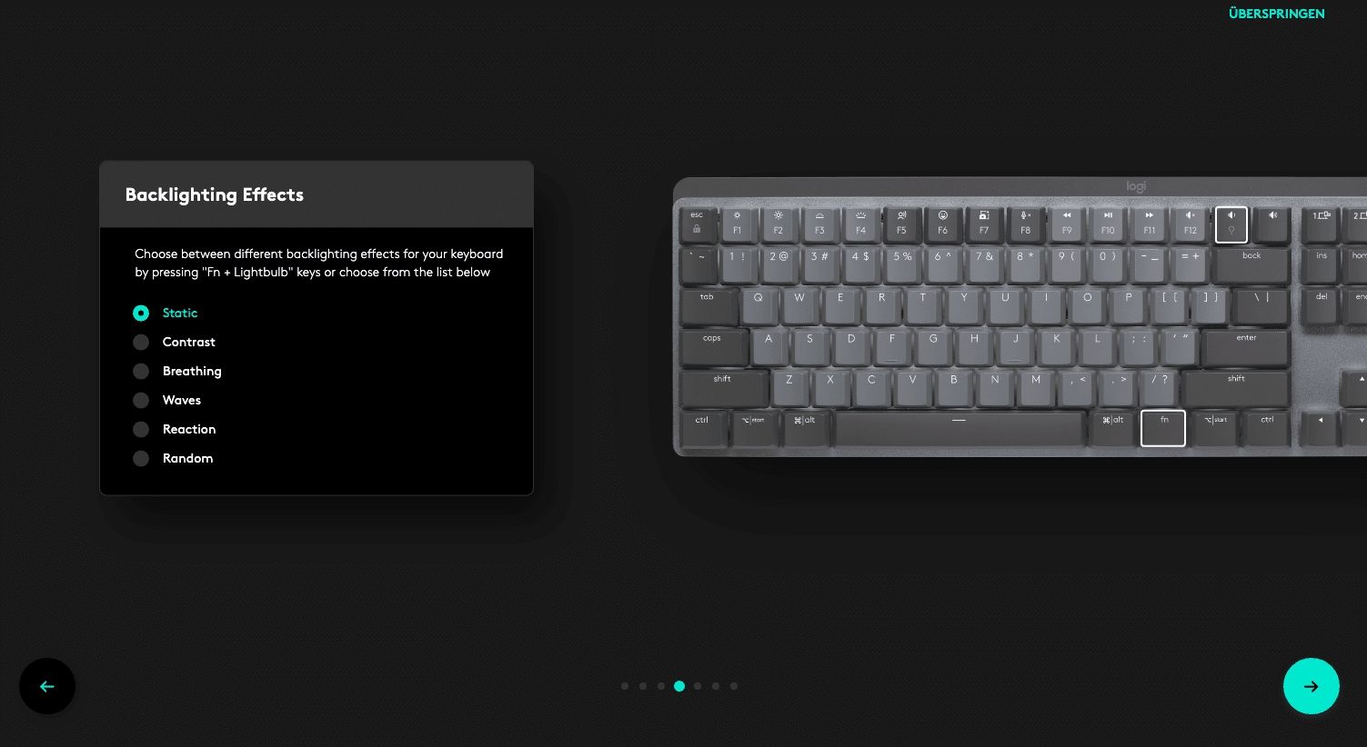 Per Tastenkombination können wir die Intensität der Beleuchtung in sieben Stufen feineinstellen, sowie zwischen den Effekten wechseln. Zudem reagiert die Beleuchtung intelligent und schaltet sich automatisch ein, wenn sich die Hand dem Keyboard nähert. Gleichzeitig passt sich die Helligkeit auf Wunsch automatisch den Lichtverhältnissen an.