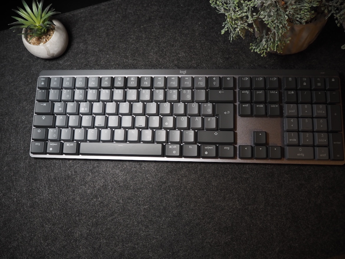 Im Falle der Logitech MX Mechanical bleiben allerdings keine Wünsche offen. Das Tippgefühl auf den minimal konkaven Tastenkappen geht äußerst angenehm und sehr präzise von der Hand. Zudem weisen die Tasten einen angenehmen Hubweg und Auslösepunkt auf und fallen groß genug aus, um Vertipper zu vermeiden.