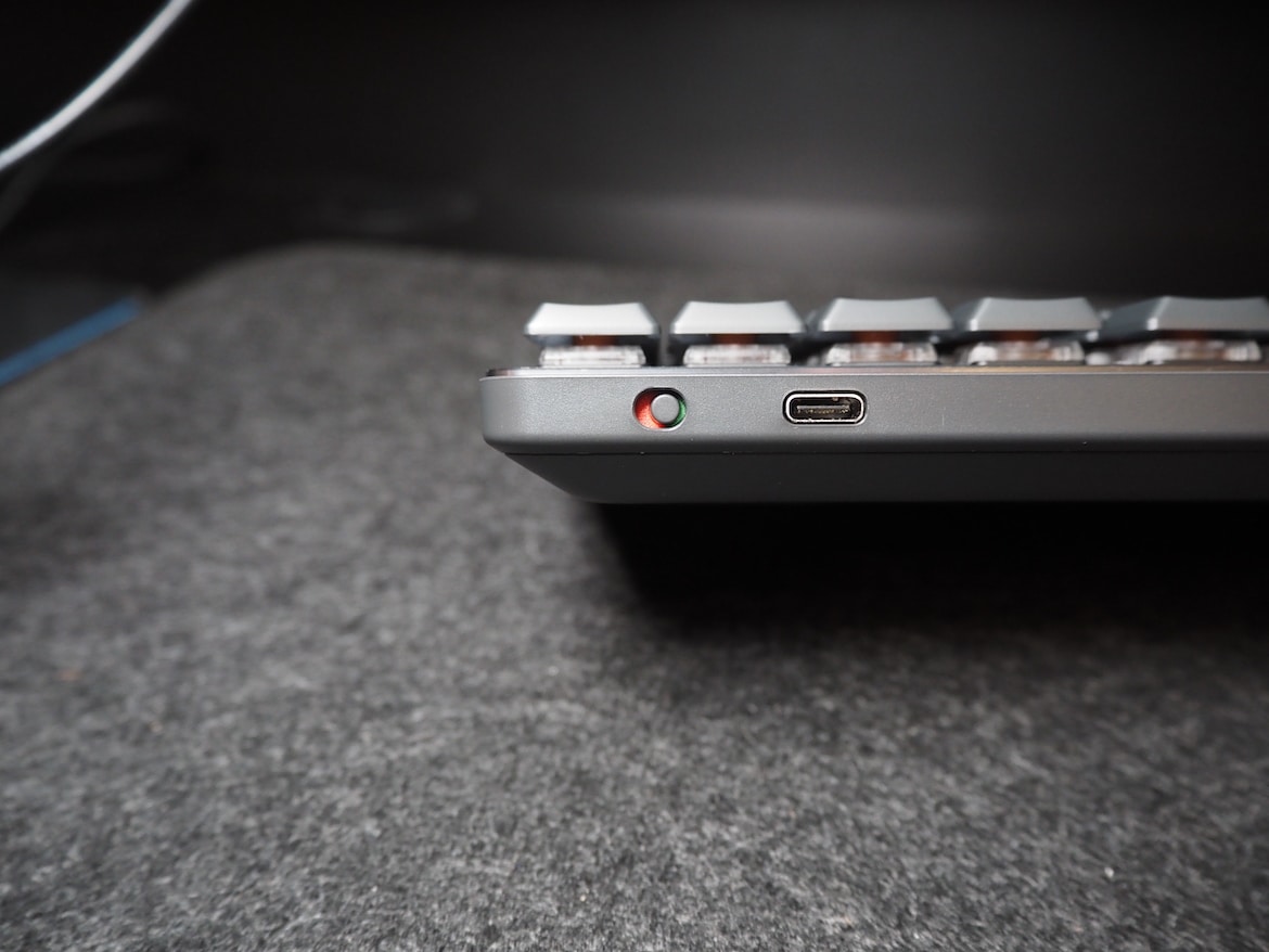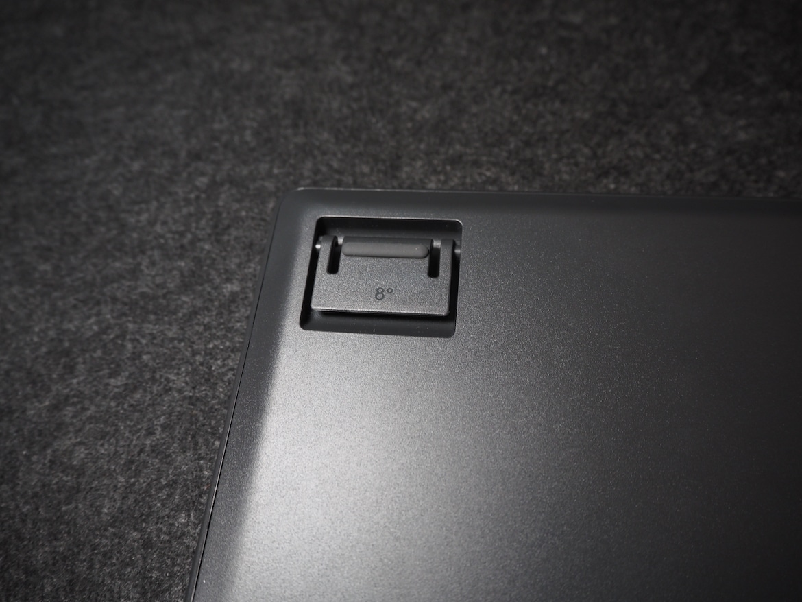 An der rechten oberen Ecke finden wir den USB-C-Port, an dem das Ladekabel angeschlossen wird, sowie den Ein- und Ausschalter. Die Unterseite hingegen offenbart einen großzügigen Gummistreifen am unteren Rand, sowie zwei Gummierungen auf den ausklappbaren Standfüßen, die für einen sicheren Halt sorgen sollen. Mithilfe der Füße lässt sich die Tastatur zudem im Winkel von 8 Grad einstellen.