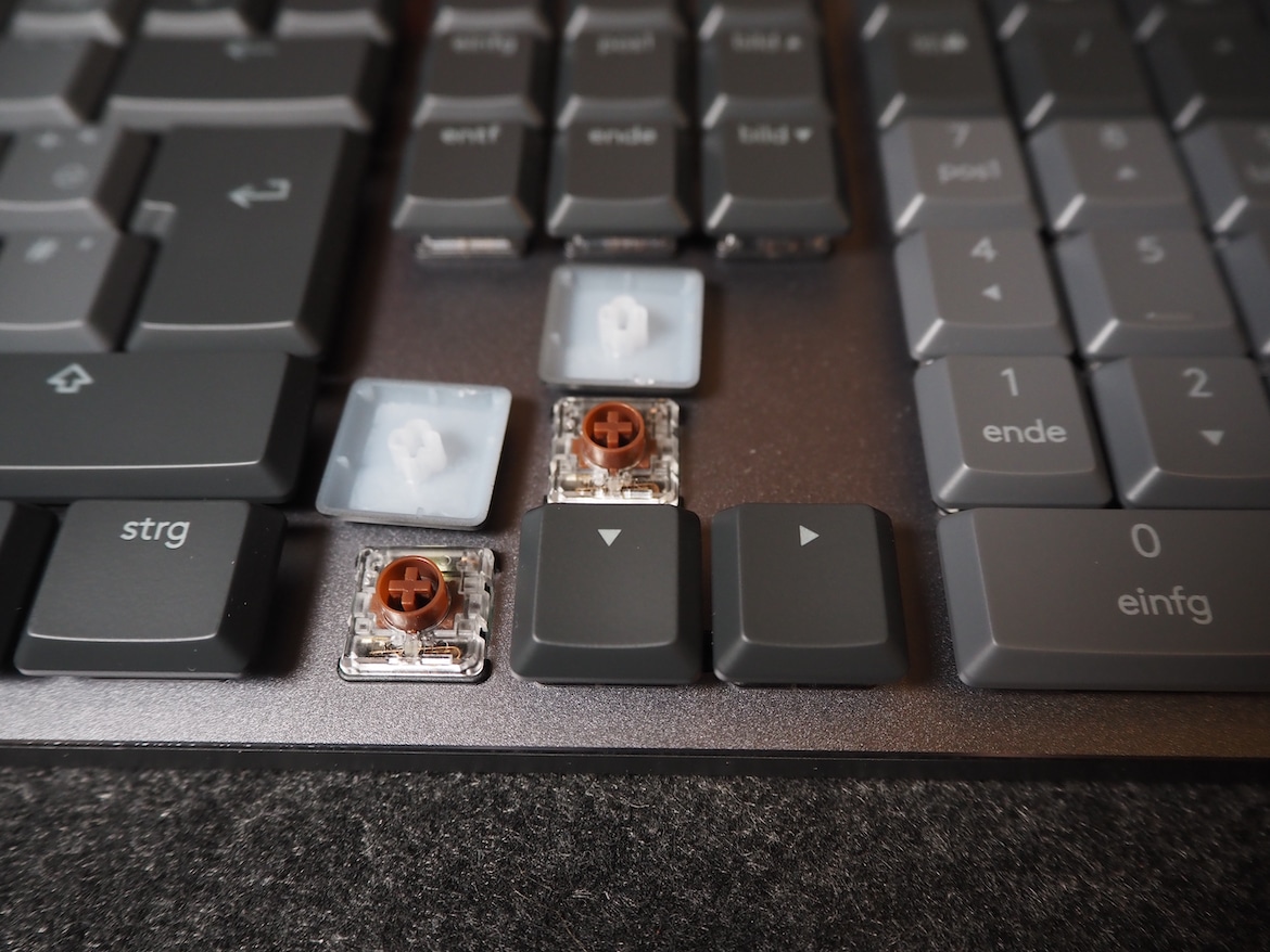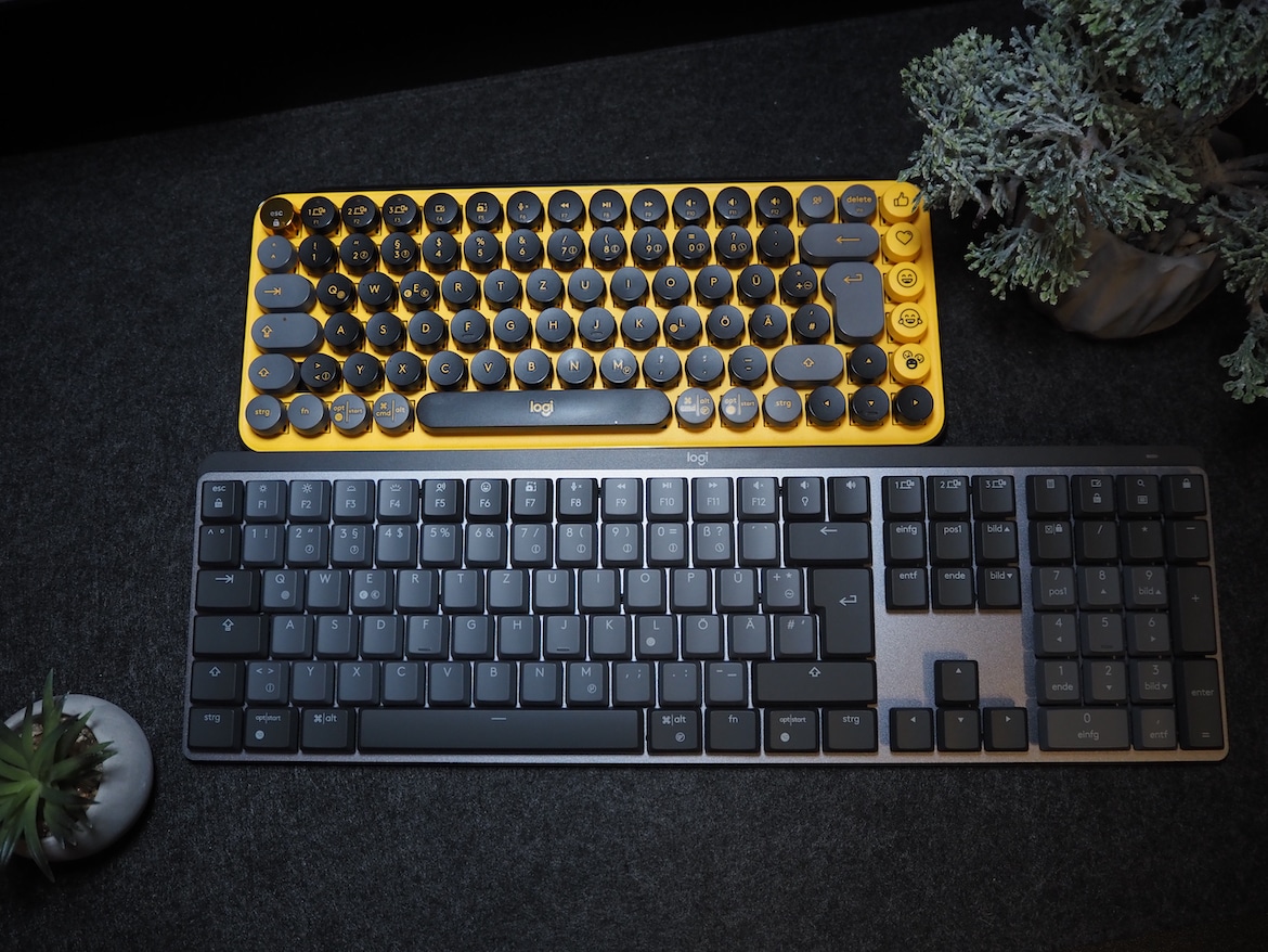 Im direkten Vergleich mit der POP Keys, die ebenfalls auf braune mechanische Schalter setzt, tippt es sich auf der MX Mechanical zudem sogar deutlich leiser und aufgrund der Form der Tasten auch ein Stück weit schneller – zumindest bilde ich mir das ein. Dafür fällt das taktile Feedback bei der POP besser aus.
