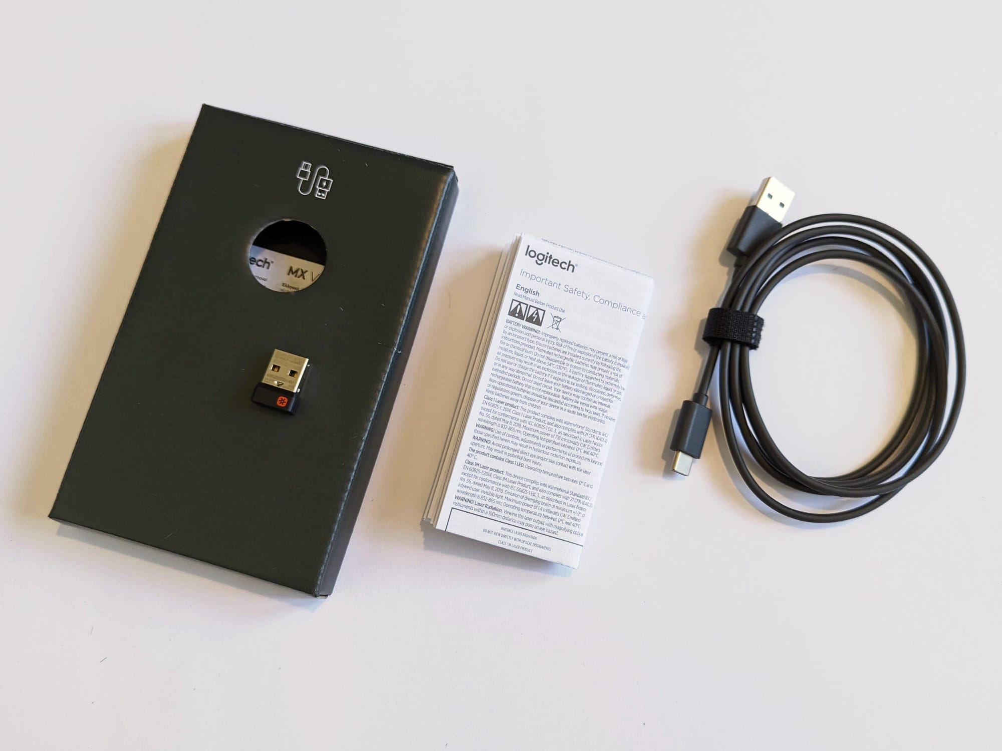 Im Inneren des Kartons finden wir neben der Vertikalmaus selbst, einen USB-Empfänger, ein USB-C-Ladekabel und eine Bedienungsanleitung. Da die Maus bereits seit 2018 erhältlich ist, handelt es sich hier um einen Unifying-Empfänger und nicht um den aktuellen Bolt-Empfänger. Dieser kann, wie auch bei den anderen Logitech-Mäusen mit fest verbautem Akku, nicht in der Maus verstaut werden. Der Lieferumfang enthält damit alles nötige und bietet keinerlei Überraschungen oder Besonderheiten.