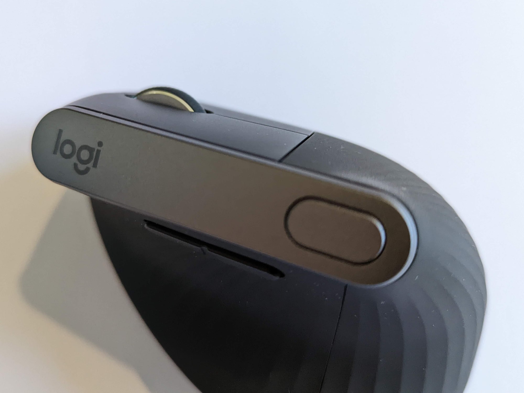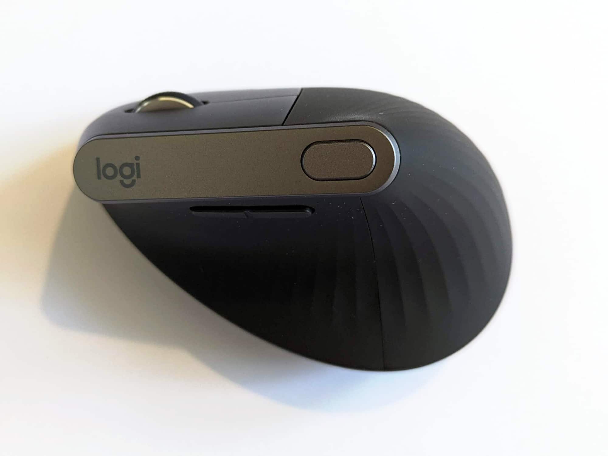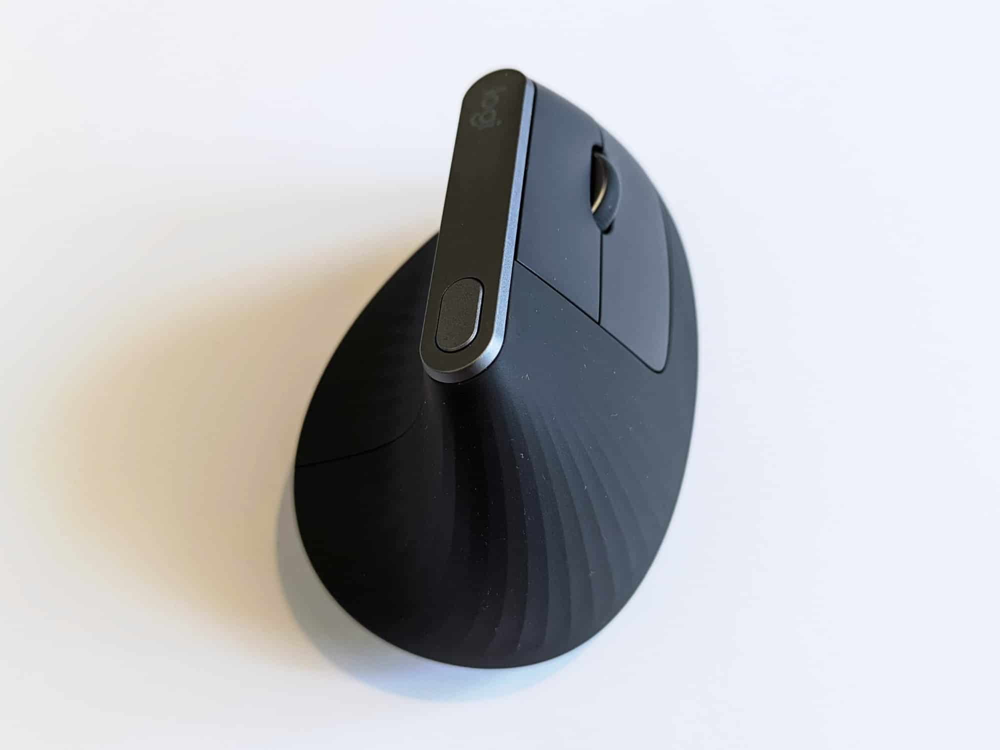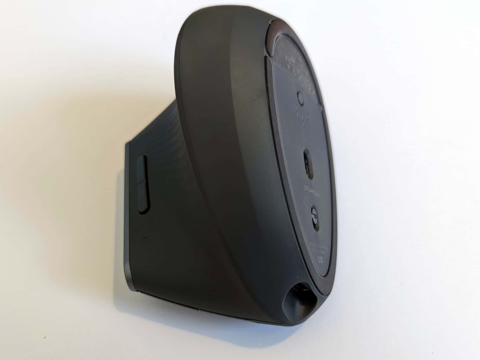 Die Vertikalmaus ist eher groß, sodass man problemlos die gesamte Hand auf ihr ablegen kann. Sie ist für Rechtshänder konzipiert und um 57° geneigt, ein Modell für Linkshänder existiert nicht. Durch die Neigung und die daraus resultierende schräge Haltung wird die Körperhaltung verbessert und die Belastung der Muskeln und des Handgelenks spürbar reduziert. Die Oberfläche der Maus ist gummiert und an der linken Seite sowie hinten leicht strukturiert. Die rillenförmige Struktur ähnelt der, der aktuellen MX Master-Modelle.