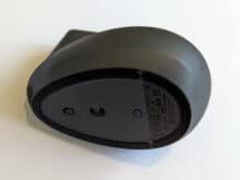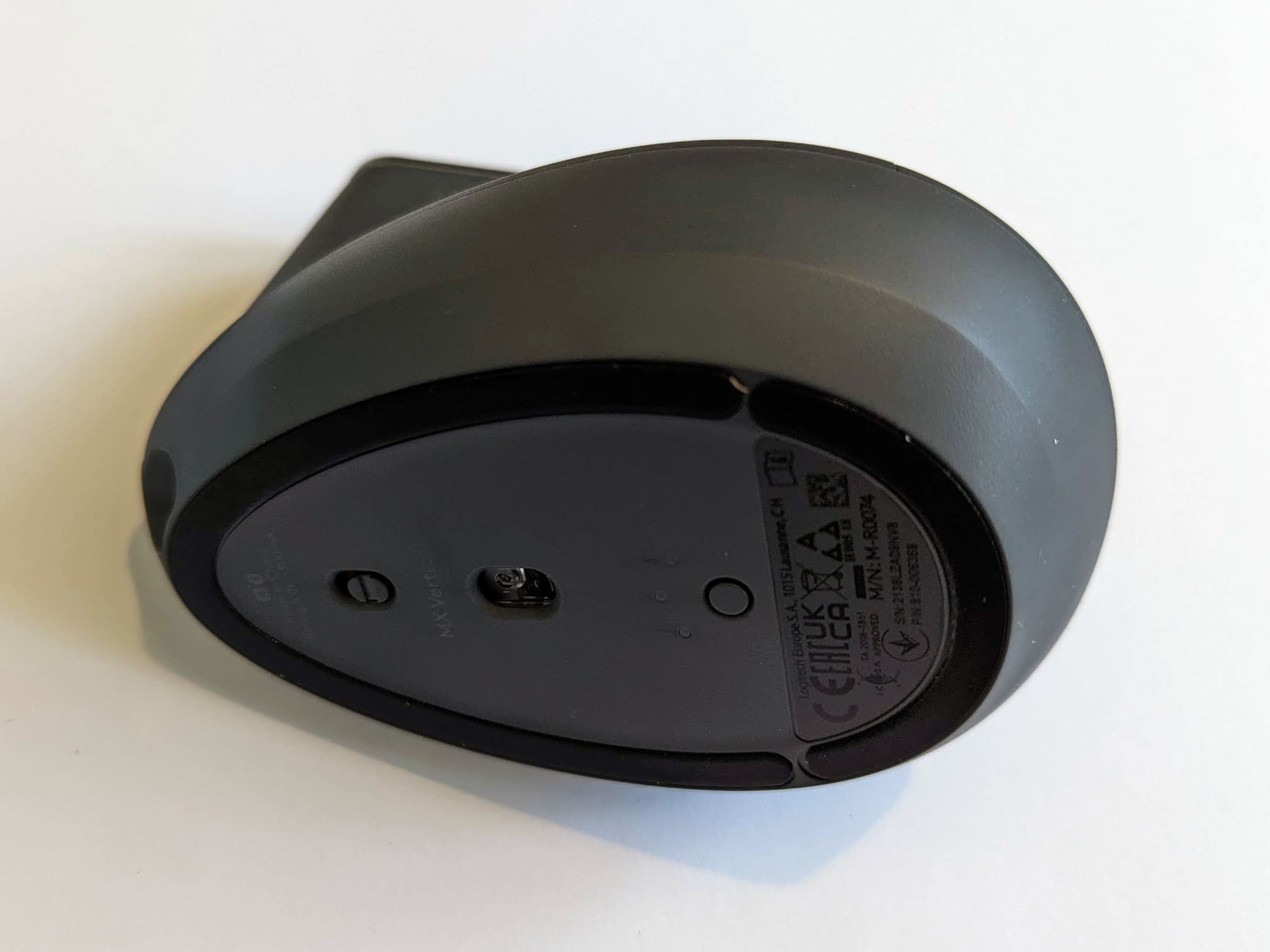 Auf der Unterseite der Maus befinden sich rundum Gleitfüße. Weiterhin sind dort der Ein- und Ausschalter, eine Taste zum Umschalten zwischen den bis zu drei möglichen Geräten plus eine LED-Anzeige, die die Nummer des gerade verbundenen Gerätes anzeigt. Mittig dazwischen ist der Sensor platziert.