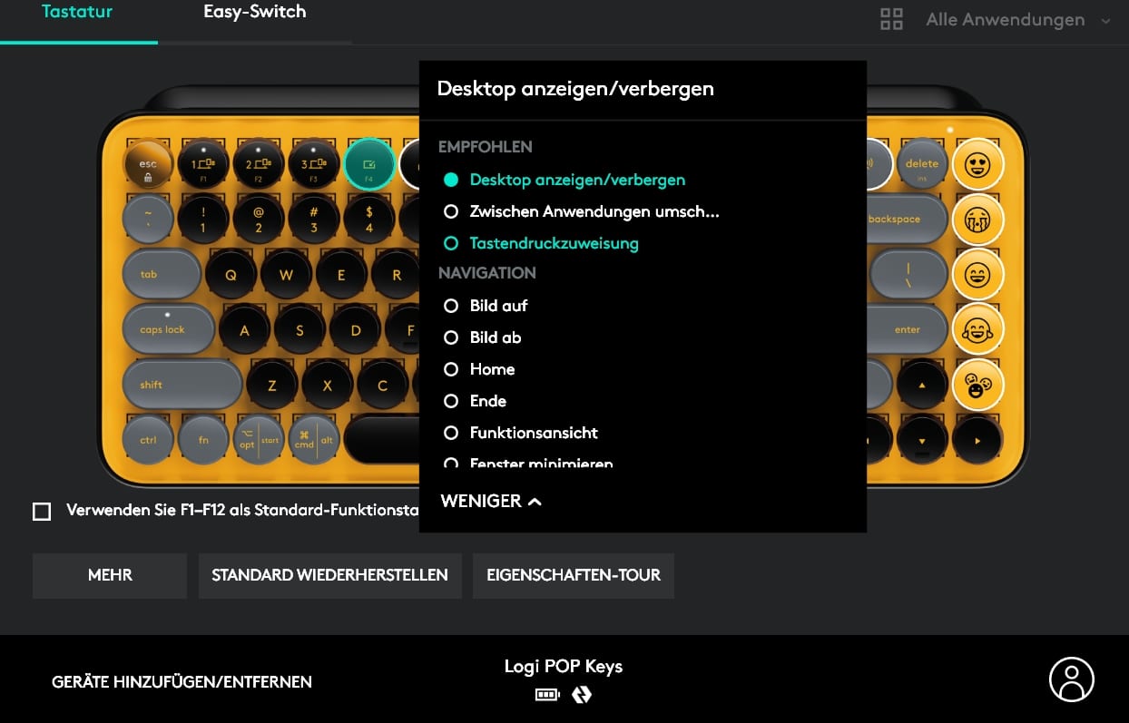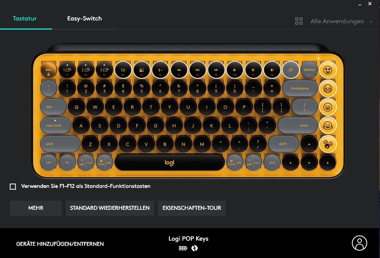 Im Reiter „Tastatur“ können wir die Funktionen der F- und Emoji-Tasten umbelegen, während der Reiter „Easy-Switch“ lediglich die gekoppelten Geräte anzeigt. Die Möglichkeit der Firmware-Aktualisierung rundet den Funktionsumfang ab. Makros oder ähnliche Einstellungen suchen wir vergebens.
