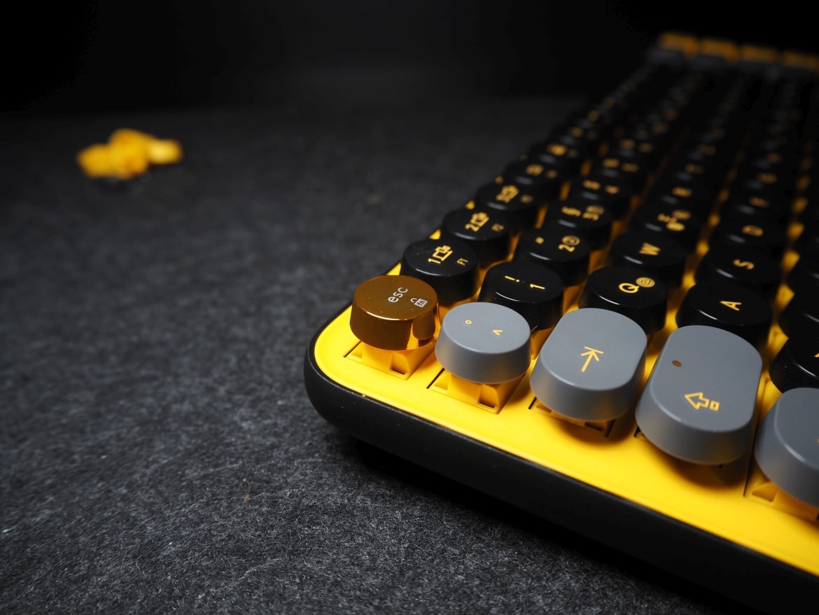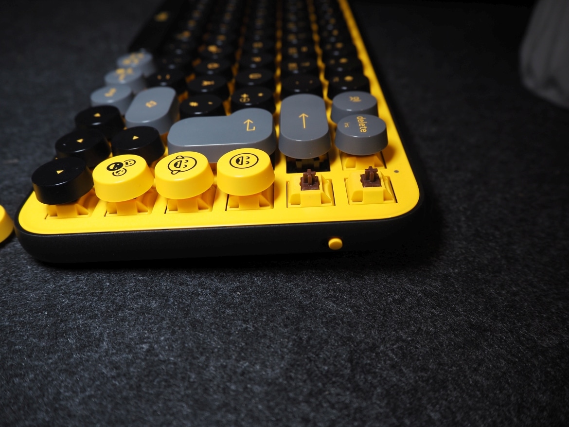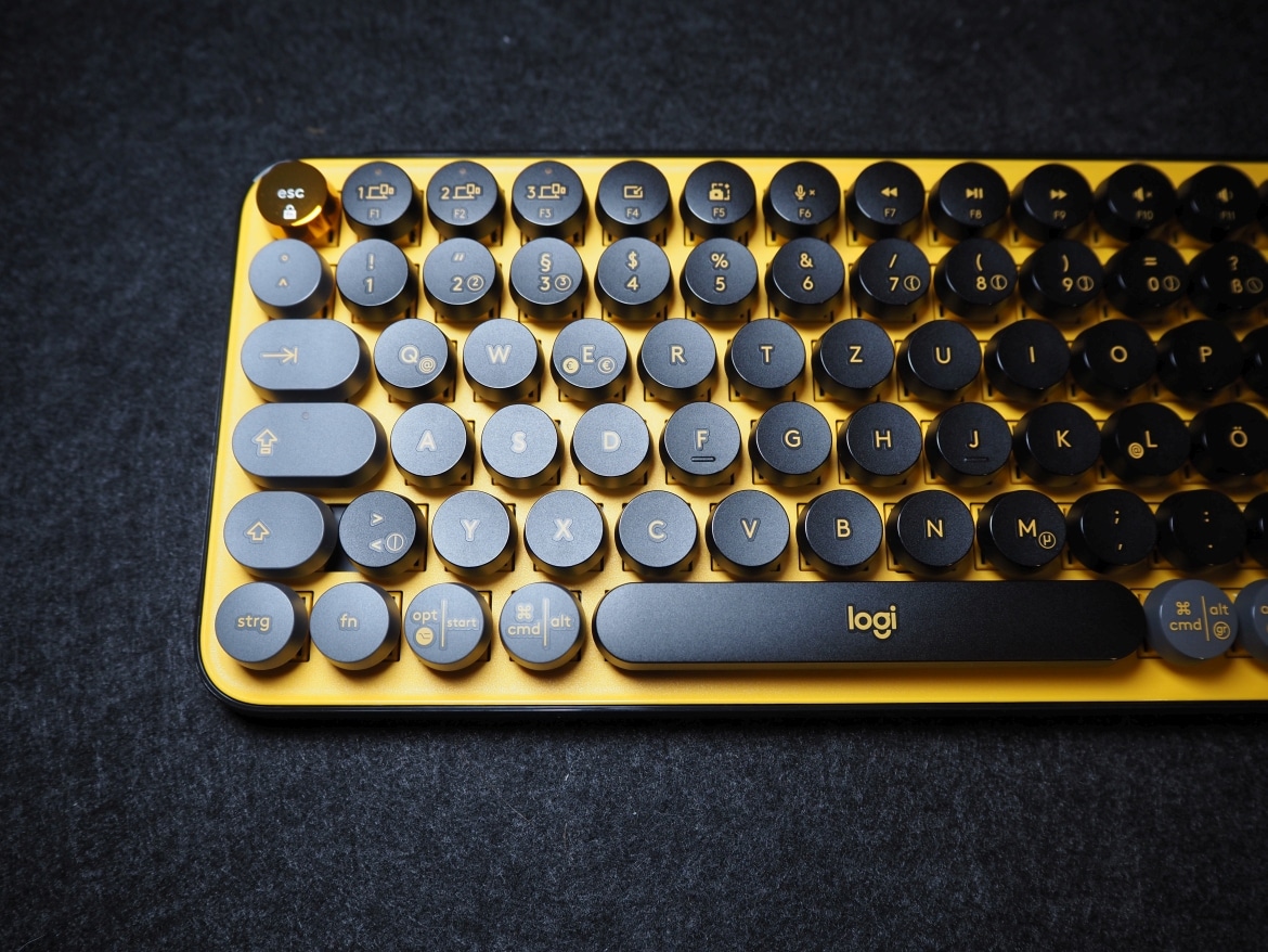 Darüber finden sich die gelb abgesetzten und schwarz bedruckten Emoji-Tasten. Fünf an der Zahl. Ein weiteres Alleinstellungsmerkmal des Keyboards, mit denen sich Logitech klar an die Generation TikTok richtet.