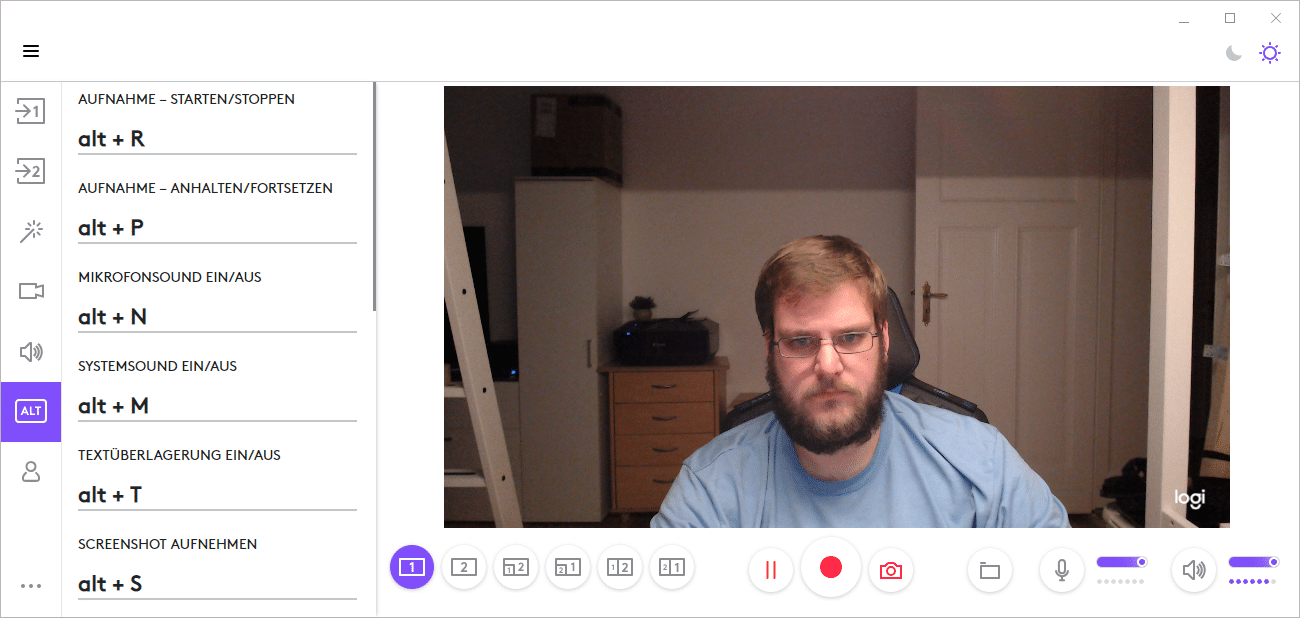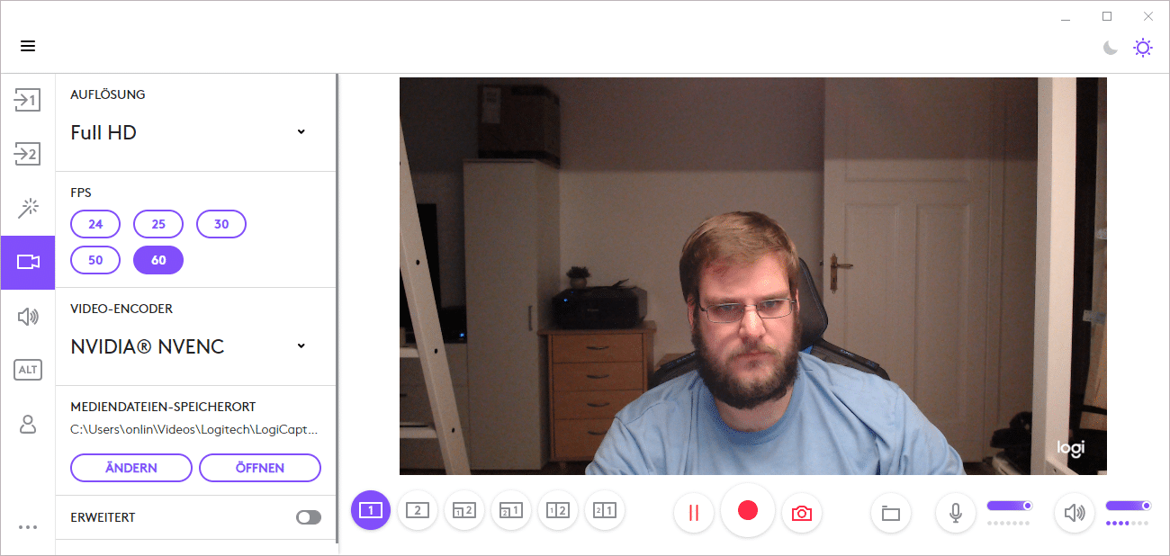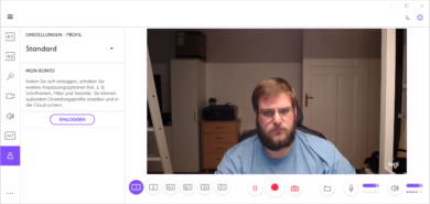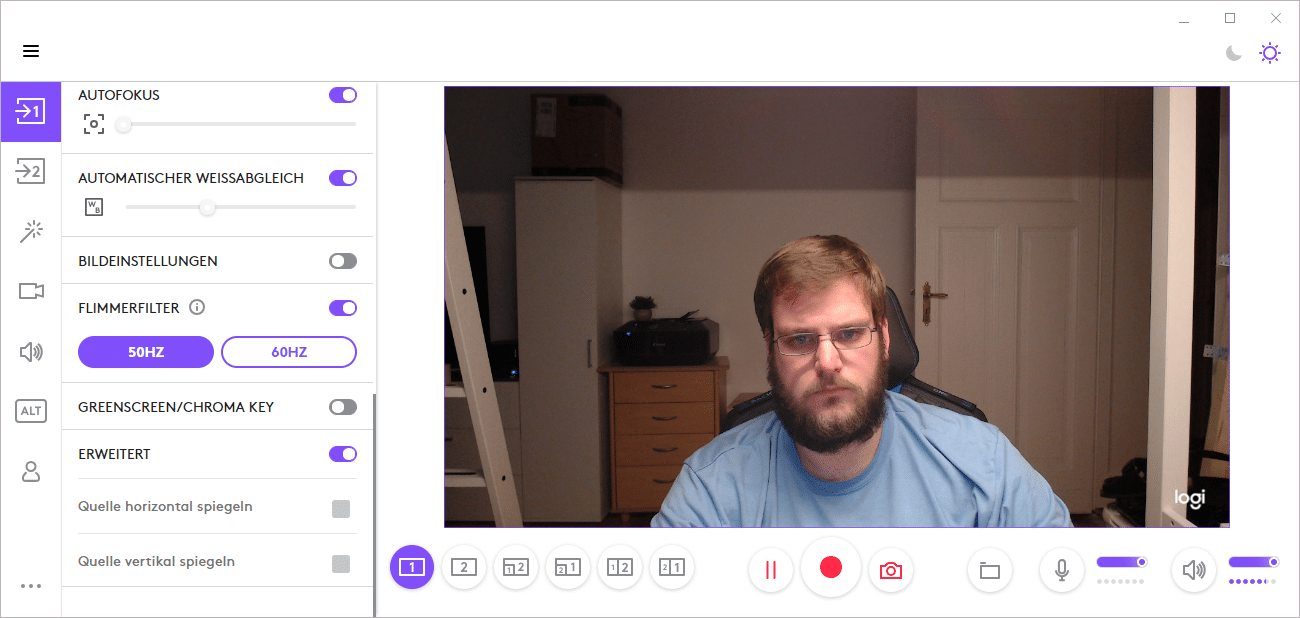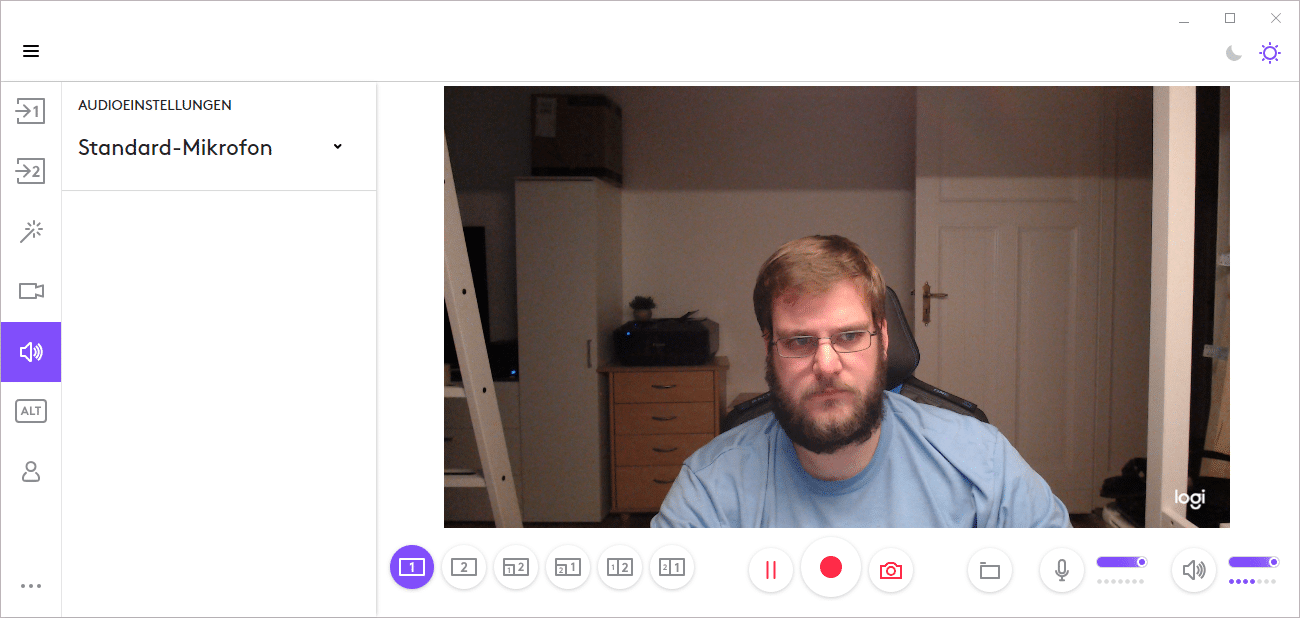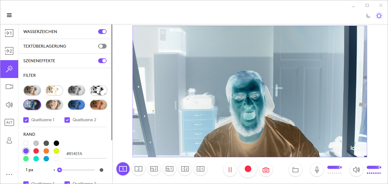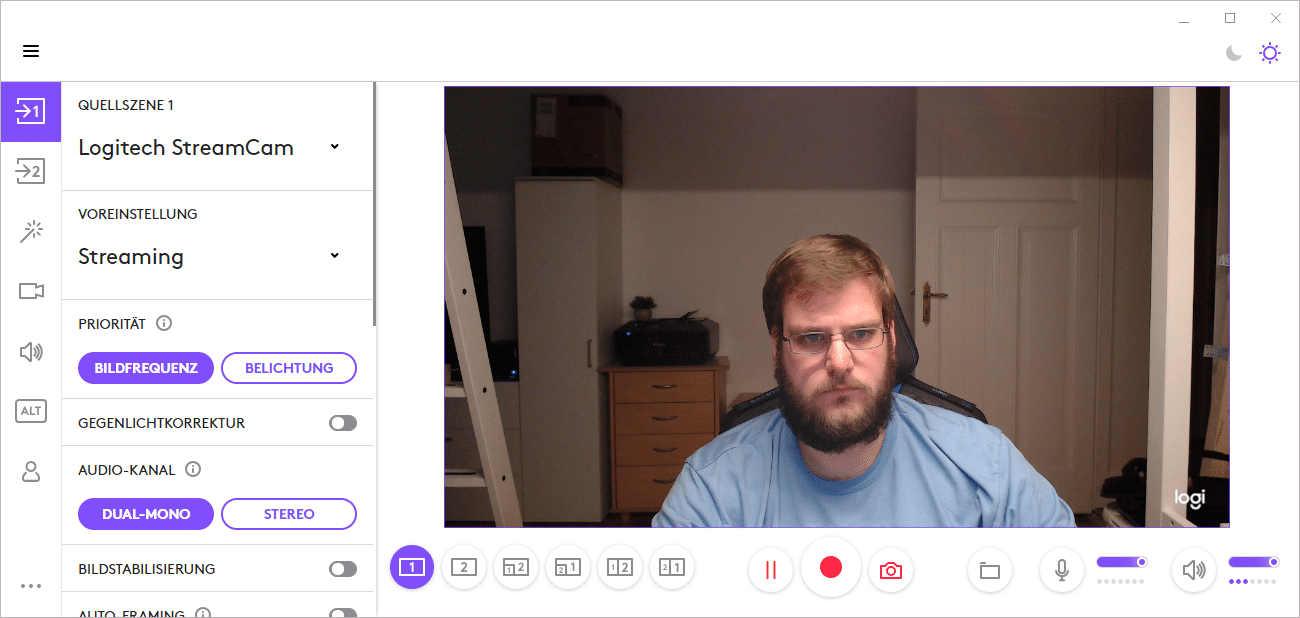 Hier können Nutzer diverse Einstellungen vornehmen. Logitech Capture bietet eine automatische Gesichtsverfolgung, elektronische Bildstabilisierung, (Auto-)Framing, Flimmerfilter, Gegenlichtkorrektur, automatischer Weißabgleich, Chroma Keying für blaue und grüne Hintergründe sowie bunte Rahmen, Texteinblendungen und Szeneneffekte. Auch eine zweite Aufnahmequelle kann definiert werden und es gibt verschiedene Szenenkonstellationen. Es ist also schon ziemlich viel mit der Software möglich.