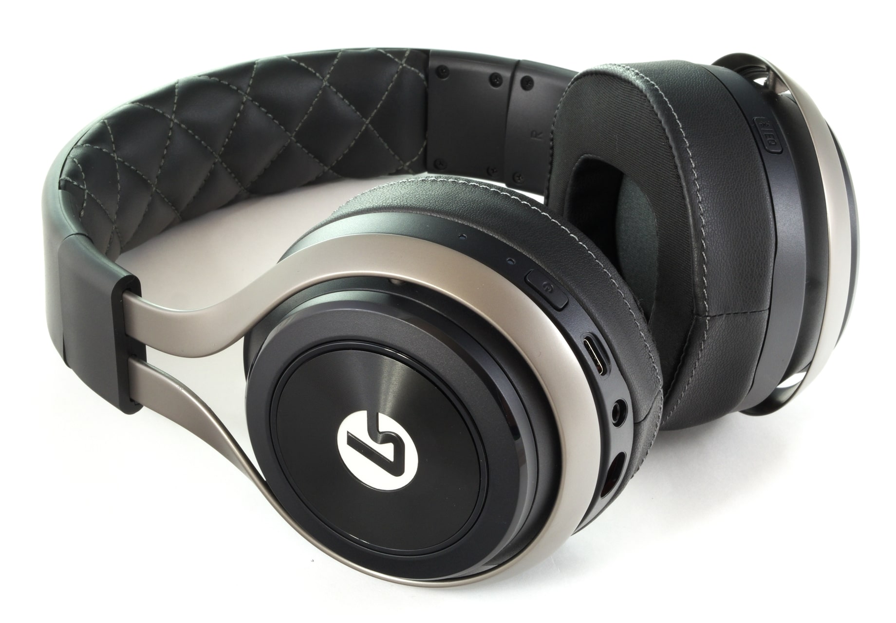 In den Ohrmuscheln selbst befindet sich die verbaute Elektronik, also unter anderem der Akku und die Bluetooth-Empfänger. Zudem beherbergen die Ohrmuscheln auch die Bedienelement und Anschlüsse: Links gibt es zwei Signal-LEDs, einen USB-C-Ladeanschluss, eine vierpolige Klinkenbuchse, eine Buchse für das ansteckbare Mikrofon und den An-Schalter.