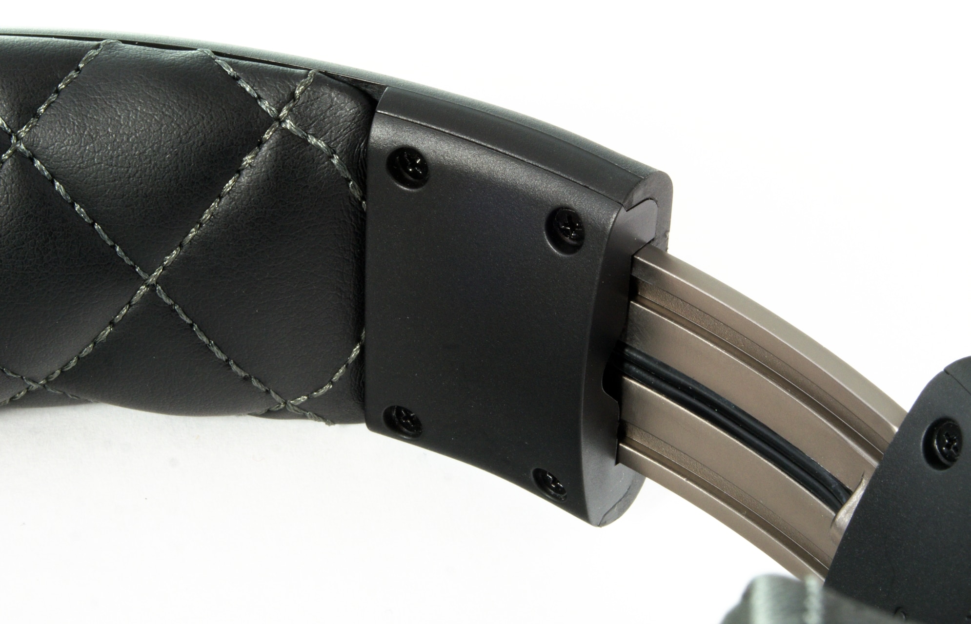 Auch am Kopfbügel kommt, in diesem Fall gestepptes, Kunstleder zum Einsatz. Abseits der Polsterung setzt LucidSound hier hingegen auf schwarzen Kunststoff, der auch für die Umschaltung der Ohrmuscheln verwendet wird.