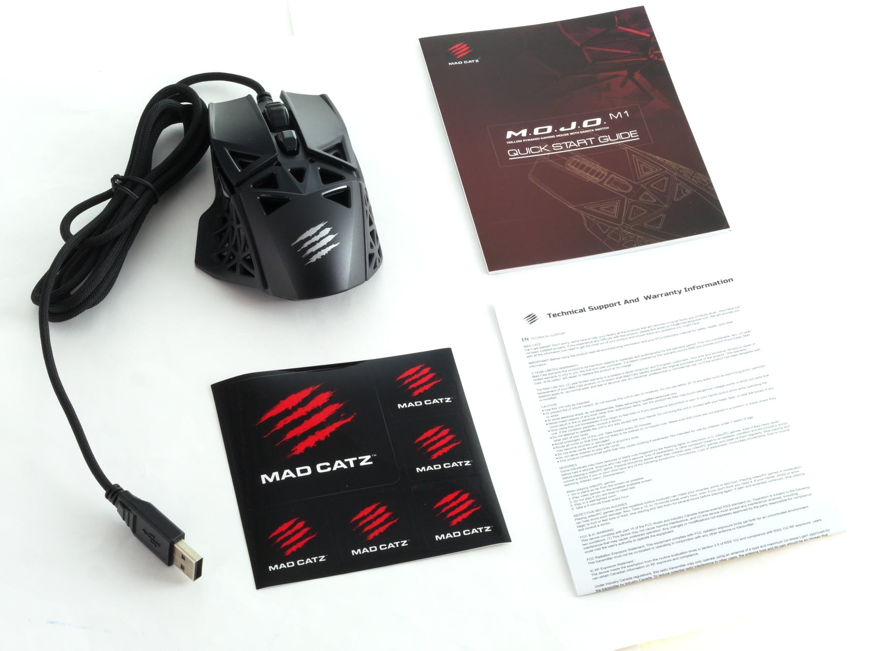 Beim Zubehör beschränkt sich Mad Catz bei der M.O.J.O. M1 auf eine kurze Anleitung, einen Zettel mit Garantieinformationen und insgesamt sechs Aufkleber mit dem Herstellerlogo. Damit ist die Maus auf einem Niveau mit vielen Konkurrenzprodukten, denn Abseits von gelegentlich anzutreffenden Austauschelementen oder Zusatzgewichten, die hier komplett fehl am Platz wären, ist weiteres Zubehör bei Mäusen nur selten anzutreffen.