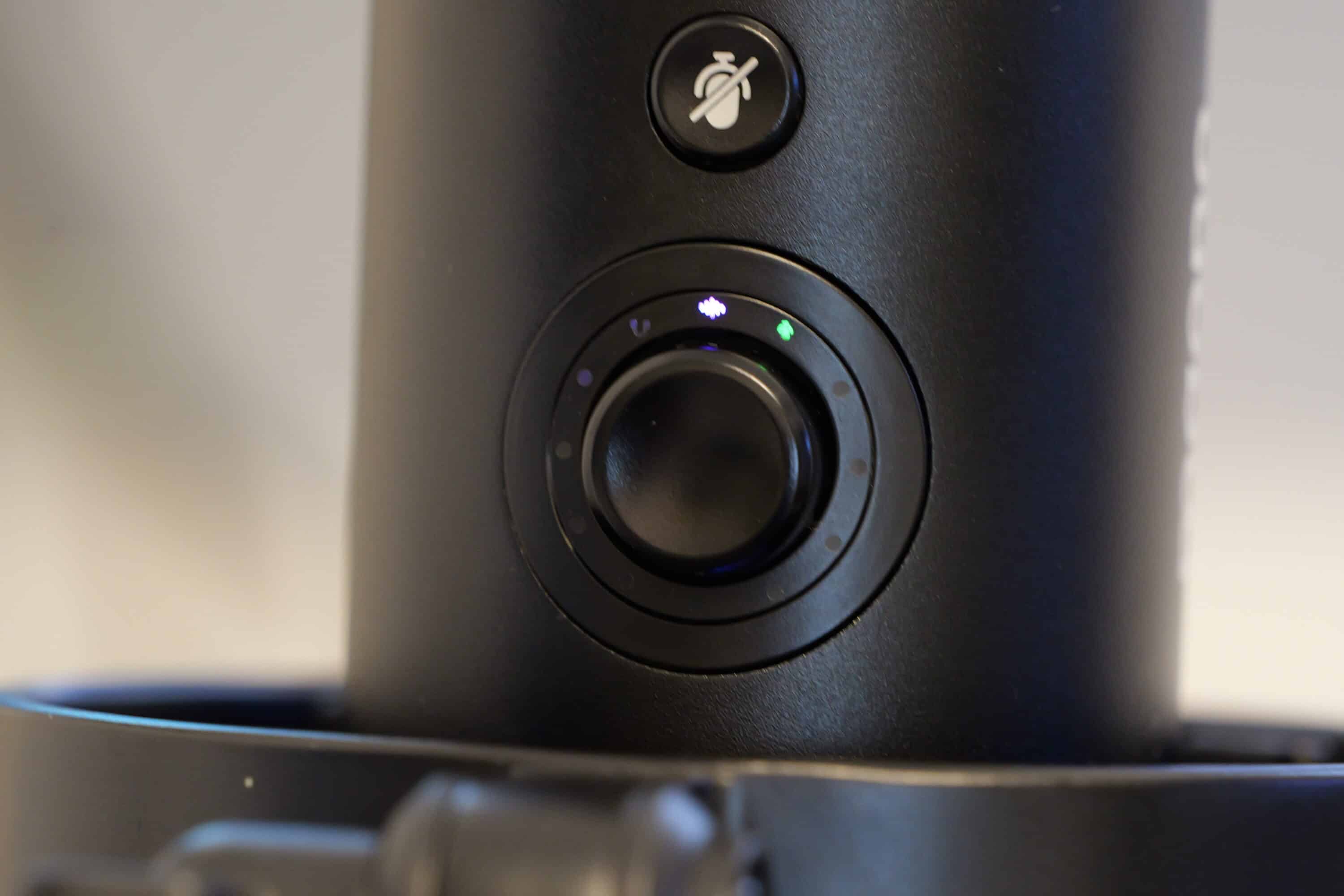 Per Klick könnt ihr zwischen den verschiedenen Modi auswählen. Standardmäßig reguliert ihr die Lautstärke (Gain), was durch weiße LEDs angezeigt wird. Der zweite Modus passt die Kopfhörer-Lautstärke an (blaue LEDs), sofern ihr einen Kopfhörer direkt am Mikrofon angeschlossen habt. Der dritte Modus hingegen reguliert das Monitor-Mixing. Hier könnt ihr anpassen, wie sich Mikrofon-Abhörgeräusch und PC-Sound hinsichtlich der Lautstärke zueinander verhalten sollen.