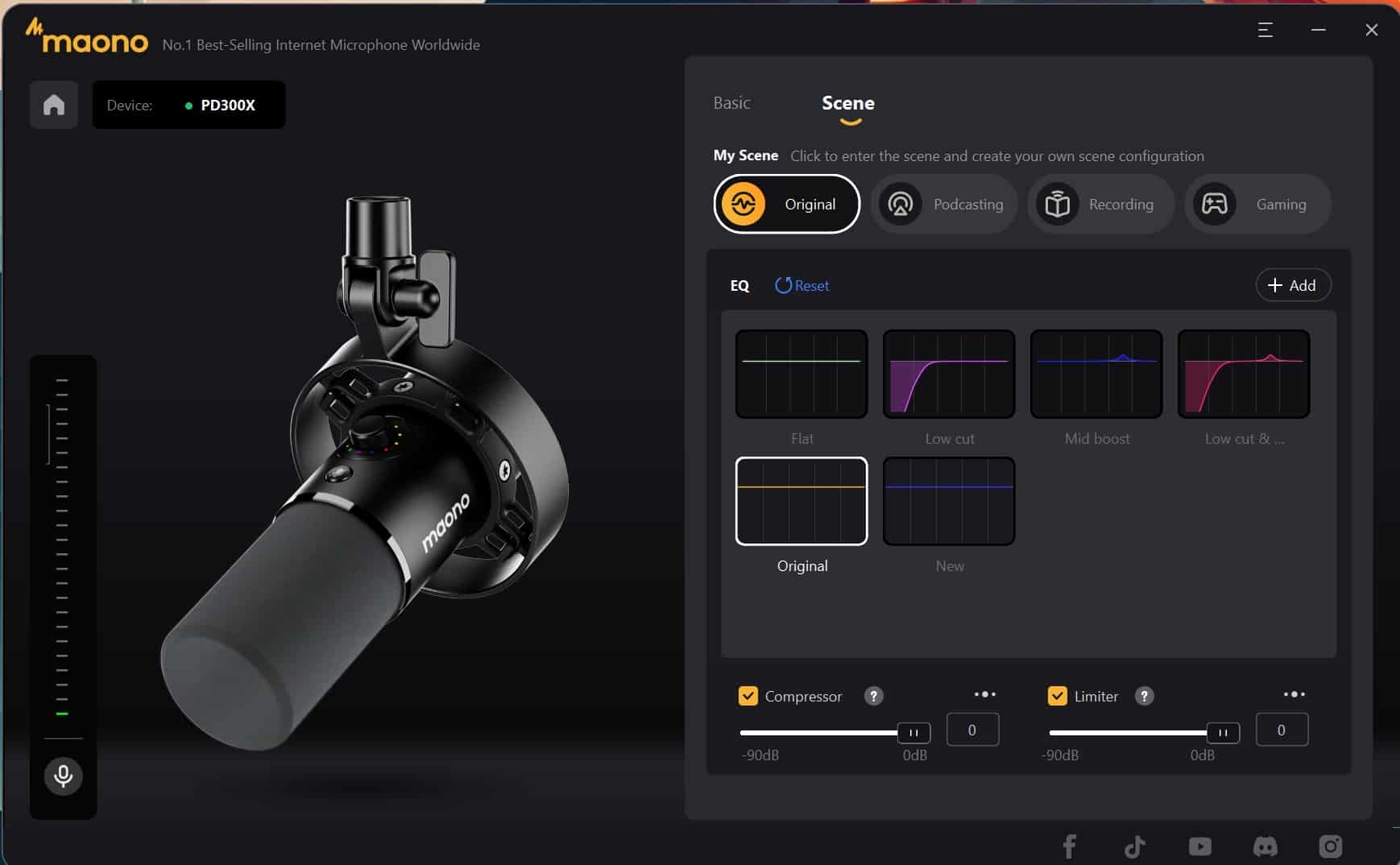 Neben vier verschiedenen Equalizer-Profilen könnt ihr zwischen dedizierten Einstellungen für Podcasting, Recording und Gaming wählen. Darüber hinaus lassen sich Kompressor und/oder Limiter hinzufügen und sogar ganz eigene EQ-Prests zusammenschustern. Zudem könnt ihr ein Noise Gate hinzufügen (zwischen -90 dB und 0 dB) und so unerwünschte Nebengeräusch reduzieren.